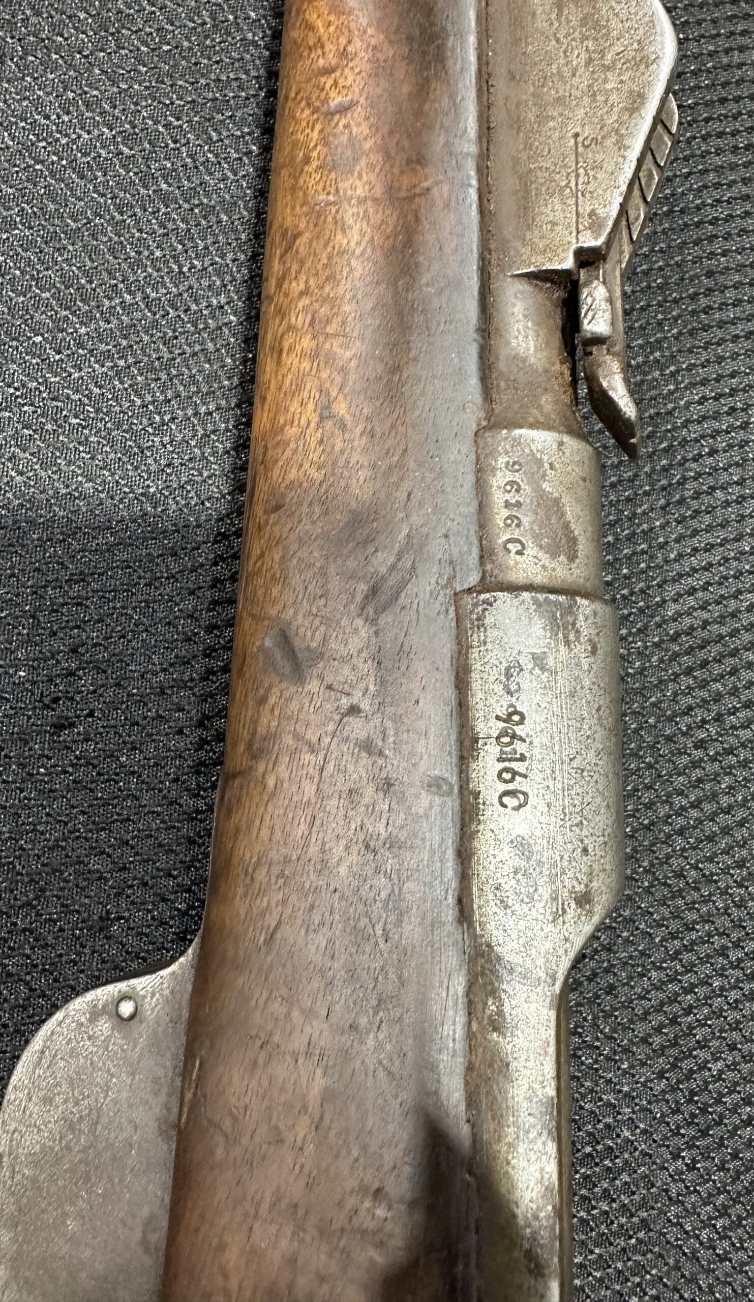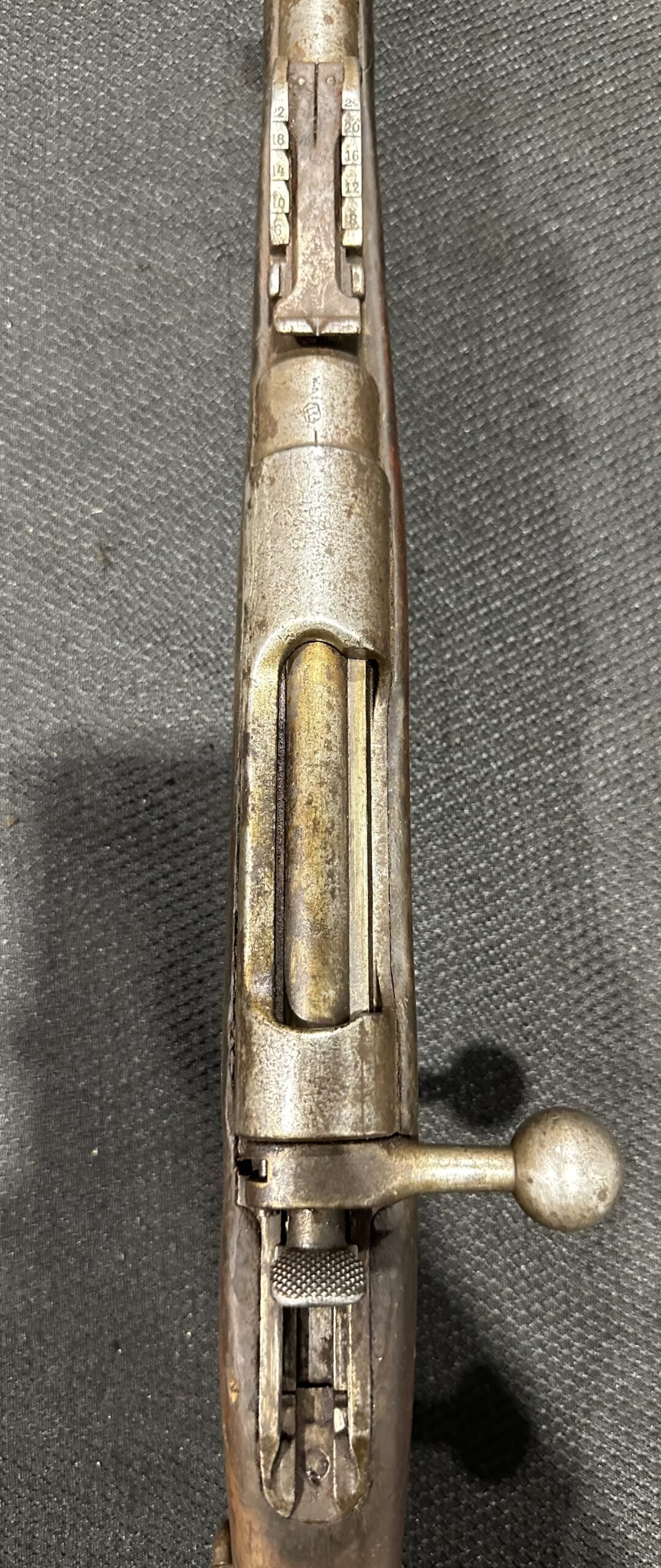 This carbine is in fair condition, with typical wear found on rifles from Ethiopia. The bore is in fair condition. The finish shows some rust and pitting. The wood is in good condition, with handling wear, dings, and scratches from typical use. Please note that the lower handguard is chipped on the right side near the barrel. The rifle is missing the front sight and safety.