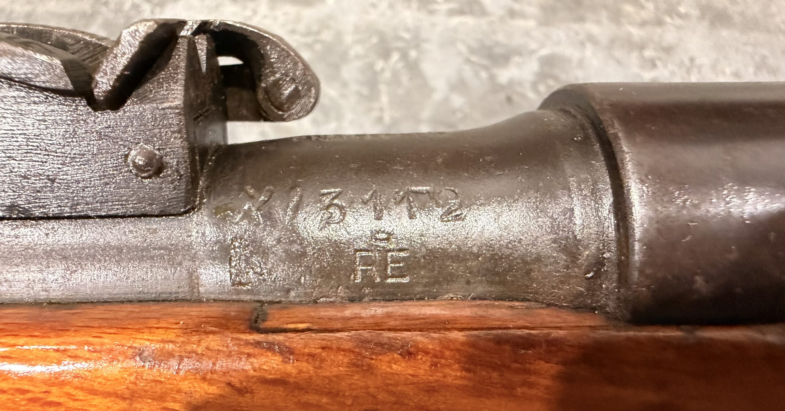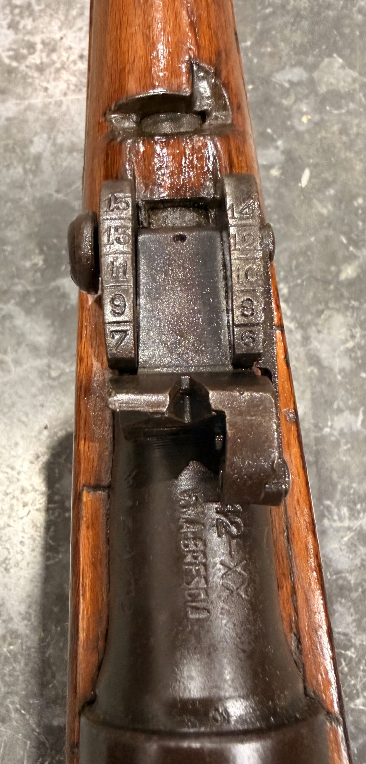 • Wood stock: Good condition with typical handling wear, including dings and scratches. Please note that there are repaired areas on the stock from where a grenade launcher was previously mounted. There is also a small crack on the right side of the stock near the bolt.