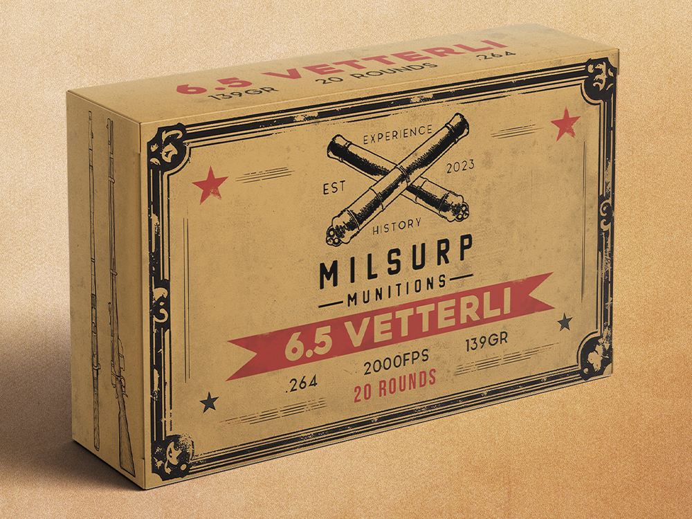 New factory-loaded 6.5×52mm Carcano ammunition (Reduced Vetterli-Safe Load), featuring a .268 full-metal-jacket boat-tail (FMJBT) at 139 grains. Each box contains 20 rounds of highly accurate ammo for your Vetterli.