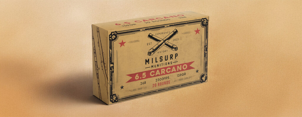 New factory-loaded 6.5×52mm Carcano ammunition, featuring a .268 full-metal-jacket boat-tail (FMJBT) at 139 grains. Each box contains 20 rounds of highly accurate ammo for your Carcano.
