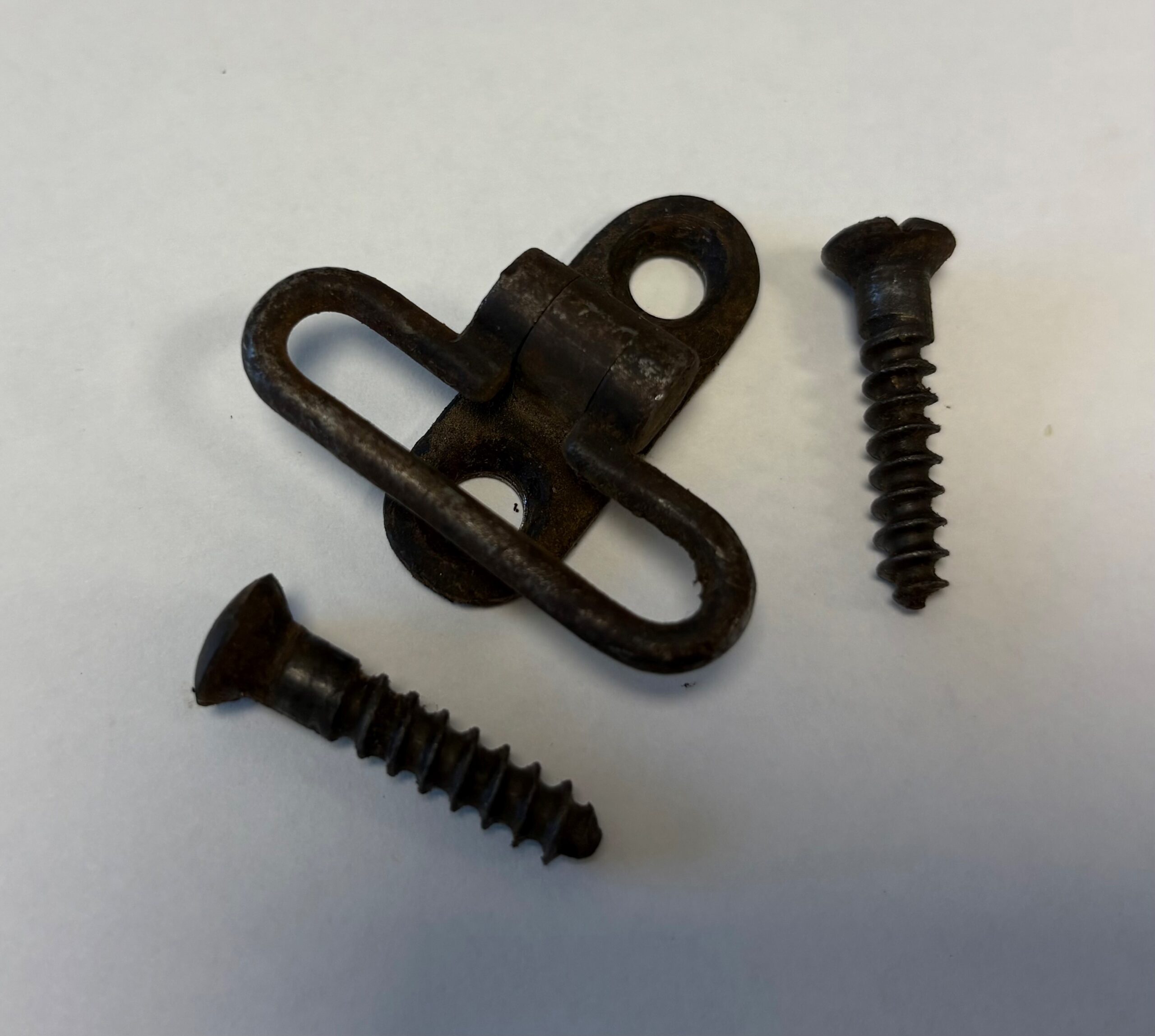 Original rear sling swivel for the Italian Vetterli 1870/87/15 rifle (6.5mm Carcano conversion). Shows typical patina from age, with some rust and pitting present. Solid overall condition for its age—ideal for restoration projects or replacing missing parts. Sold as-is—please ensure compatibility before purchase.