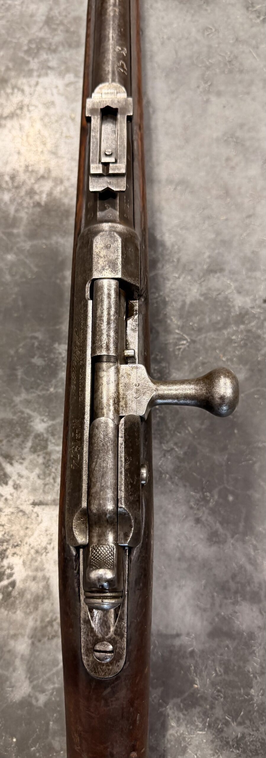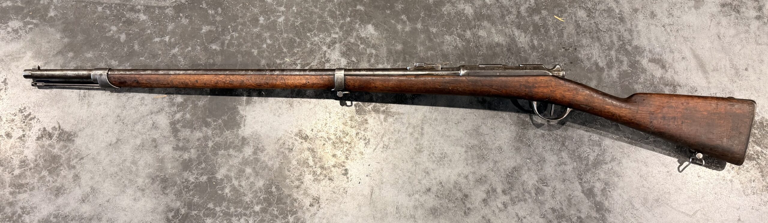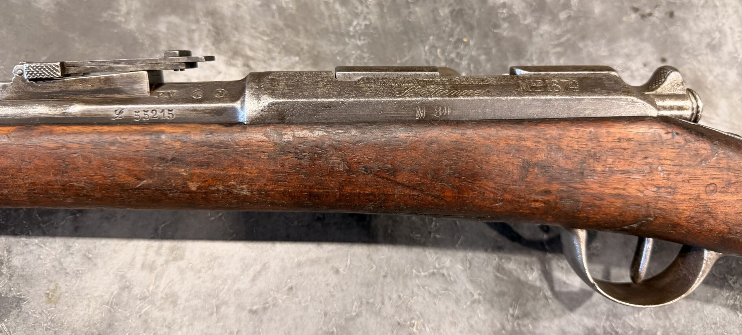 Antique 1874 Gras Rifle, Serial Number L55215, chambered in 11mm Gras, with a non-matching bolt. The finish on this rifle is original. The bore is in fair to good condition with strong rifling but requires additional cleaning. The wood stock is in good condition and shows handling wear, including dings and scratches consistent with typical use.