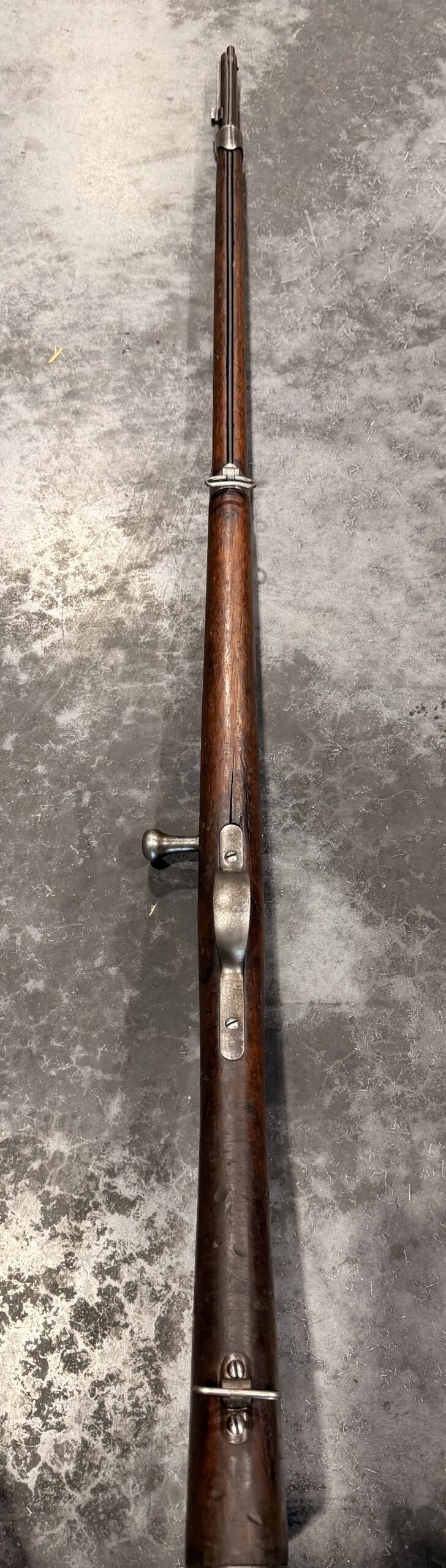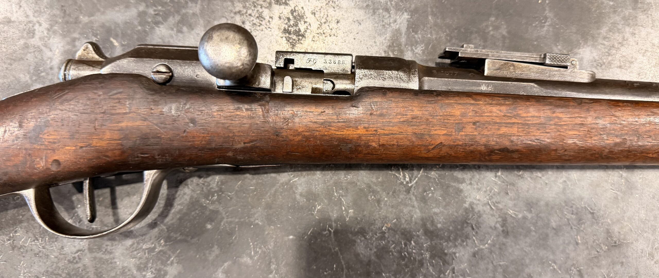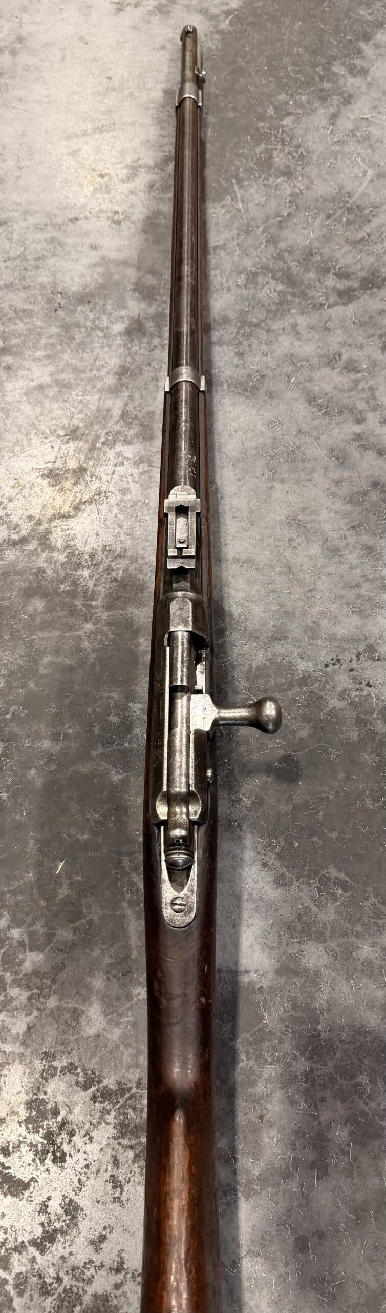 Antique 1874 Gras Rifle, Serial Number L55215, chambered in 11mm Gras, with a non-matching bolt. The finish on this rifle is original. The bore is in fair to good condition with strong rifling but requires additional cleaning. The wood stock is in good condition and shows handling wear, including dings and scratches consistent with typical use.