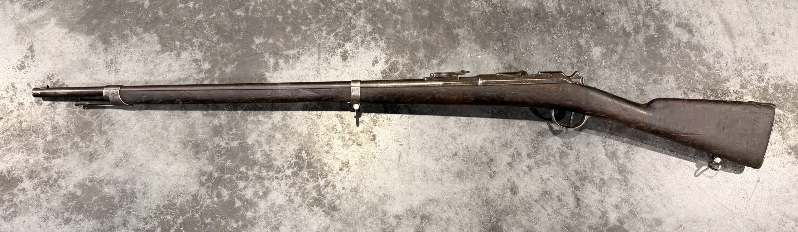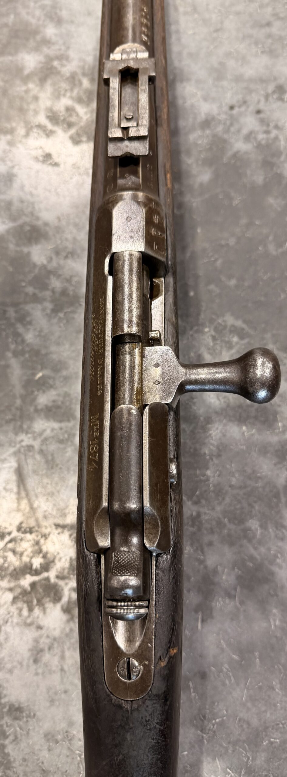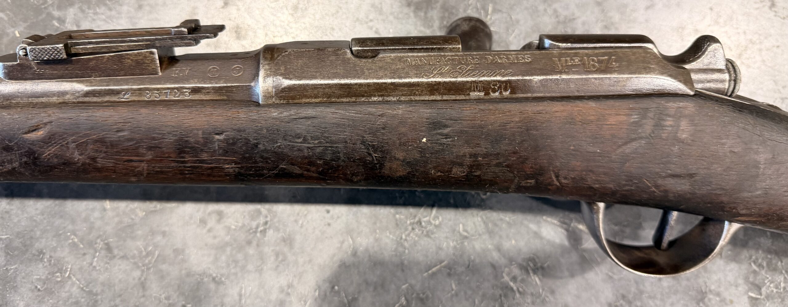 Antique 1874 Gras Rifle, Serial Number L85723, chambered in 11mm Gras, with matching bolt. The rear sight is complete and functional. It was manufactured in 1878 by St. Etienne. The finish on this rifle is original. The bore is in fait to good condition with strong rifling. The wood stock is in good condition and displays handling wear, including dings and scratches consistent with typical use.