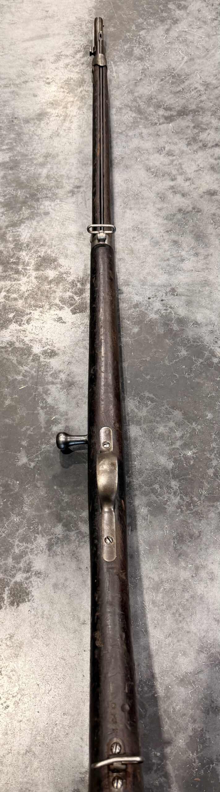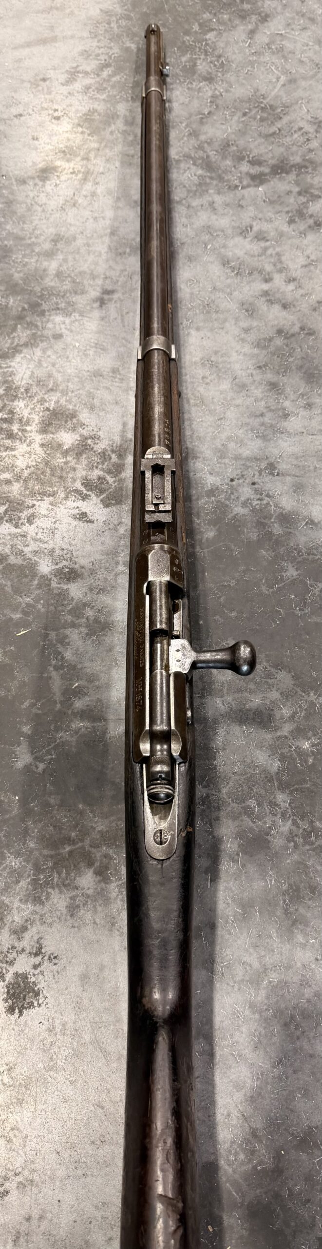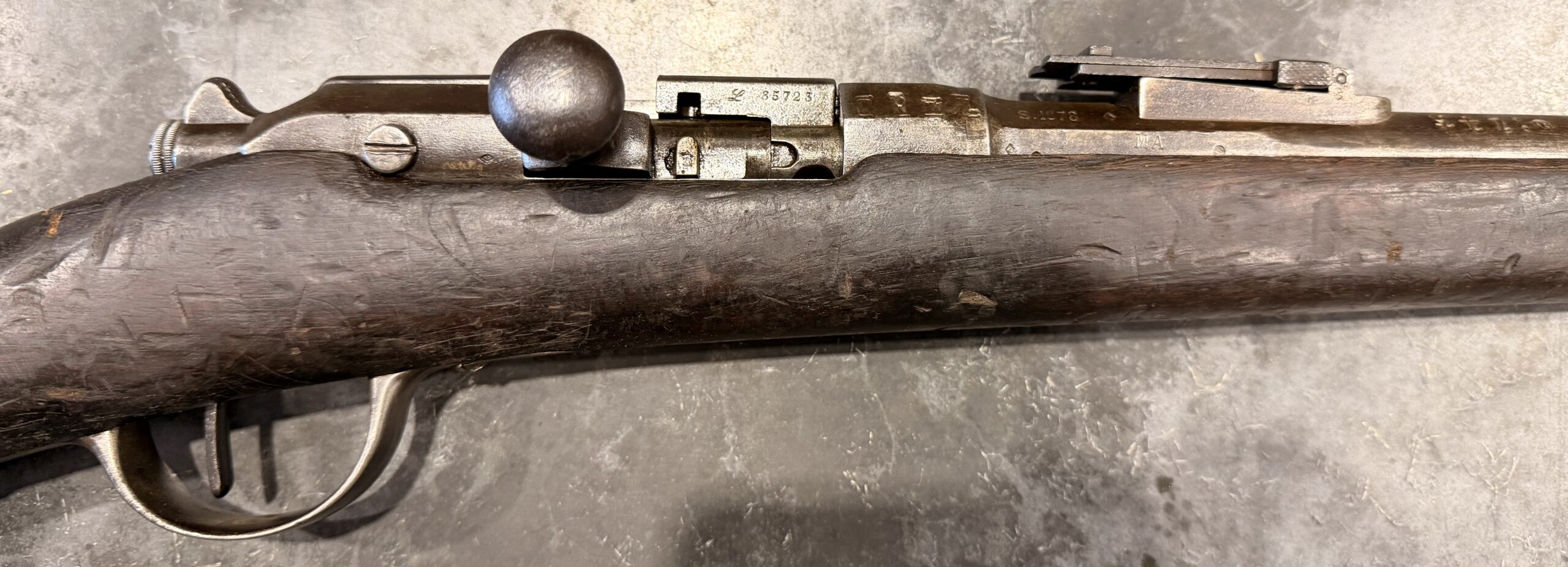 Antique 1874 Gras Rifle, Serial Number L85723, chambered in 11mm Gras, with matching bolt. The rear sight is complete and functional. It was manufactured in 1878 by St. Etienne. The finish on this rifle is original. The bore is in fait to good condition with strong rifling. The wood stock is in good condition and displays handling wear, including dings and scratches consistent with typical use.