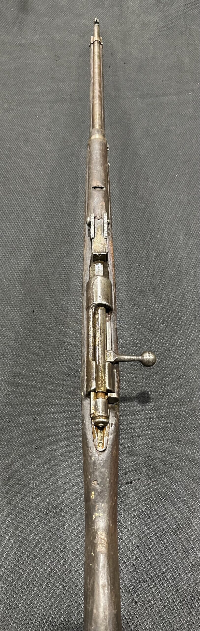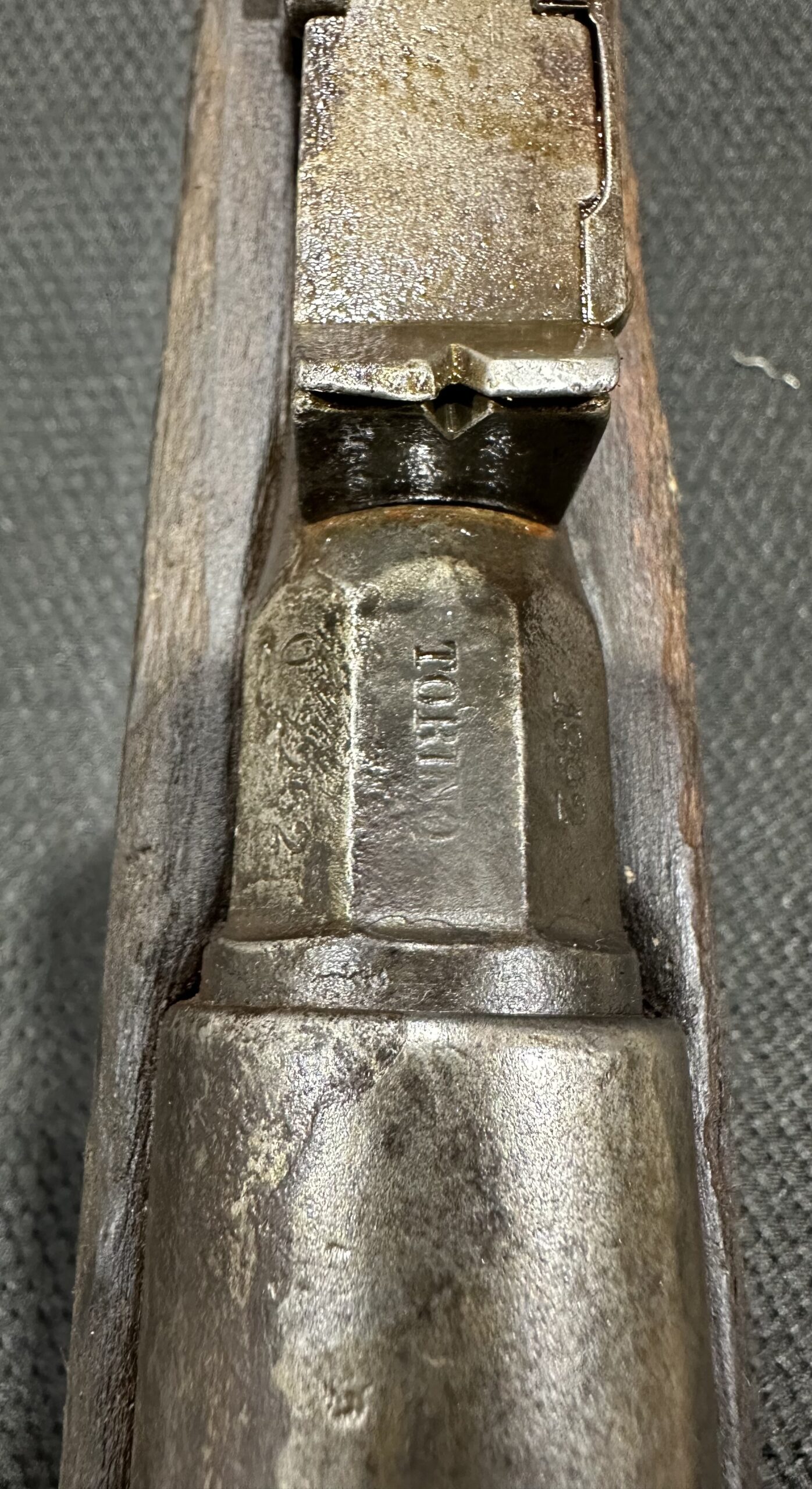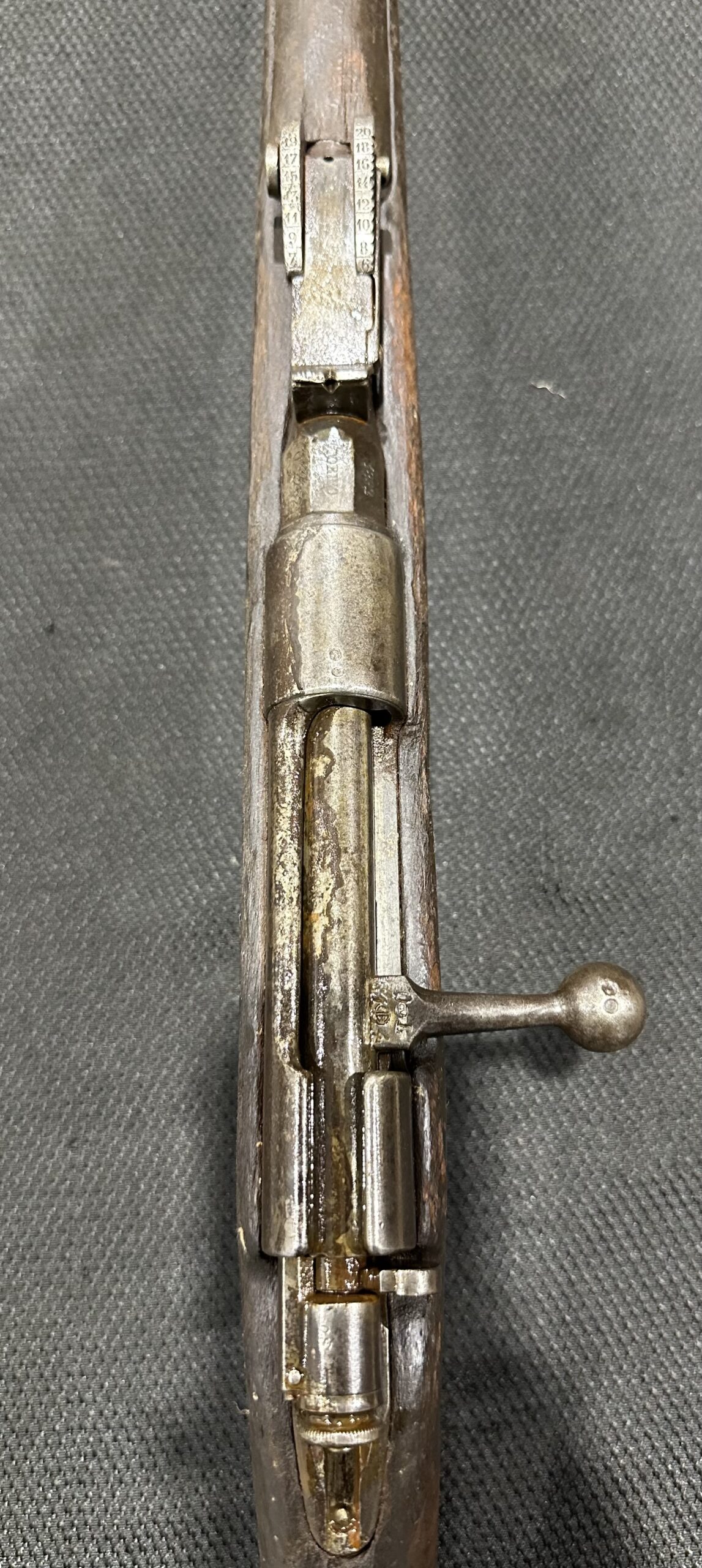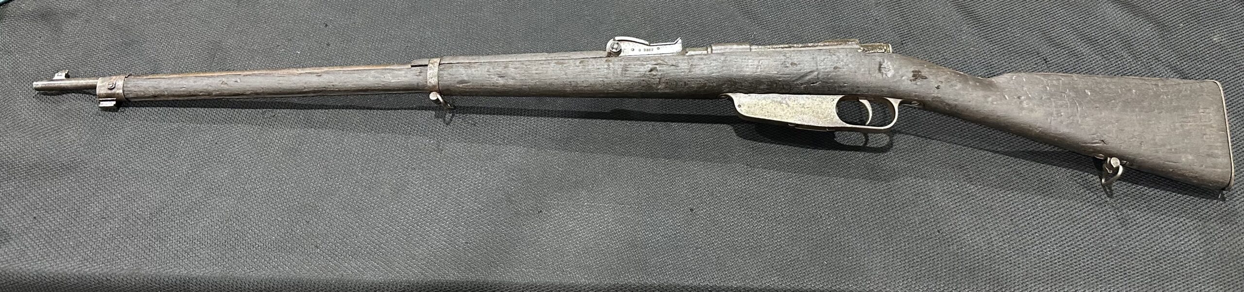 This Antique 1891 Carcano rifle was manufactured by Torino in 1892. The bore is in fair to good condition and would benefit from light cleaning. The rifle retains its original finish, which remains in fair condition with some pitting. The wood is in fair overall condition, showing typical handling wear, including dings and scratches, but no major cracks. This is the exact rifle you will receive.