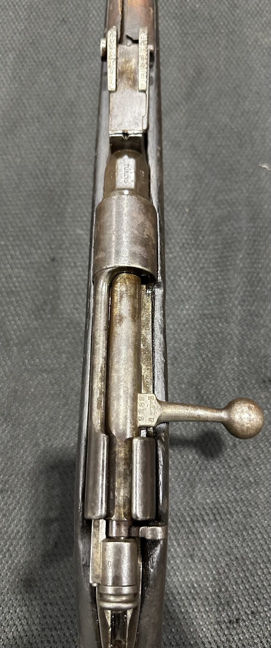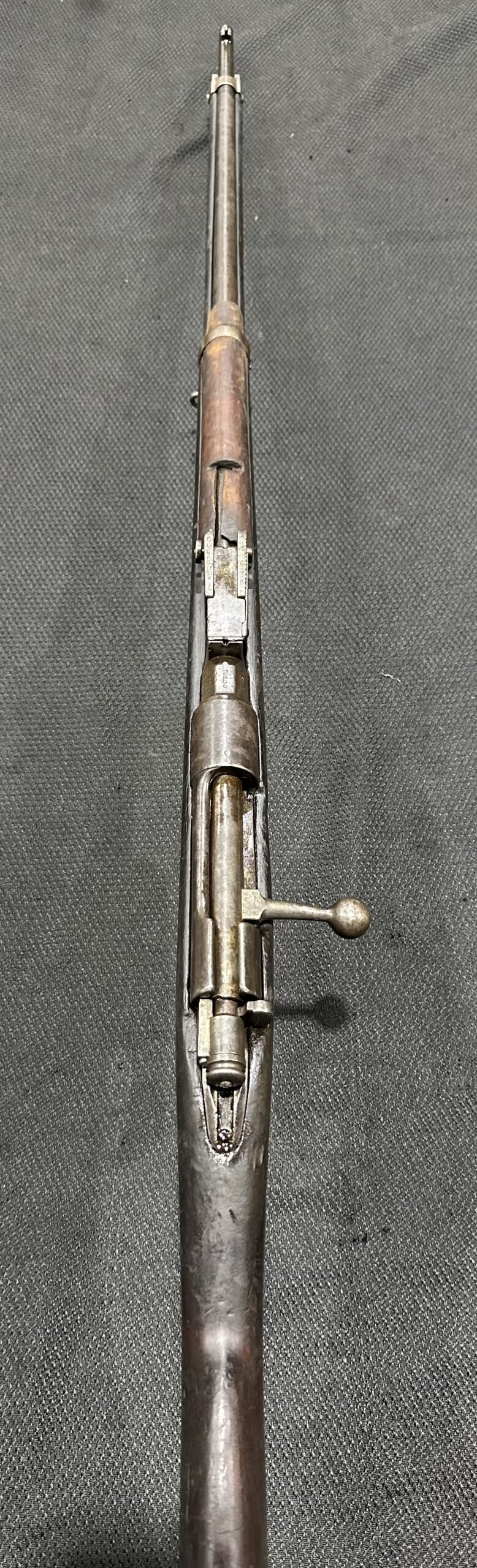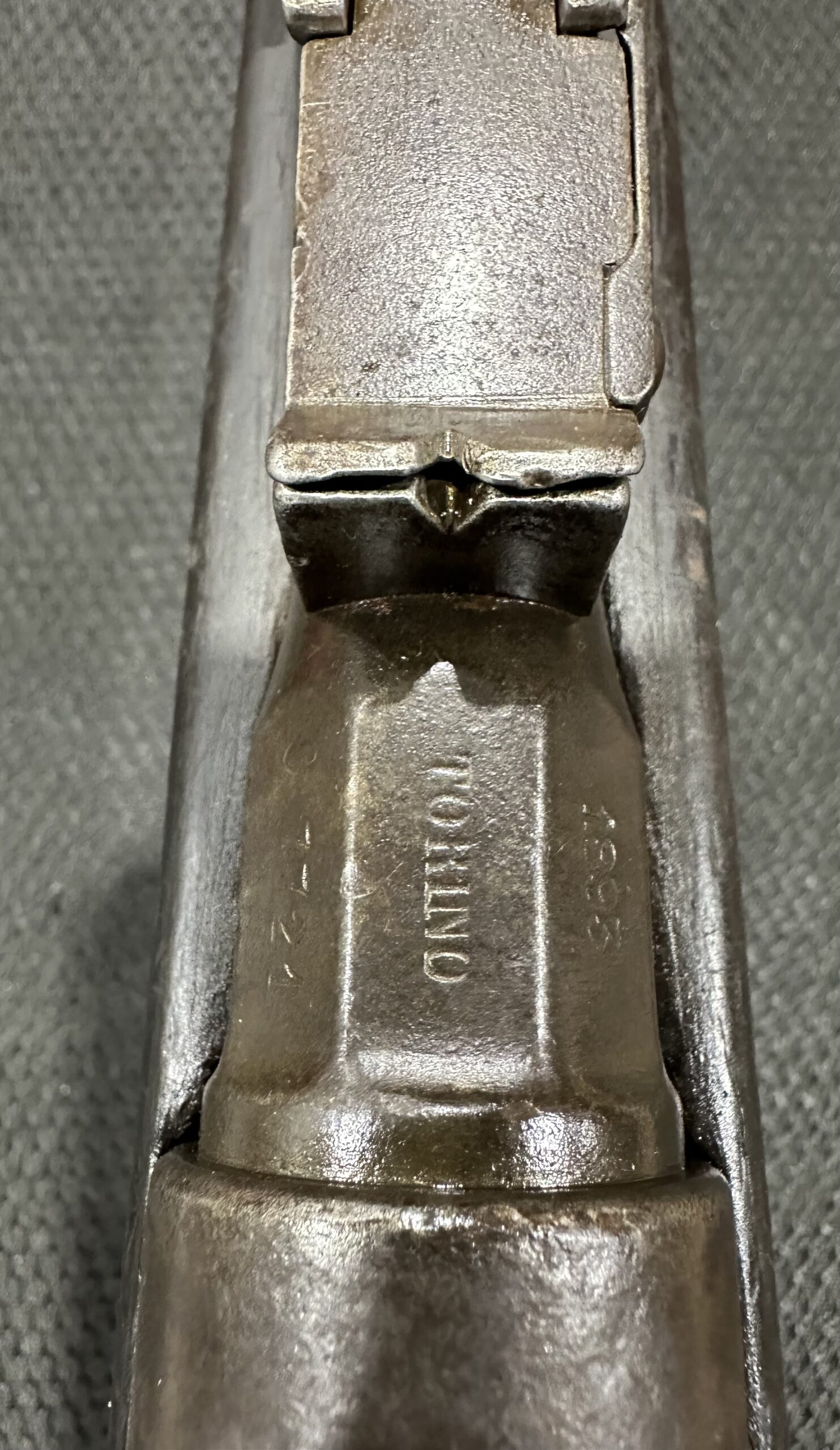 This Antique 1891 Carcano rifle was manufactured by Torino in 1893. The bore is in poor to fair condition and would benefit from light cleaning. The rifle retains its original finish, which remains in good condition. The wood is structurally sound overall, showing typical handling wear, including dings and scratches. Please note there are a few small cracks in the buttstock, and a small piece of wood is missing from the upper handguard. This is the exact rifle you will receive.