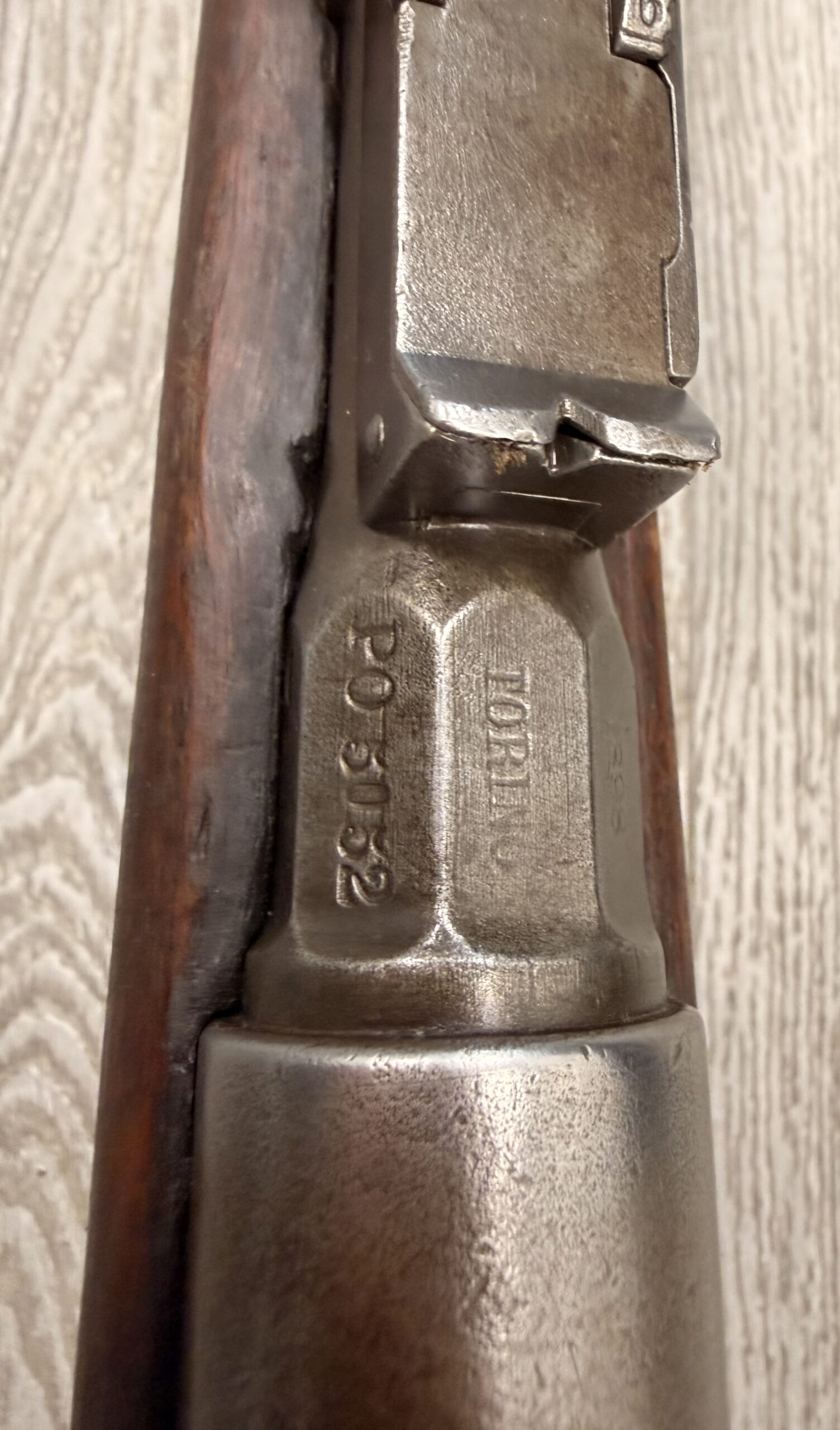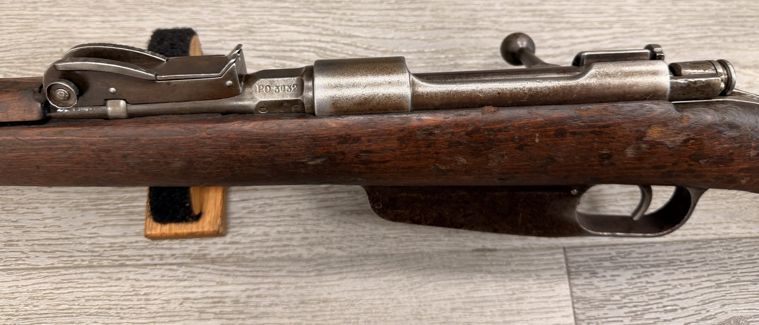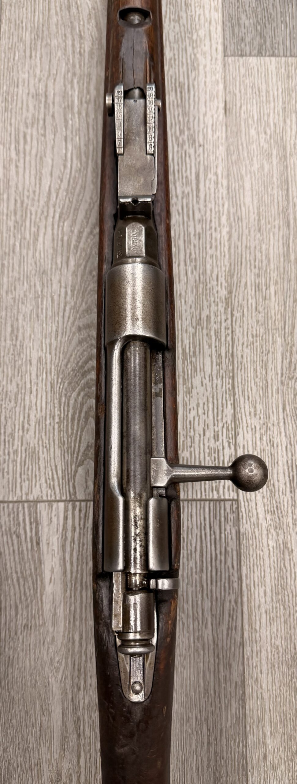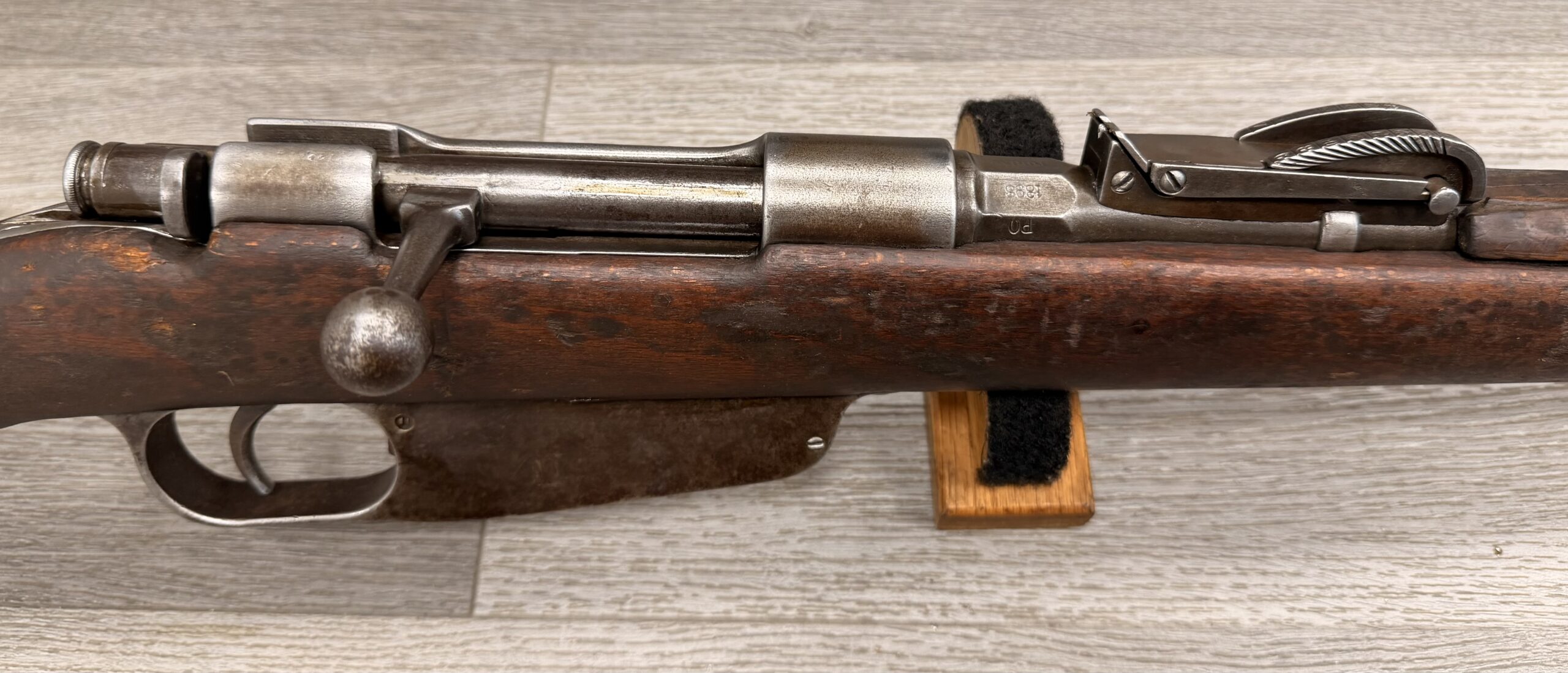 This beautiful 1891 Carcano rifle was manufactured at Torino in 1898. The bore is in poor condition. The rifle retains its original finish, which is still in good condition. The stock is in fair condition and shows typical handling wear with some dings and scratches. Please note there are a few cracks in the stock: one at the upper handguard, one behind the receiver at the wrist, and a few cracks in the buttstock.