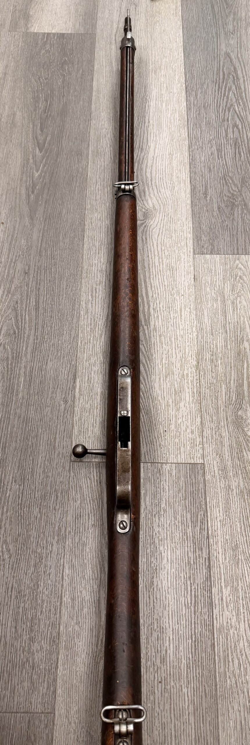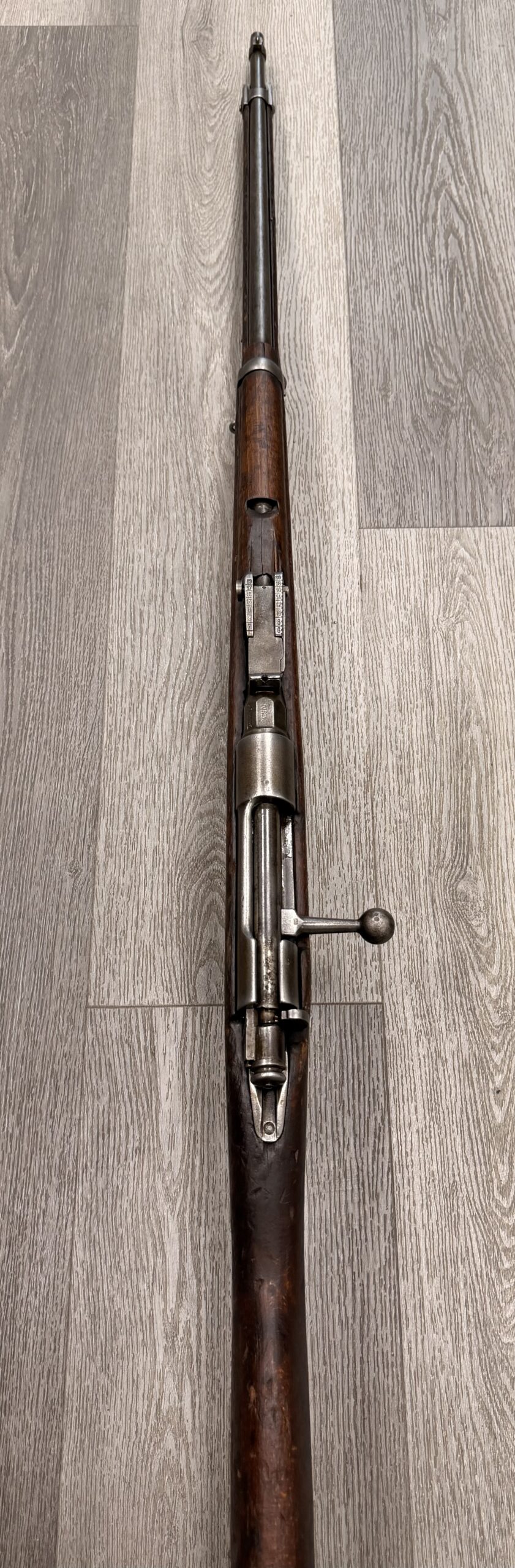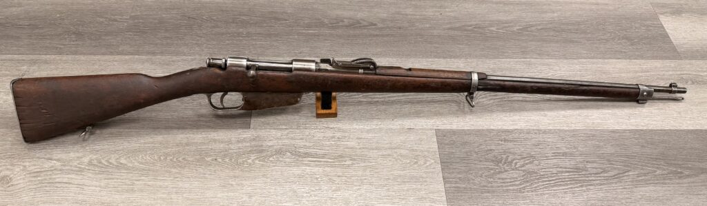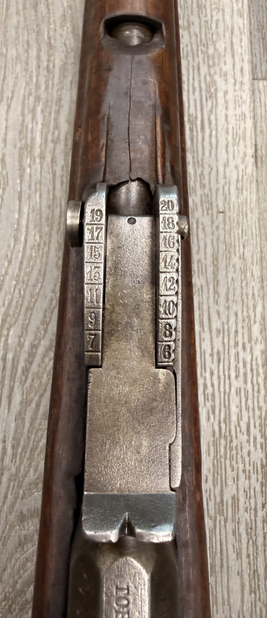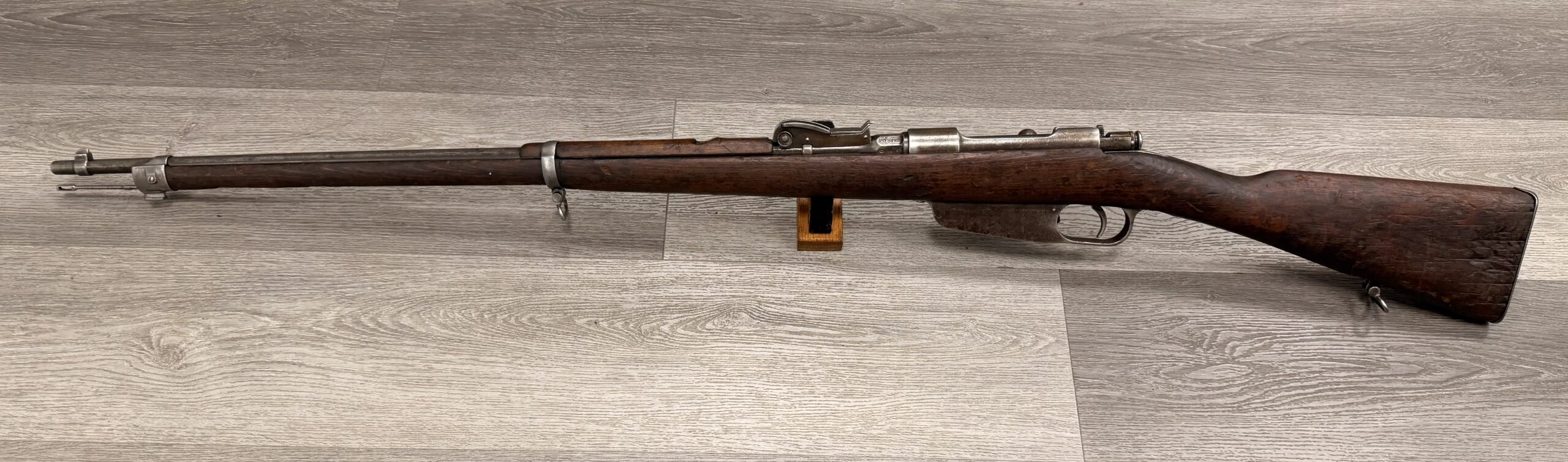 This beautiful 1891 Carcano rifle was manufactured at Torino in 1898. The bore is in poor condition. The rifle retains its original finish, which is still in good condition. The stock is in fair condition and shows typical handling wear with some dings and scratches. Please note there are a few cracks in the stock: one at the upper handguard, one behind the receiver at the wrist, and a few cracks in the buttstock.