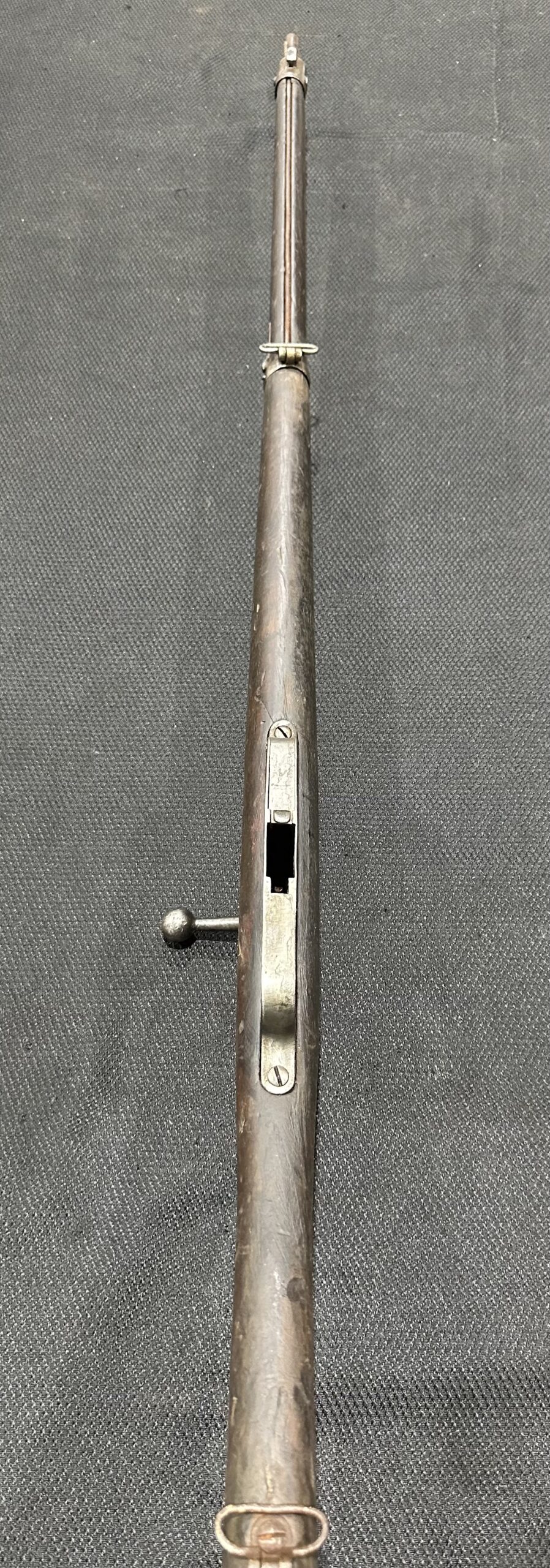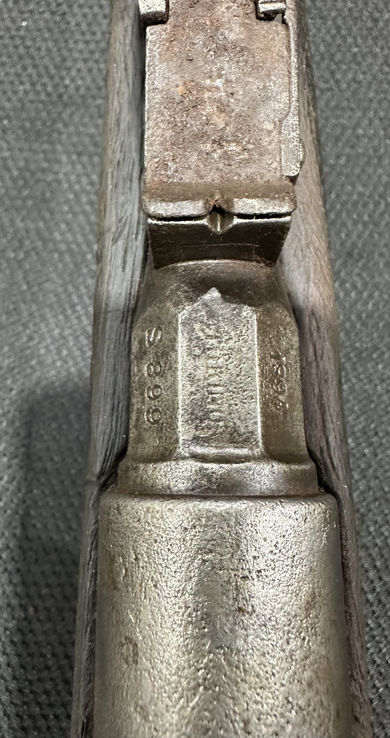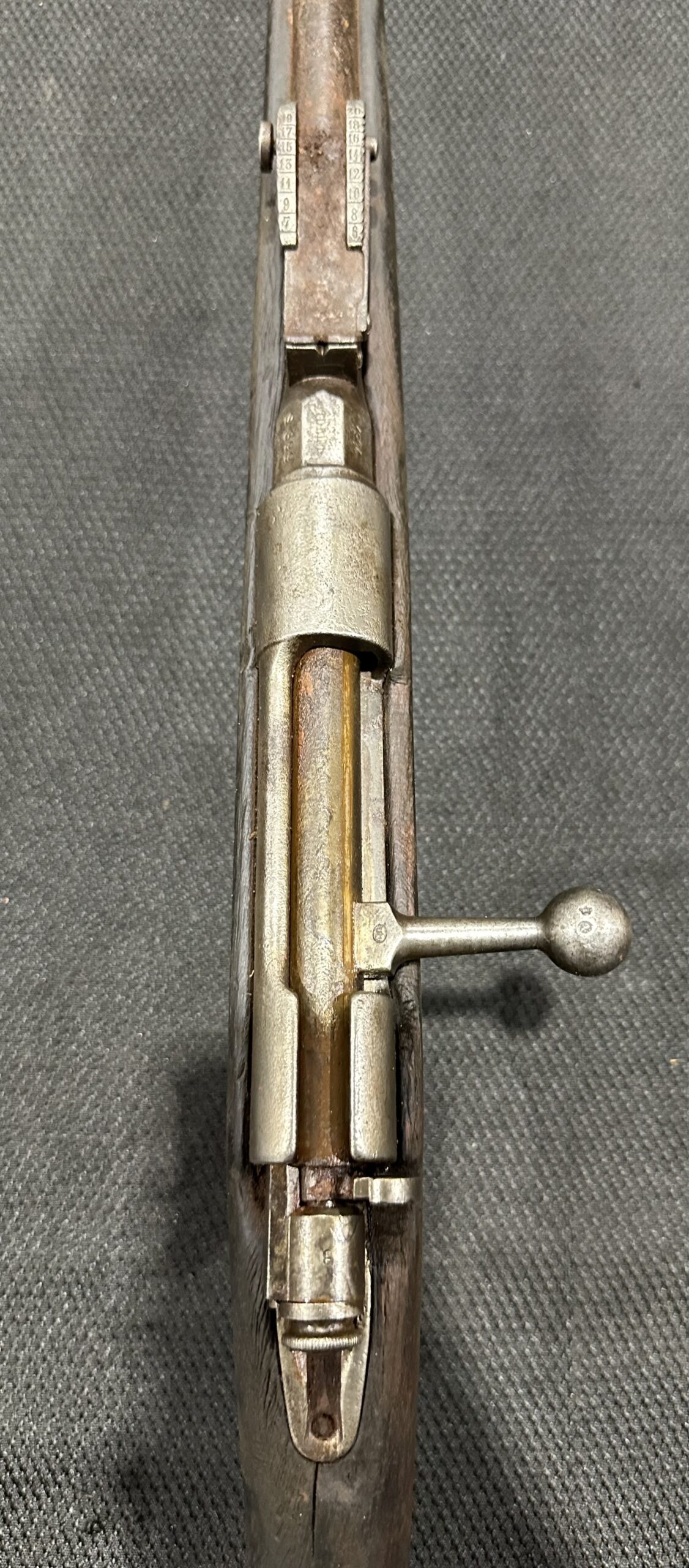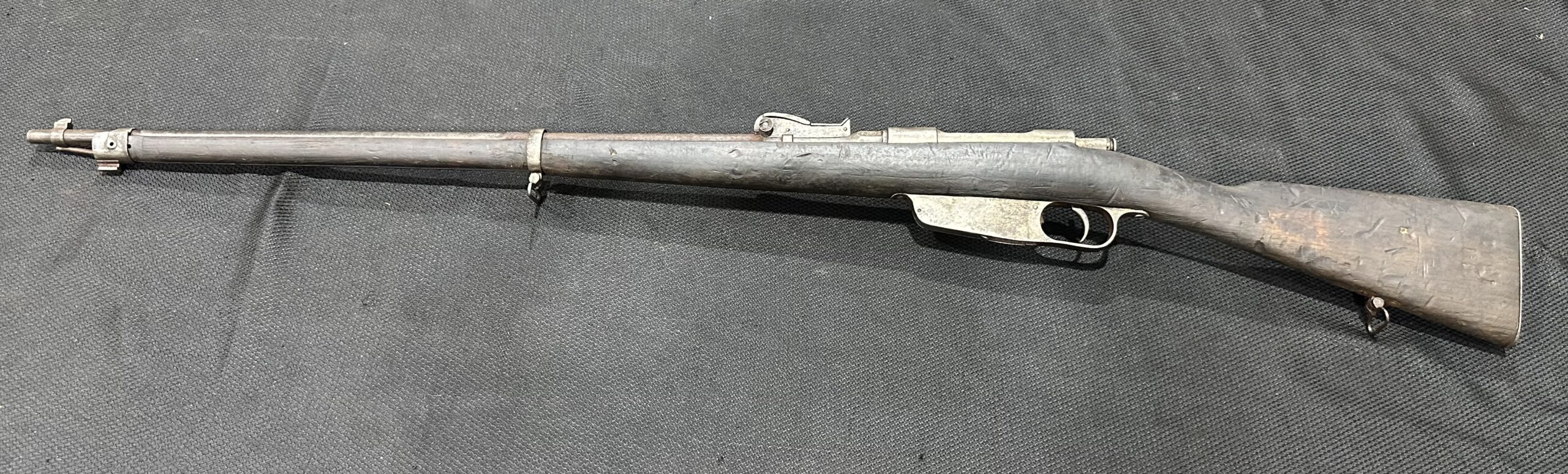 This 1891 Carcano Rifle was manufactured by Torino in 1894. The bore is in poor condition, and the rifle retains its original finish, which is in fair to good condition. The wood is in good shape overall, with some handling wear, dings, and scratches from typical use. Please note that there is one very small cracks behind the receiver at the wrist and some pitting on the receiver. The upper handguard is missing.