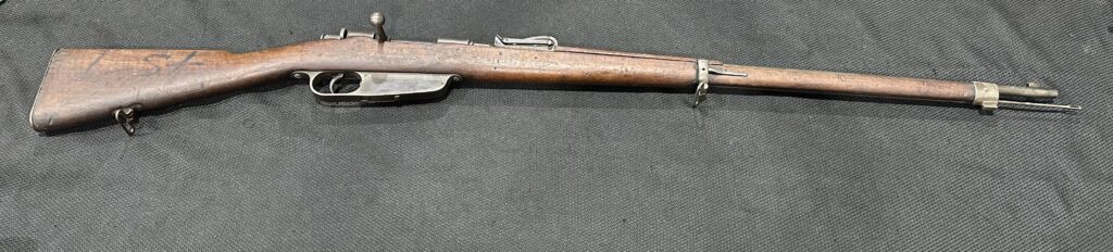 This Antique 1891 Carcano rifle was manufactured by Torre Annunziata in 1894. The bore is in fair condition. The rifle retains its original finish, which remains in good condition. The wood is in good condition, showing typical handling wear, including dings and scratches. Please note there is a crack behind the receiver at the wrist. This is the exact rifle you will receive. Comes with a cleaning rod.