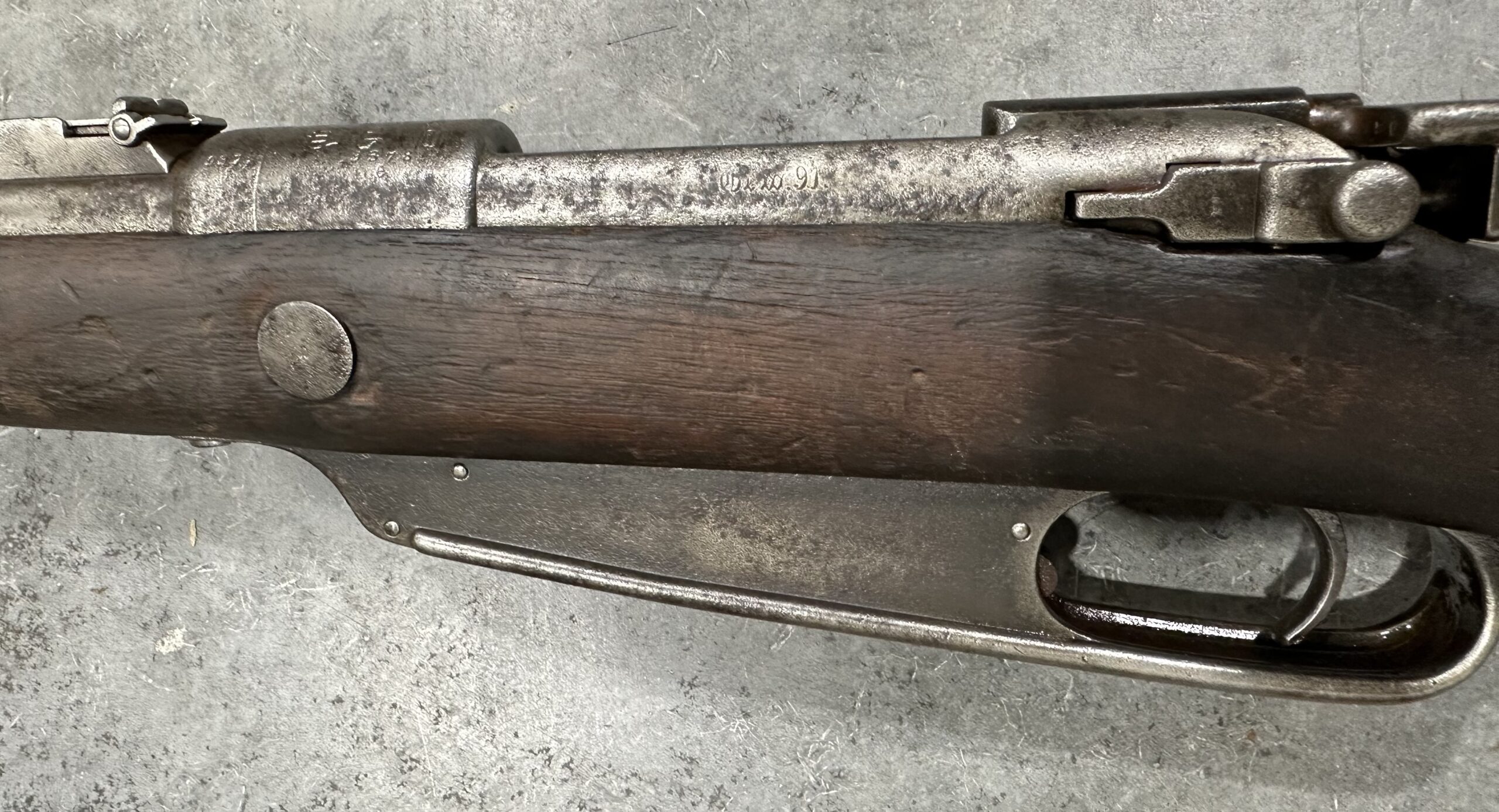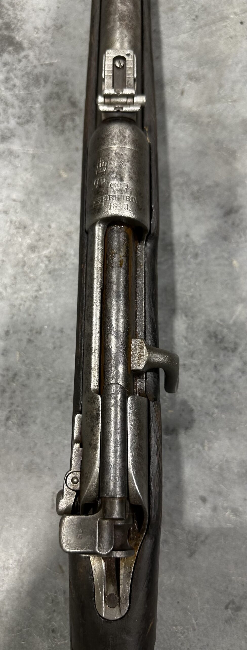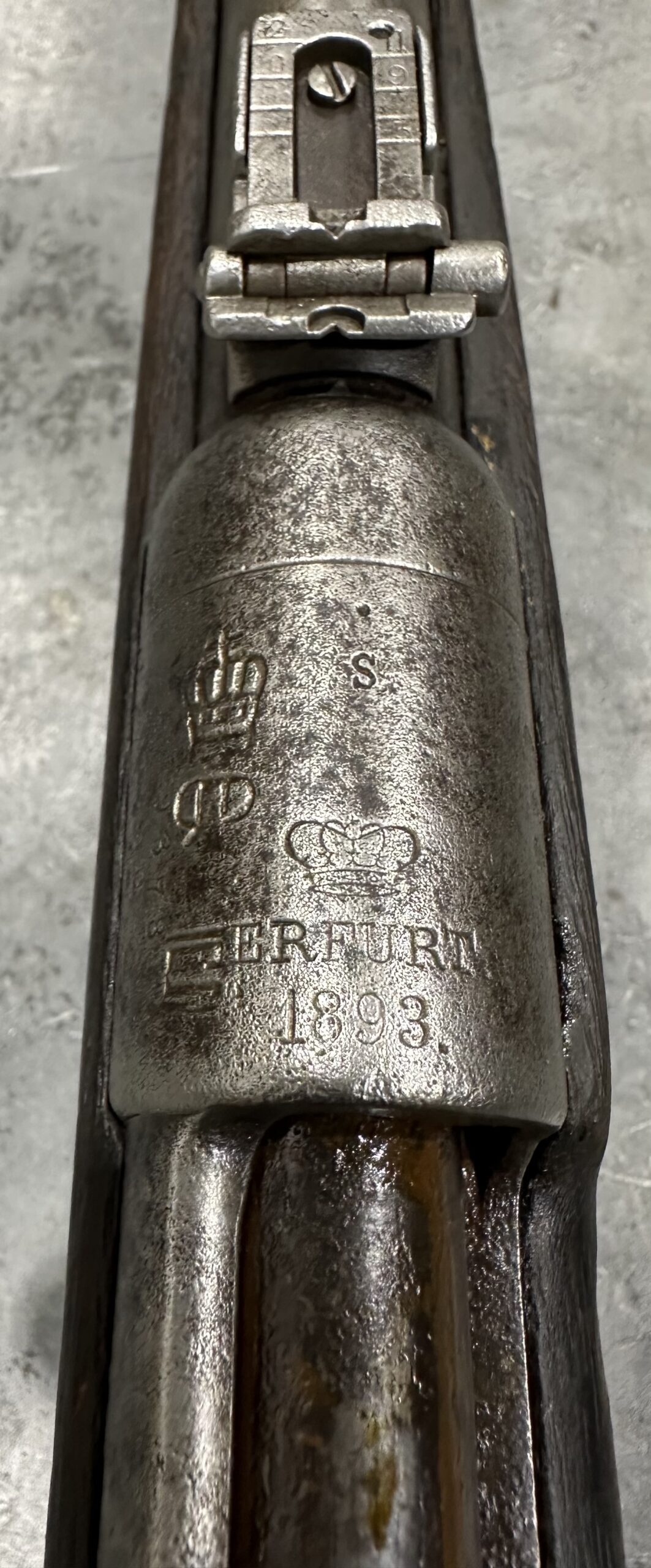 This carbine was made in 1893 by Erfurt and is in fair condition. Please note: it has a poor bore, a cracked stock at the wrist, and a dented barrel shroud. The bolt does not open and close smoothly, the striker does not move freely when the trigger is pulled, and the firing pin may be slightly bent.