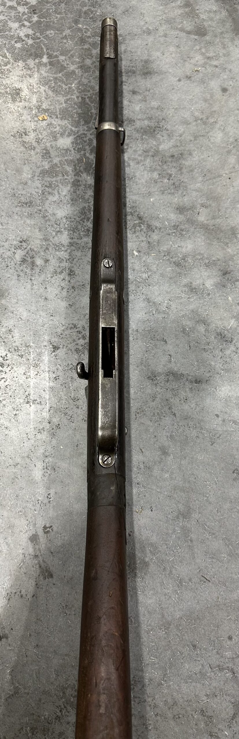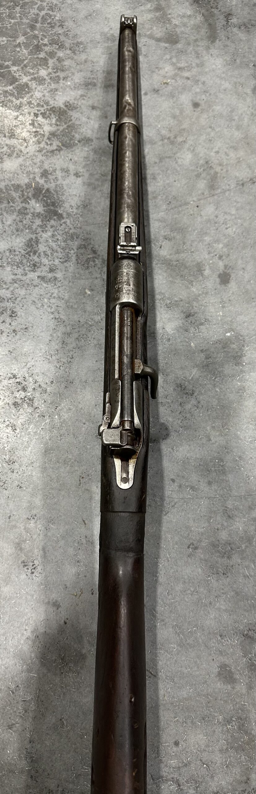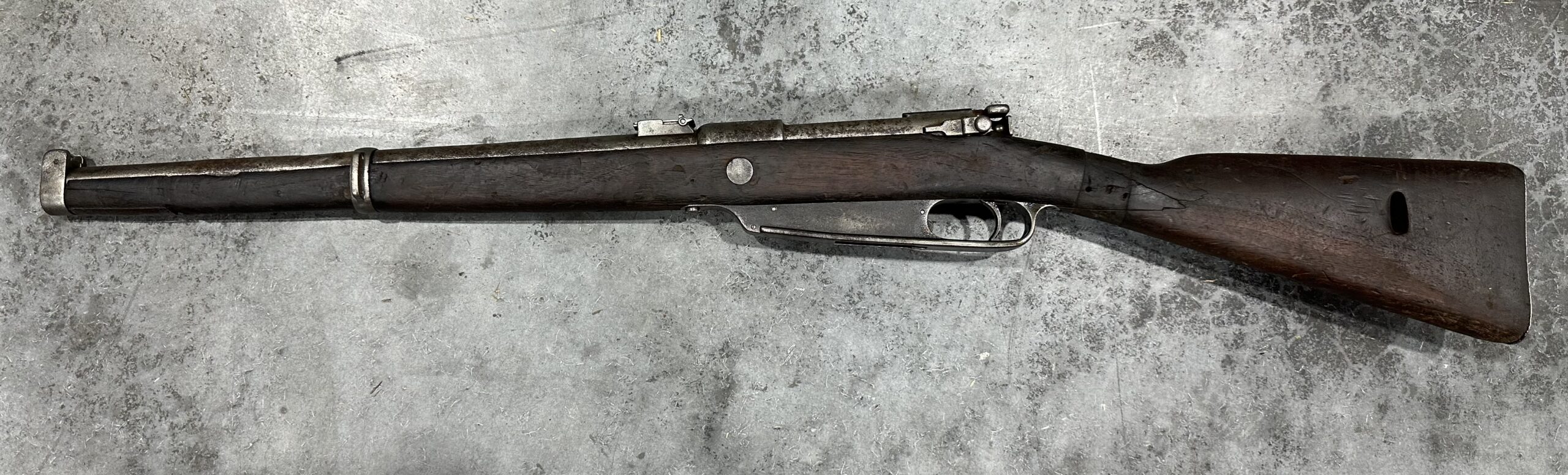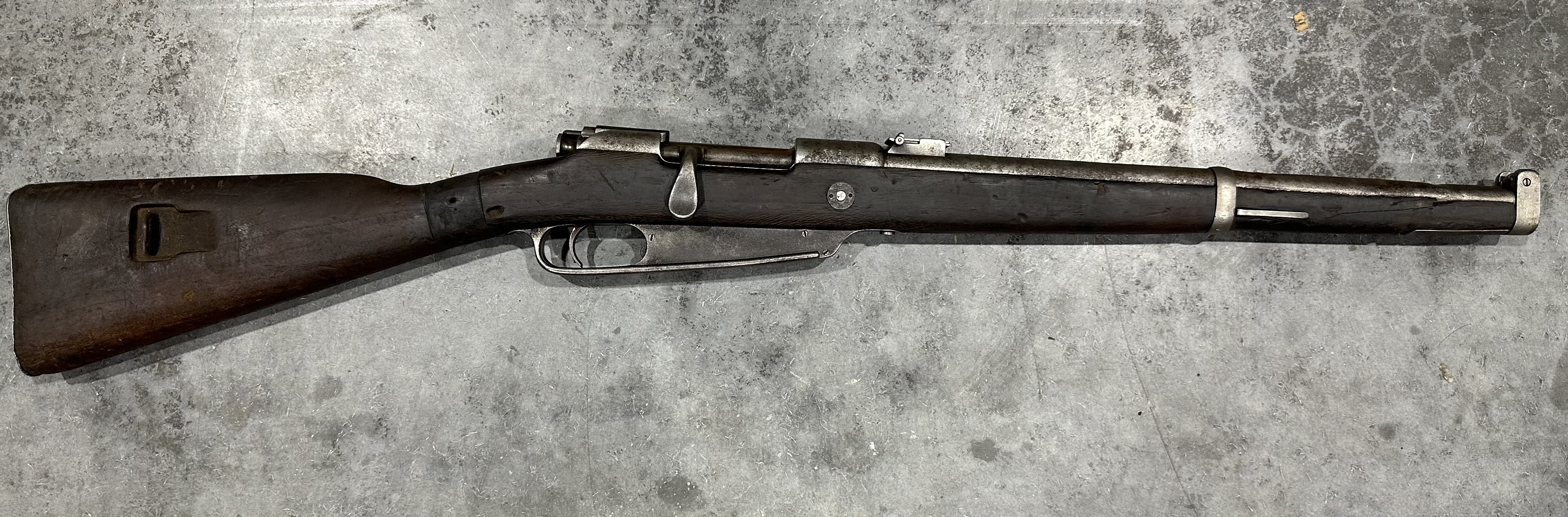 This carbine was made in 1893 by Erfurt and is in fair condition. Please note: it has a poor bore, a cracked stock at the wrist, and a dented barrel shroud. The bolt does not open and close smoothly, the striker does not move freely when the trigger is pulled, and the firing pin may be slightly bent.