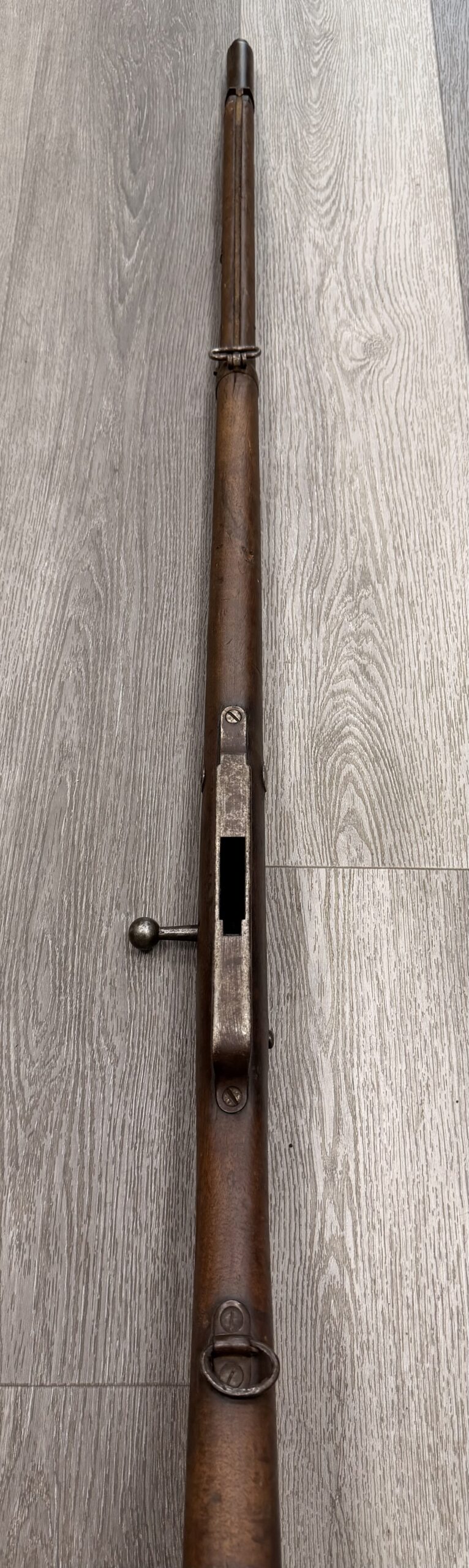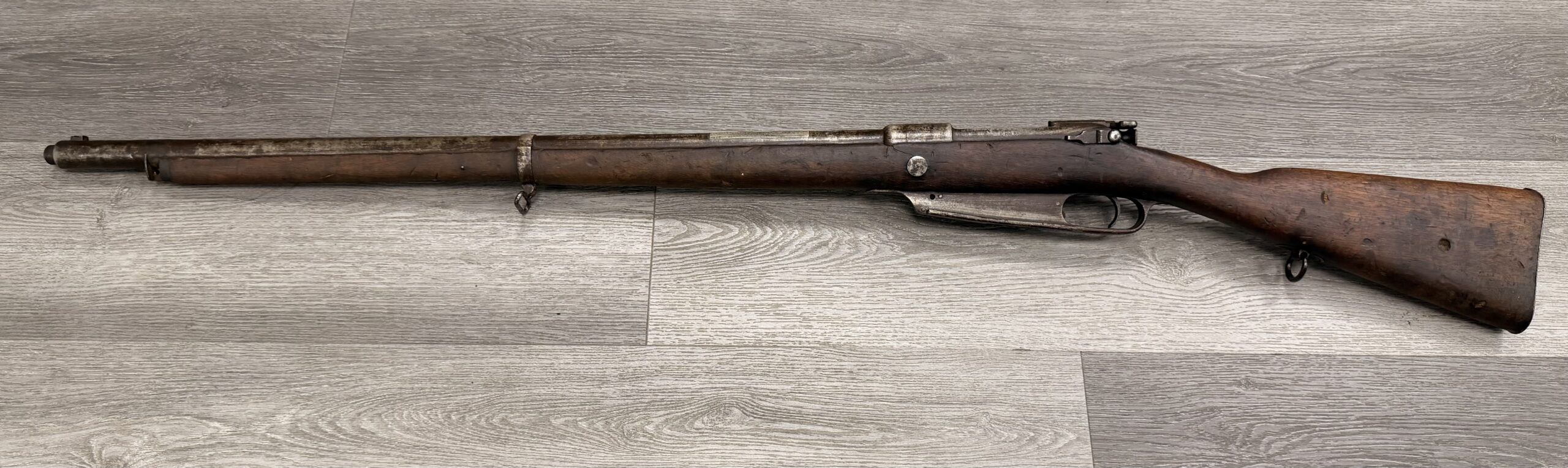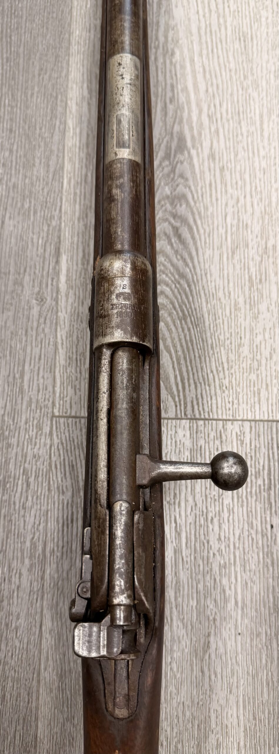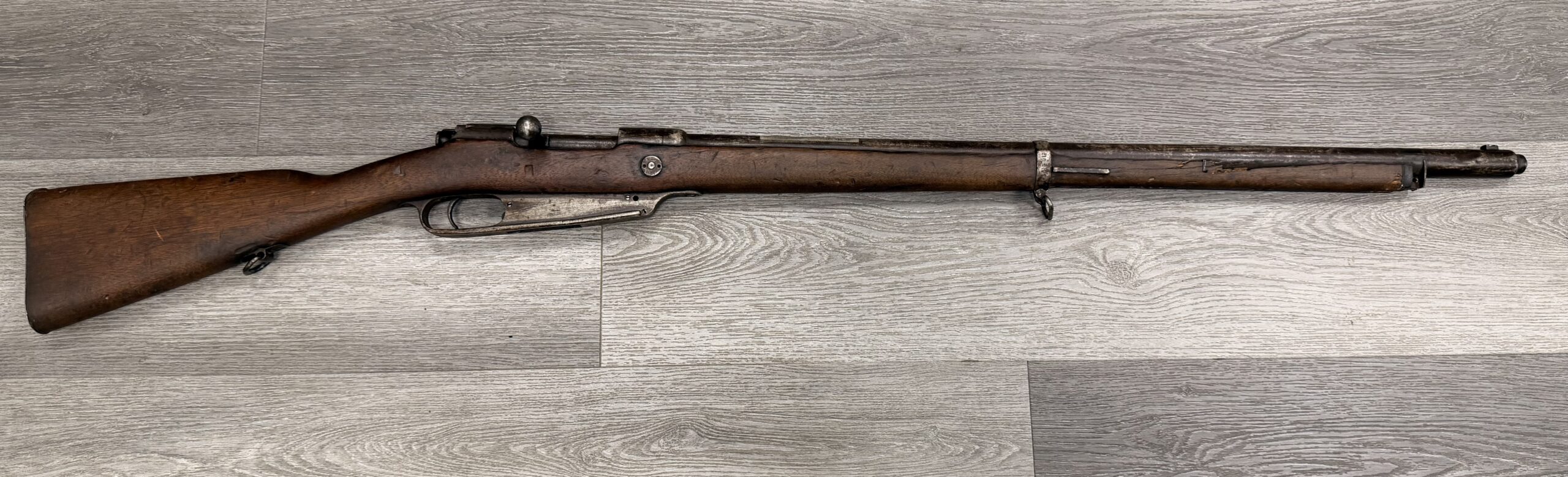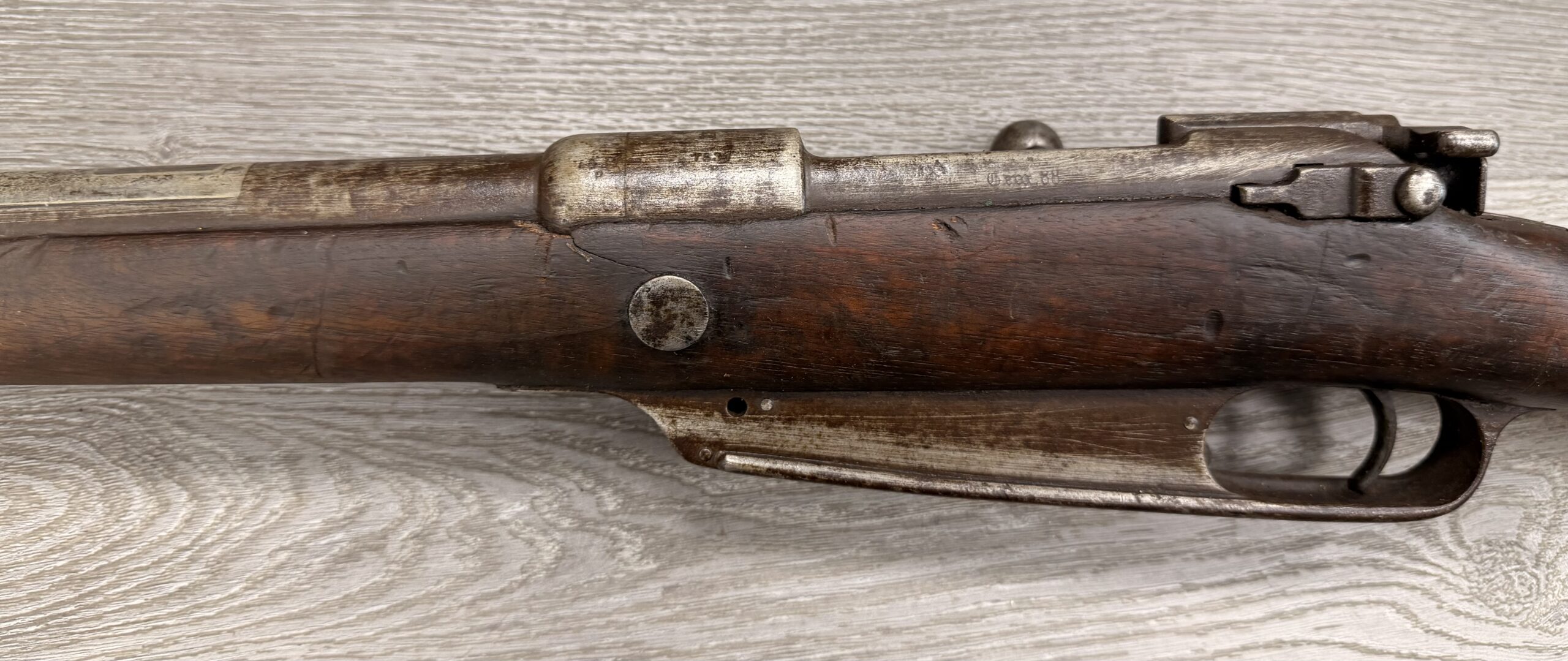 The bore is in poor condition, and the rifle has non-matching numbers. The metal finish is fair, and the wood is in fair condition, showing typical handling wear such as dings and scratches from regular use. Please note that the rear sight is missing, the stock is cracked at the front, and there is no front sight or front barrel band. The rifle has passed a basic function test.