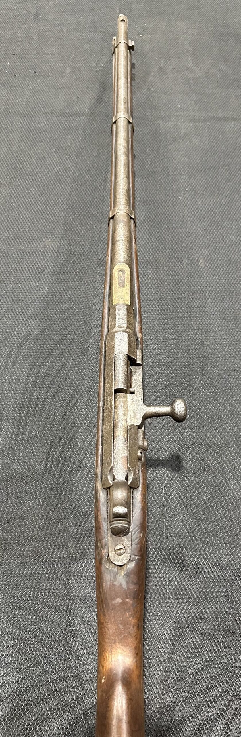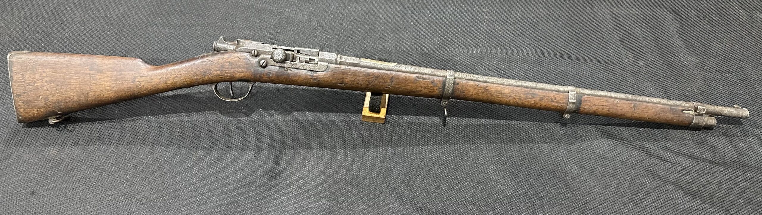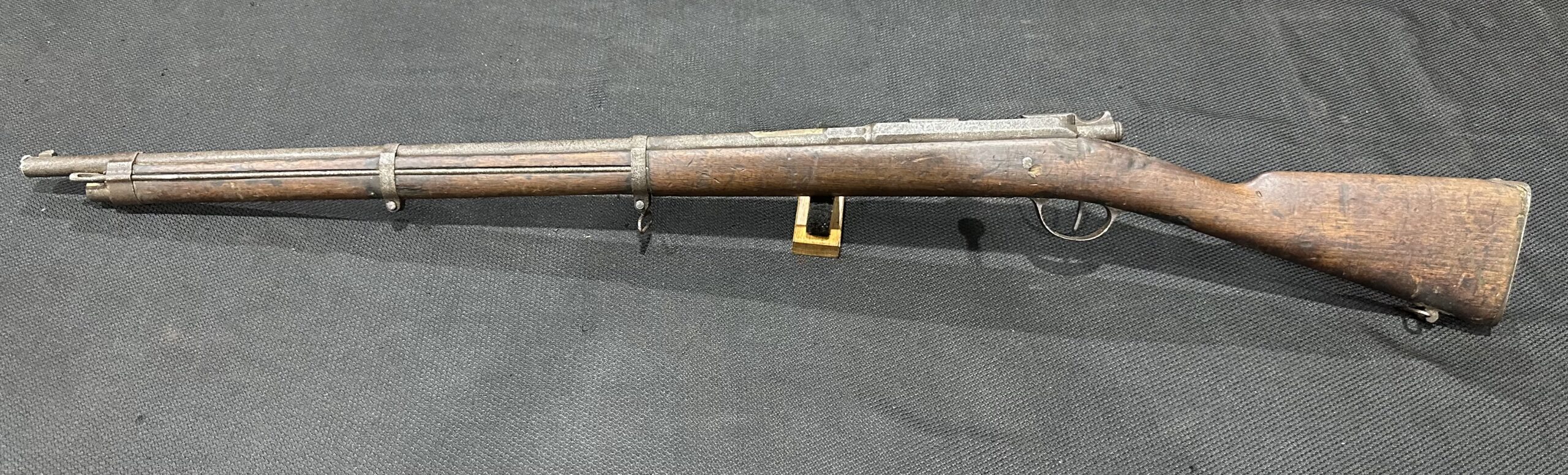Antique Kropatschek St. Etienne Mle 1884 Rifle — Matching Numbers, Serial Number F33539, Chambered in 11mm Gras. Manufactured in 1885, this rifle is in good condition and fully functional. The bore remains in good condition, and the rifle features matching serial numbers. Please note that the rear sight is missing, and all markings and serial numbers show signs of wear. Additionally, there is pitting on the receiver, barrel bands, and barrel. The stock is in very good condition with some wear and scratches. Please refer to the detailed photos above for more information.