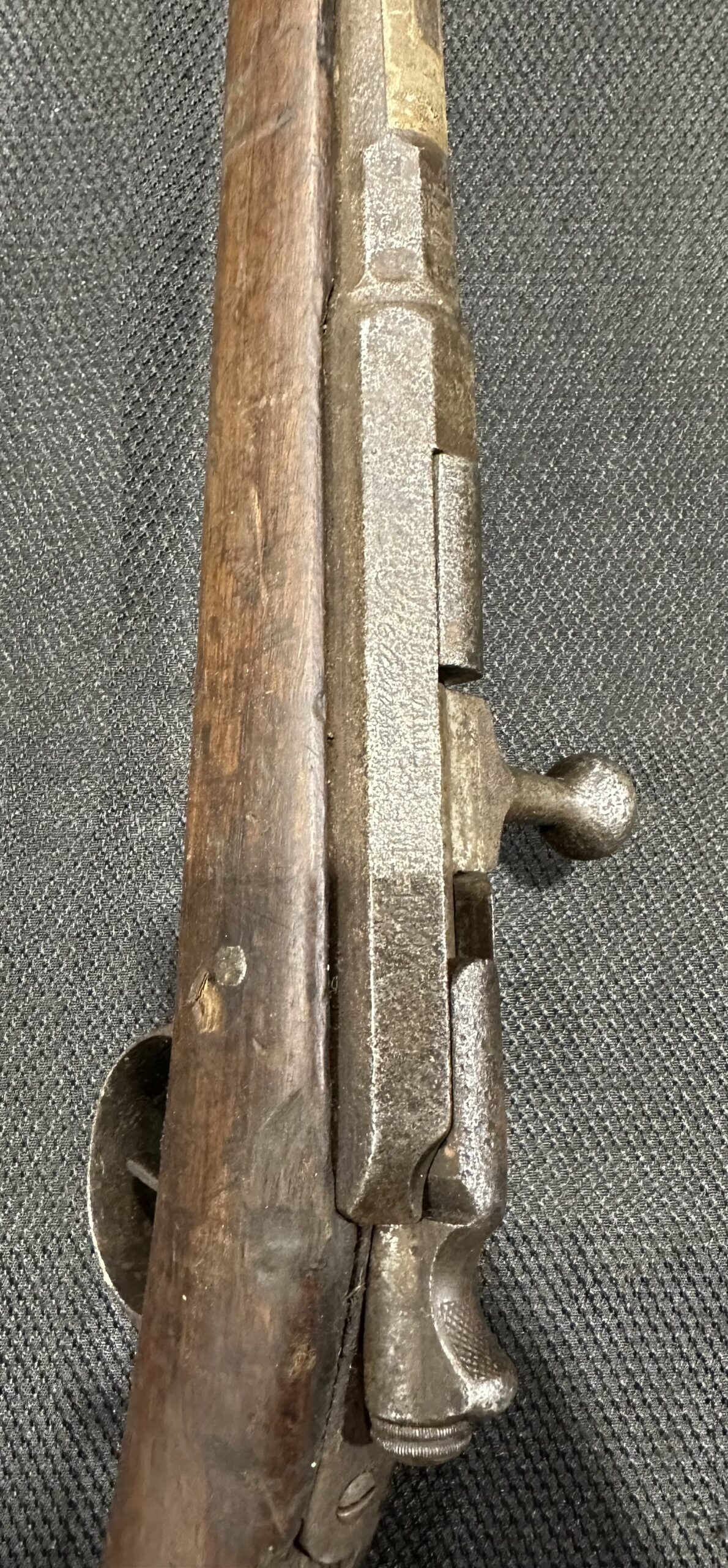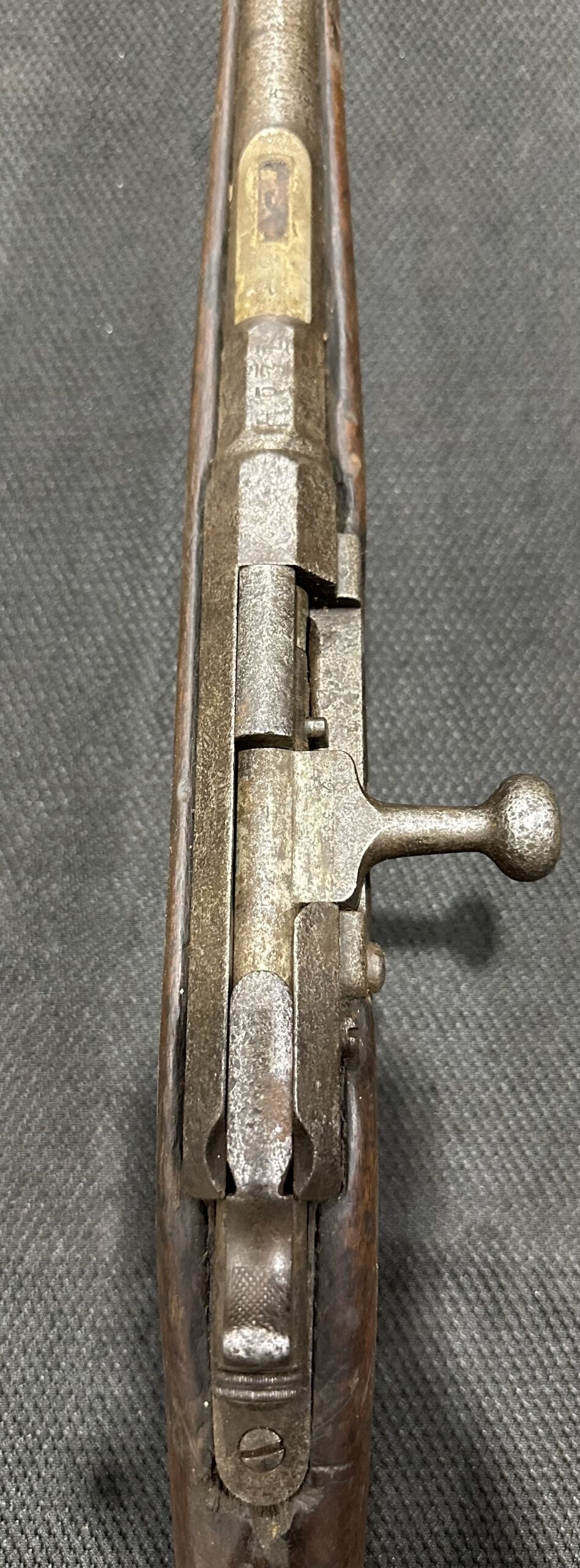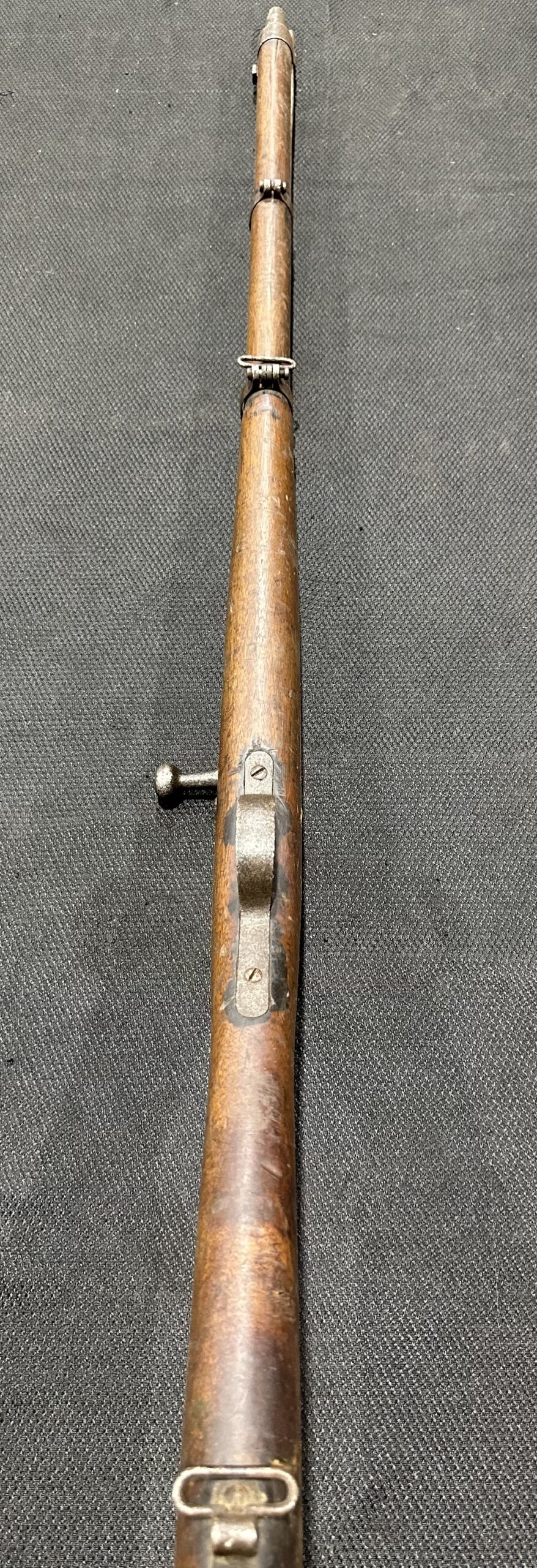 Antique Kropatschek St. Etienne Mle 1884 Rifle — Matching Numbers, Serial Number F33539, Chambered in 11mm Gras. Manufactured in 1885, this rifle is in good condition and fully functional. The bore remains in good condition, and the rifle features matching serial numbers. Please note that the rear sight is missing, and all markings and serial numbers show signs of wear. Additionally, there is pitting on the receiver, barrel bands, and barrel. The stock is in very good condition with some wear and scratches. Please refer to the detailed photos above for more information.