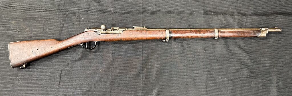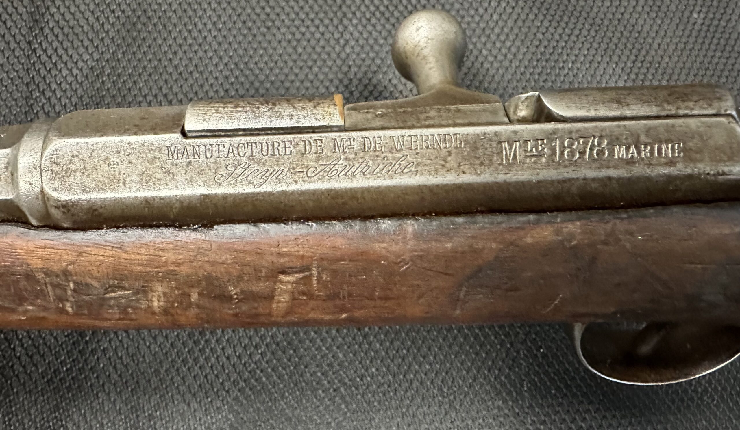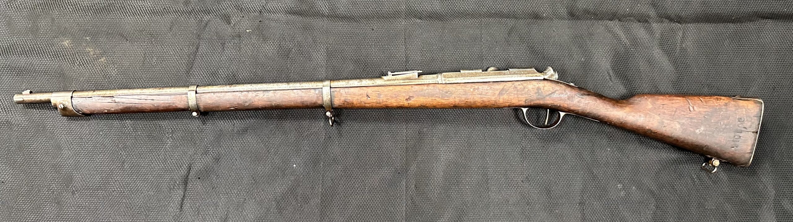 We just received a gorgeous and very rare ANTIQUE KROPATSCHEK Steyr Autriche MLE 1878 Marine RIFLE, Serial Number A2103. Please note that the bolt and middle barrel band are not matching to the rifle. All other components appear to be matching. Please note there is a crack at the wrist, the cartridge lifter does not stay in the downward position (moves freely). The rifle is missing the rear sight notch and upper sight leaf. It has a good bore with strong rifling.