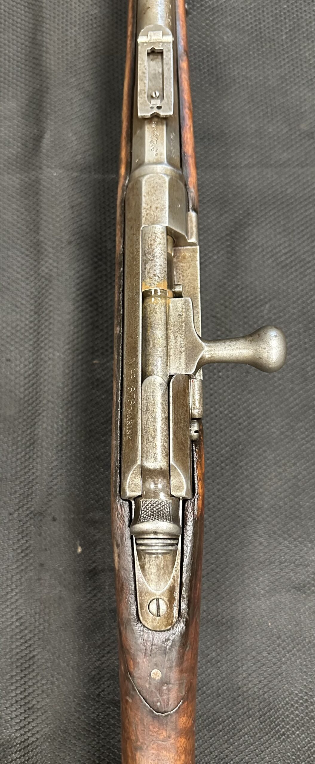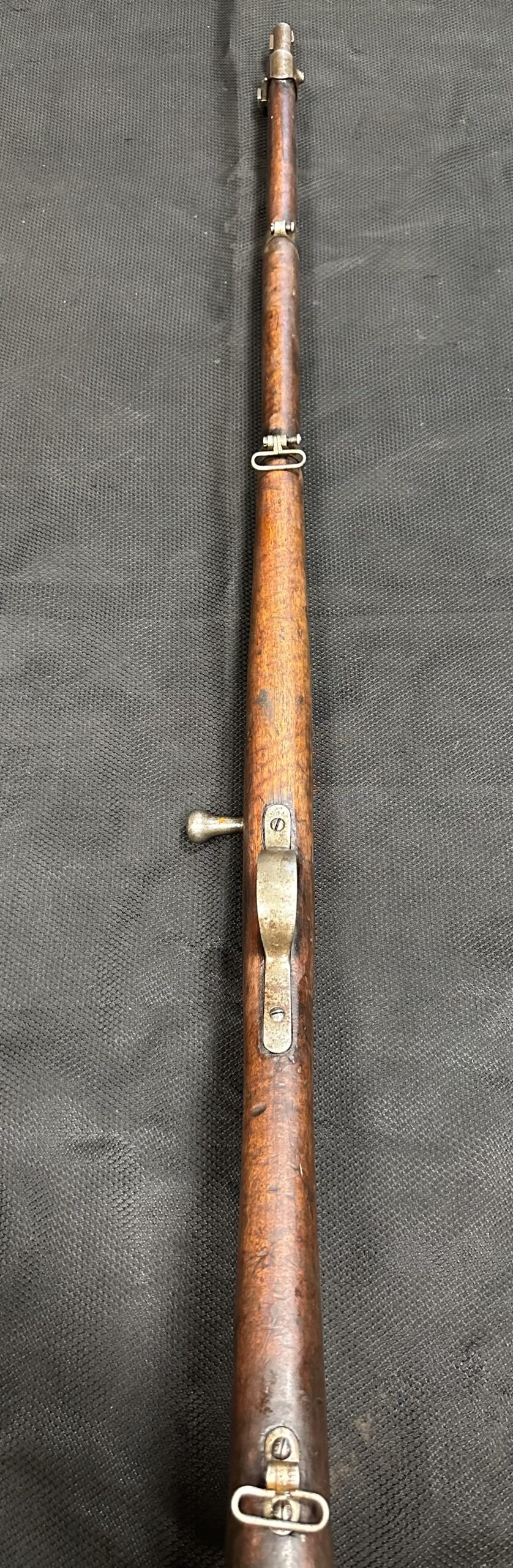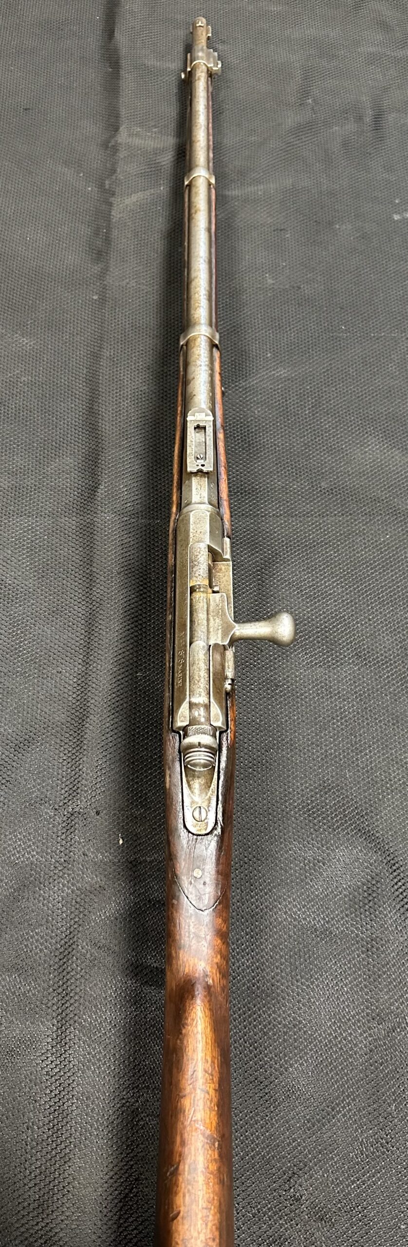 We just received a gorgeous and very rare ANTIQUE KROPATSCHEK Steyr Autriche MLE 1878 Marine RIFLE, Serial Number A2103. Please note that the bolt and middle barrel band are not matching to the rifle. All other components appear to be matching. Please note there is a crack at the wrist, the cartridge lifter does not stay in the downward position (moves freely). The rifle is missing the rear sight notch and upper sight leaf. It has a good bore with strong rifling.