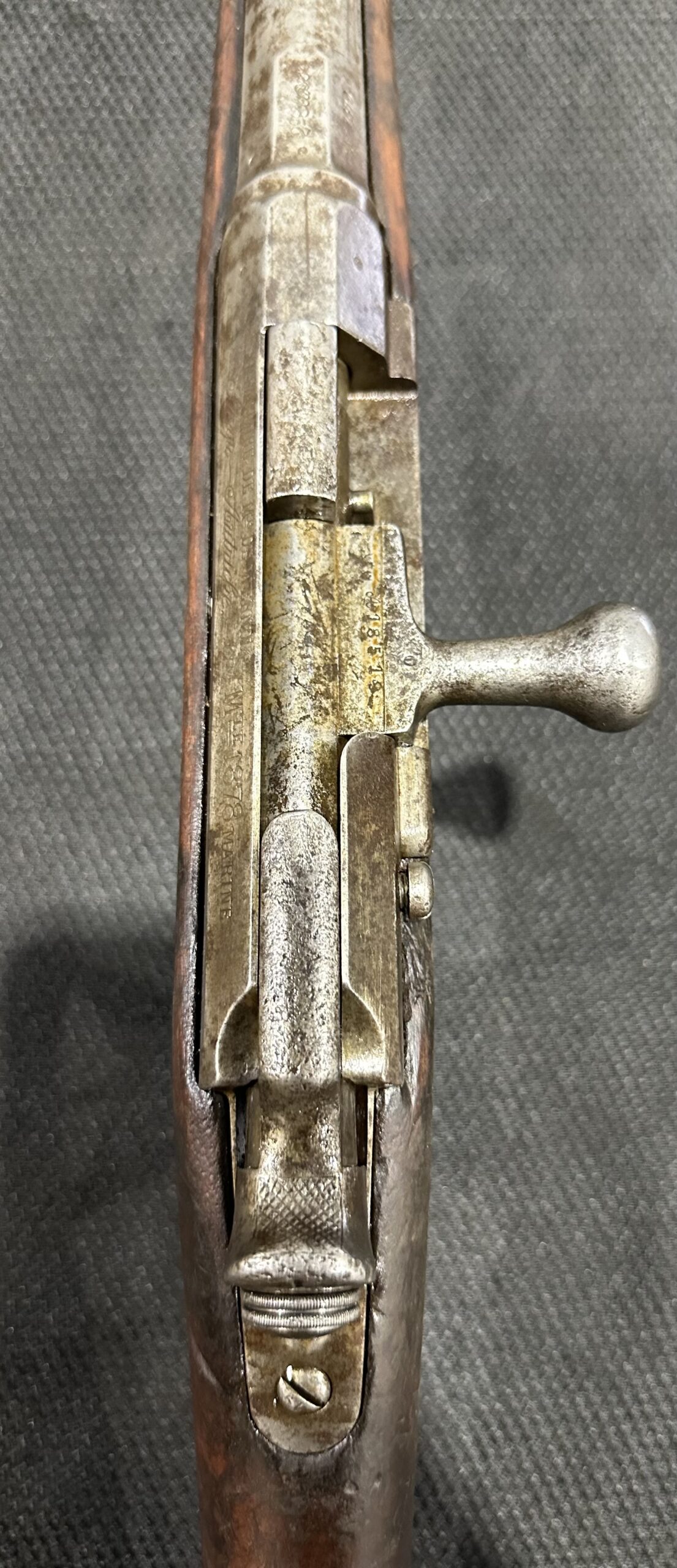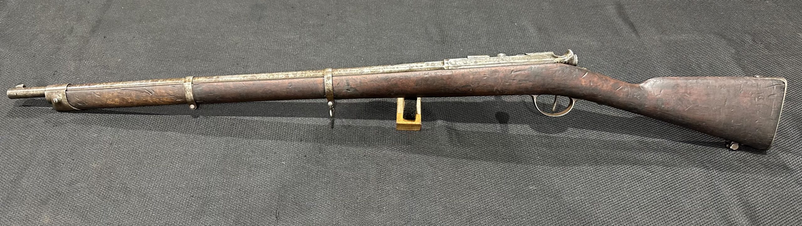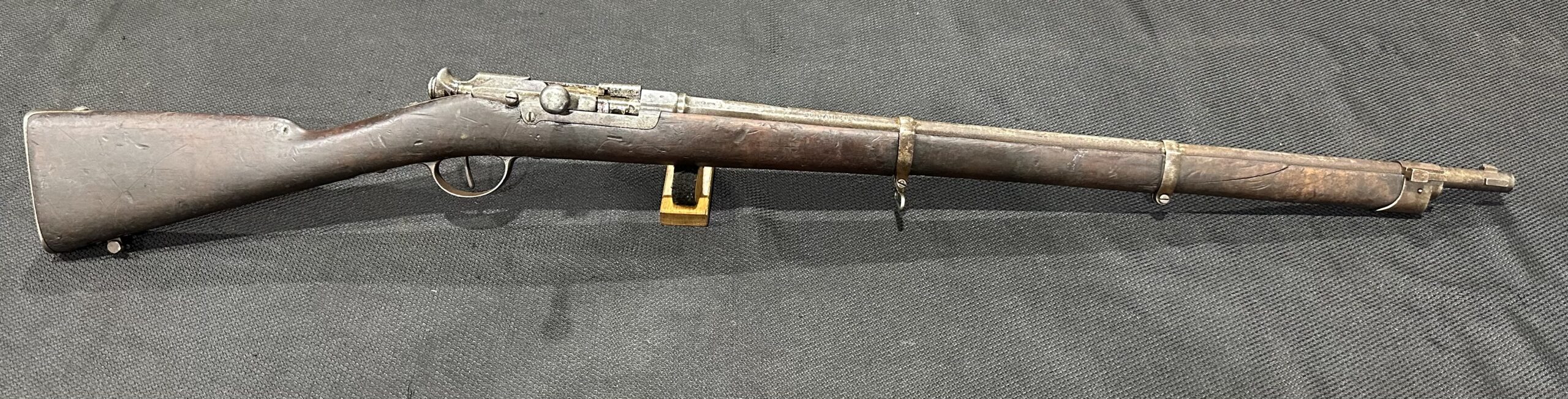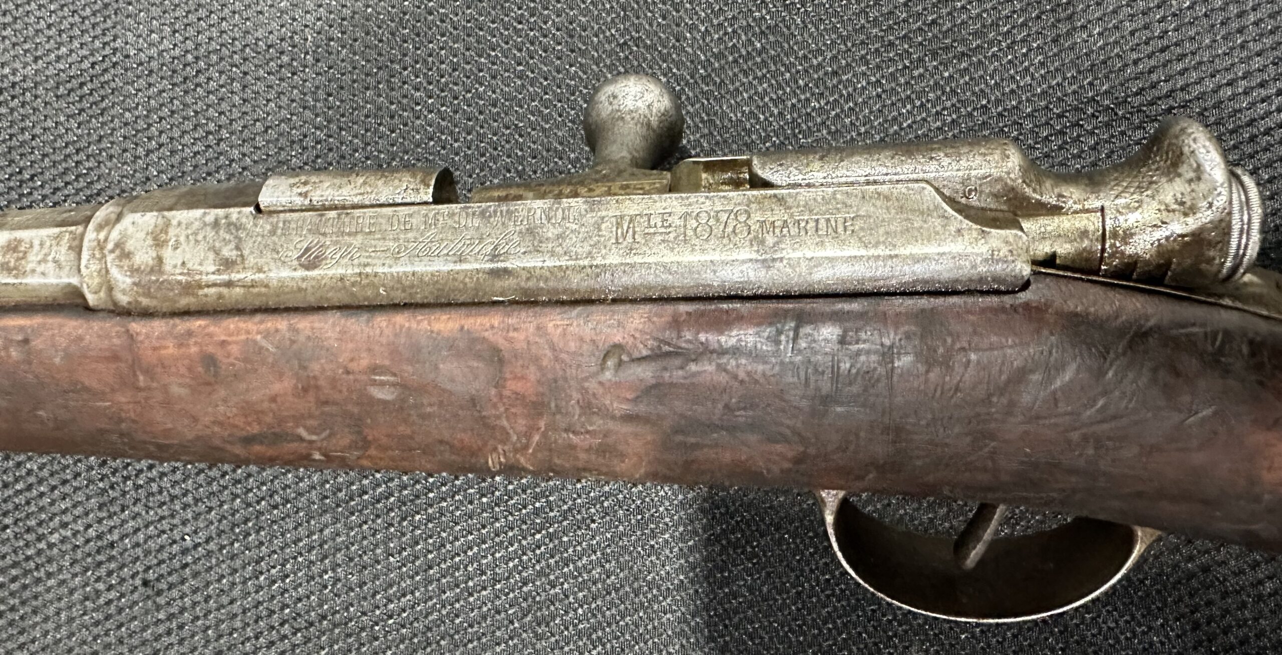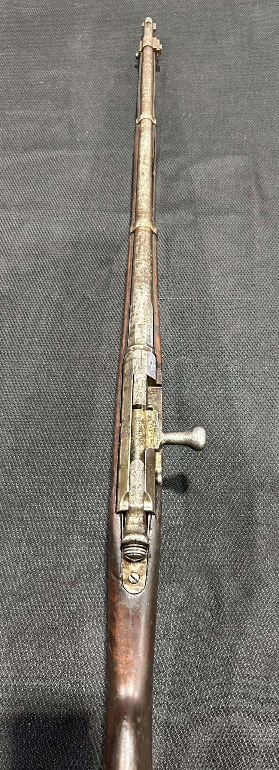 We have for sale 1 ANTIQUE KROPATSCHEK Steyr Autriche MLE 1878 Marine RIFLE, Serial Number A719. This rifle was manufactured in 1879. It is numbers matching, except for the bolt. The rifle is in good condition and fully functional. The bore is in fair condition. All markings and serial numbers are clear. The stock is in good shape with some wear and scratches.