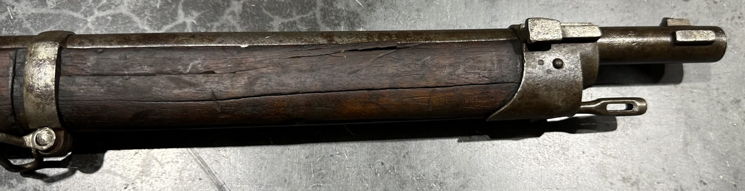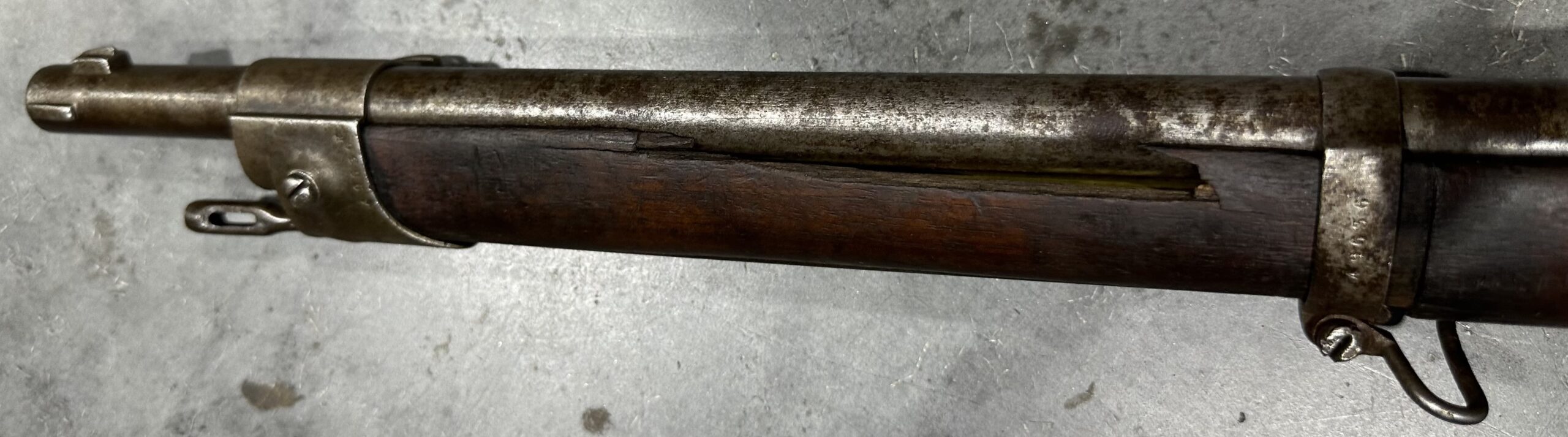 Manufactured in 1879, this rifle is mostly matching, with the exception of the rear barrel band. It is 100% functional, including the lifter system. Please note the rear sight base is missing. The bore is in fair to good condition with strong rifling. There are some cracks at the front of the stock, and the magazine tube may be dented near the front.
