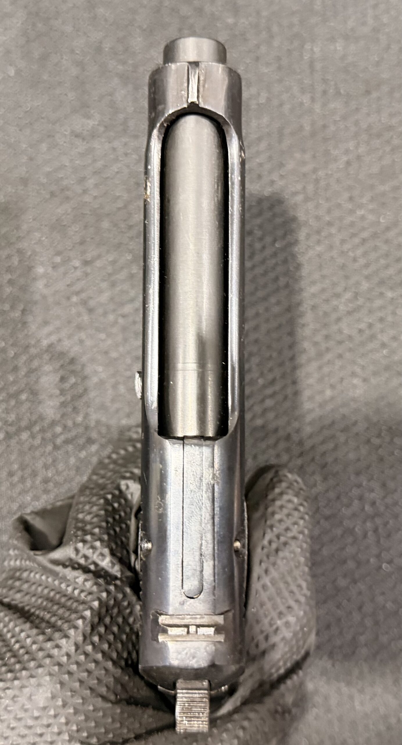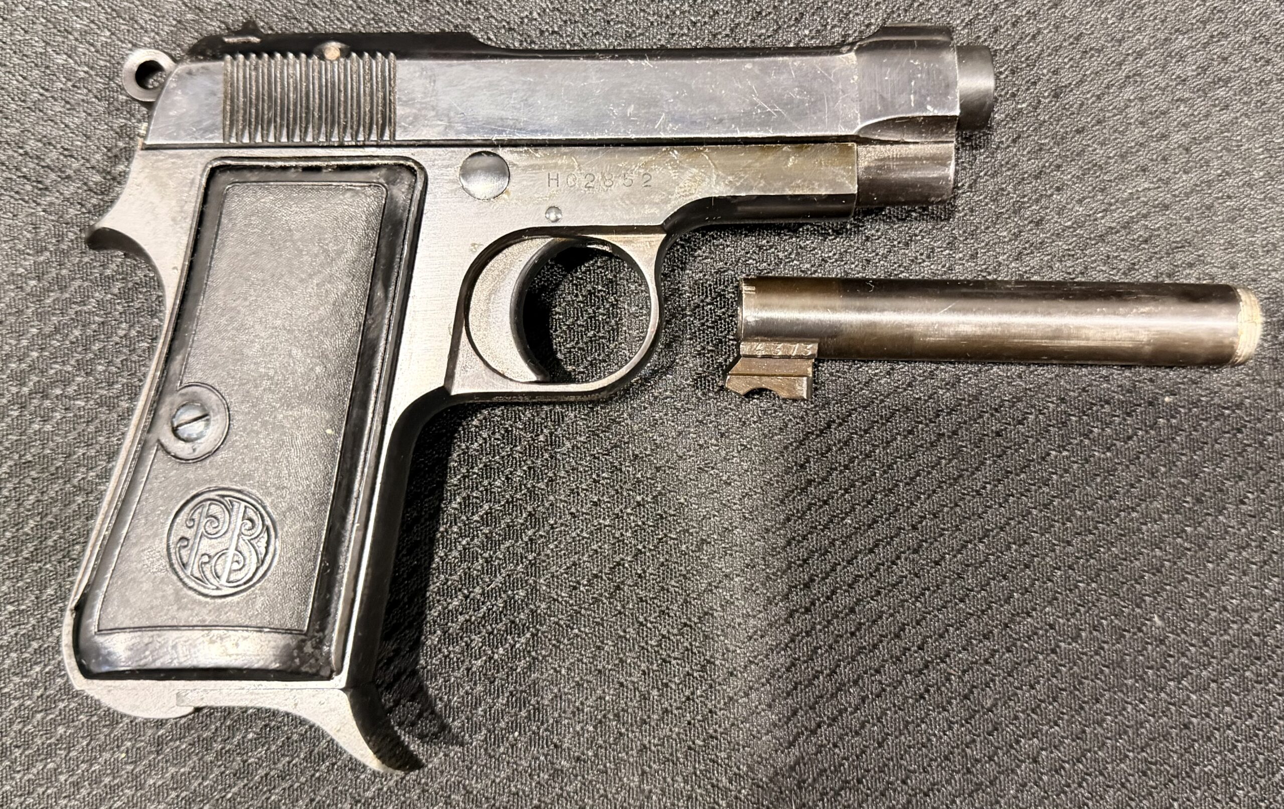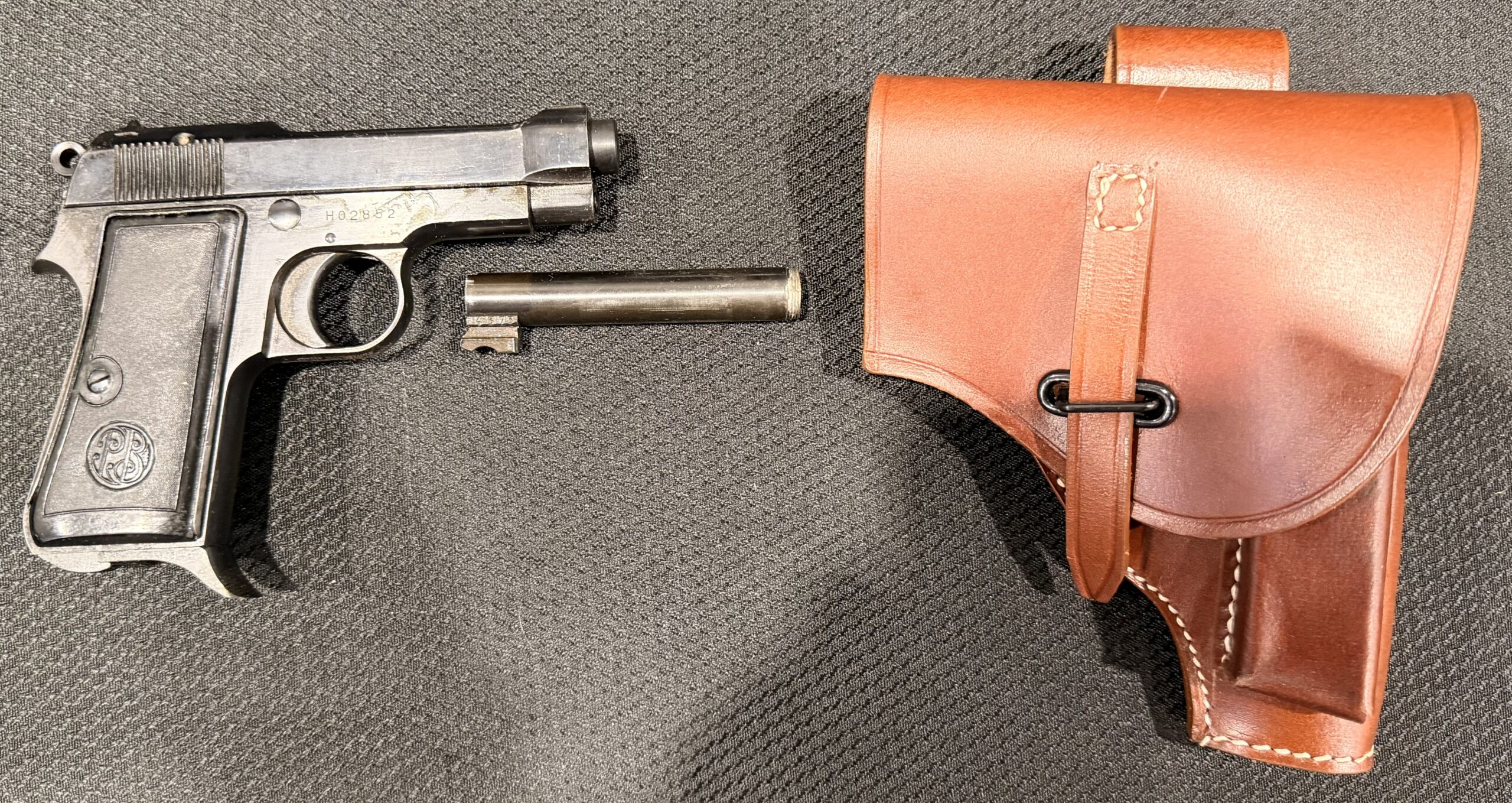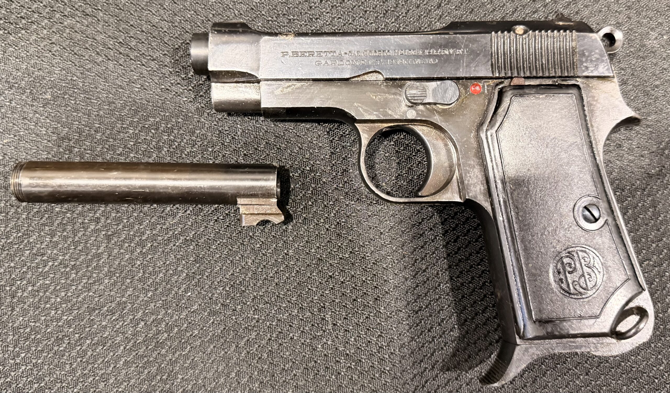 This pistol features a new production barrel identical to the original and is in good condition, with minimal surface wear. The grips are also in very good condition. The bore is brand new. The pistol is 100% functional and comes with one magazine.Includes a new barrel, an extra non-matching threaded barrel, and a Beretta M1934 holster — a high-quality reproduction made from genuine leather with steel hardware.