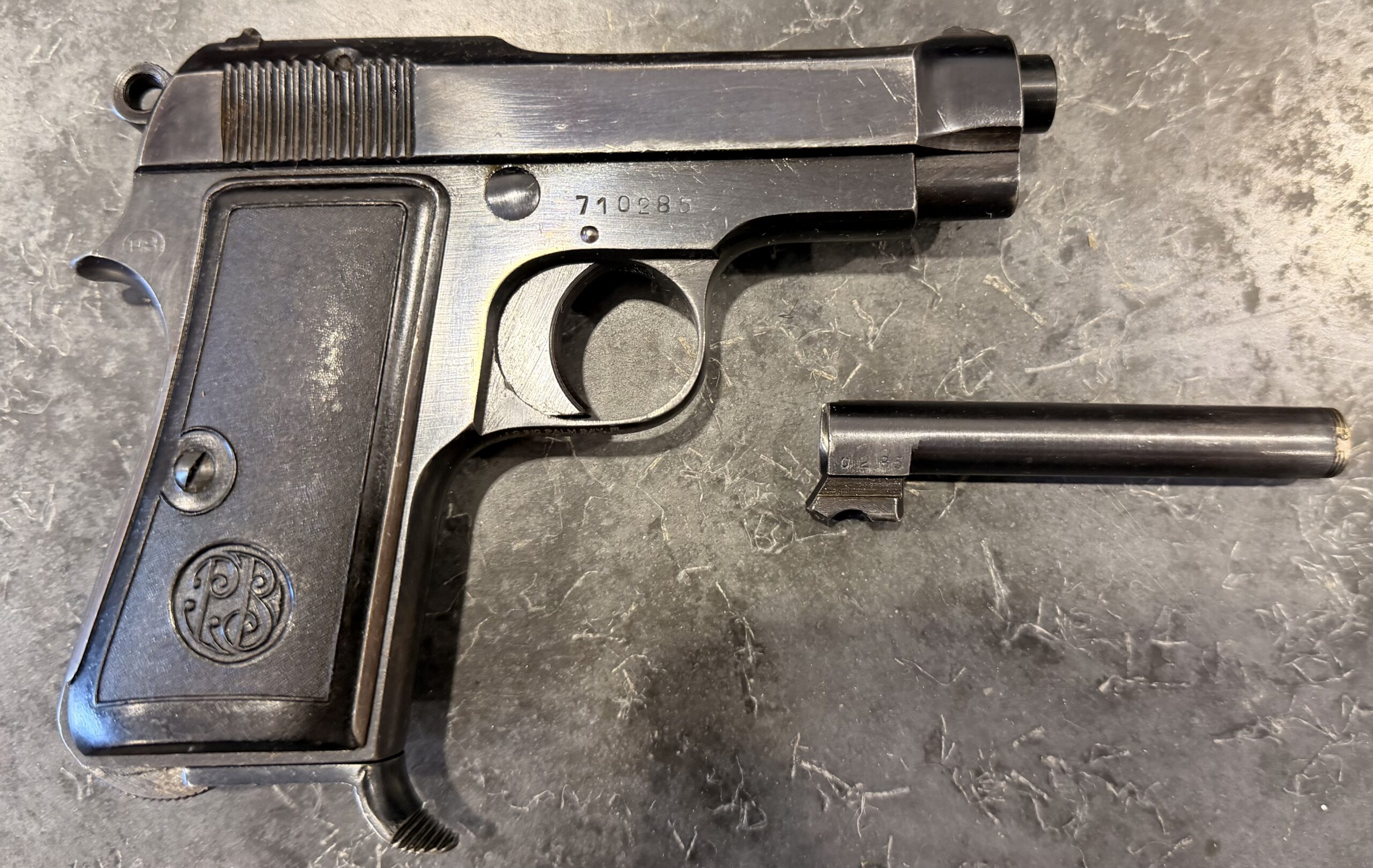 Beretta M1935 pistol chambered in .32 ACP/7.65, serial number 710285. This pistol features a new production barrel, identical to the original. It is in very good condition, with minimal surface wear. The grips are also in very good condition. The bore is brand new. The pistol is 100% functional and comes with one magazine. It is eligible for purchase by C&R holders, as it retains its original configuration.