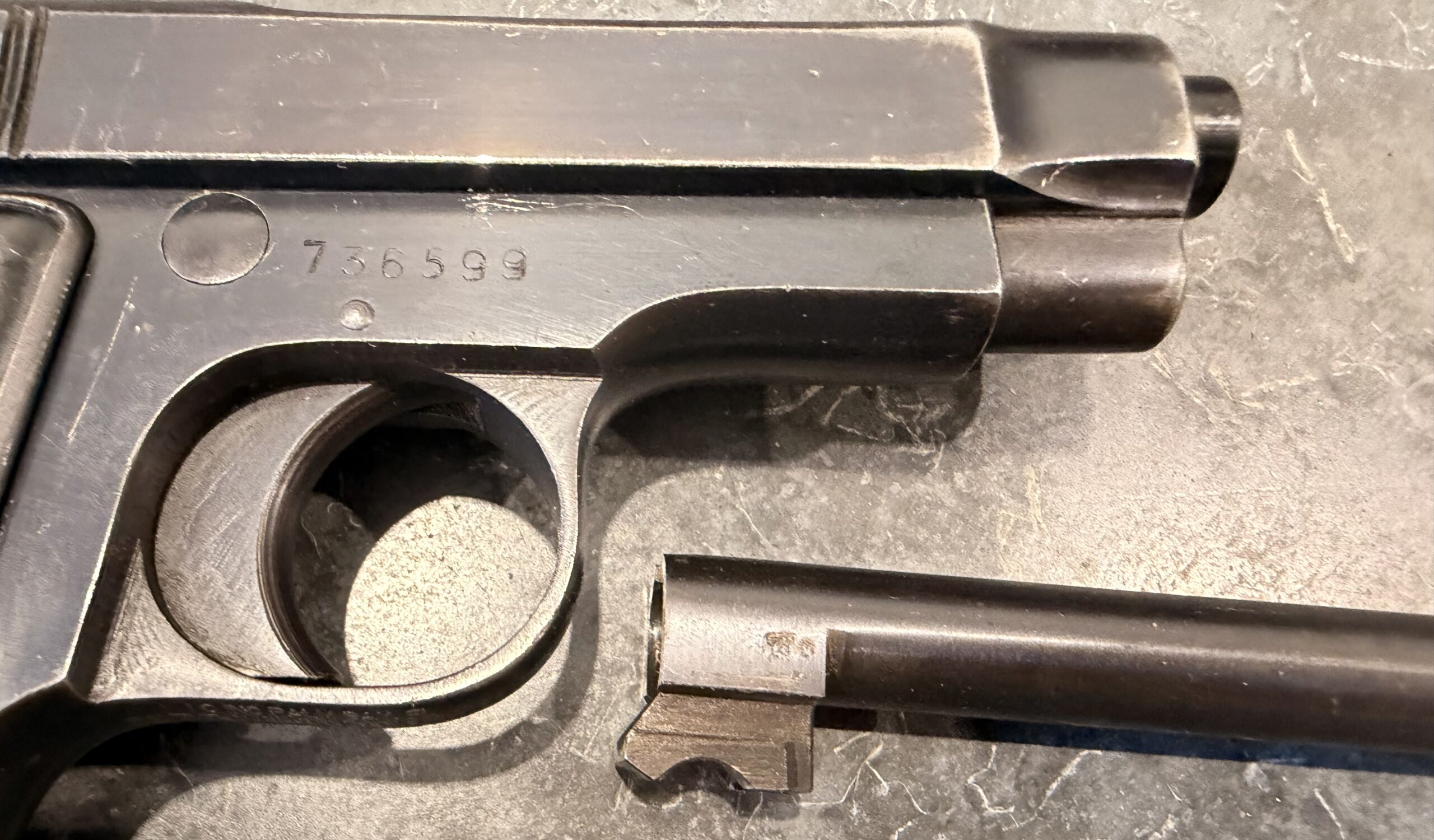 Beretta M1935 pistol chambered in .32 ACP/7.65, serial number 736599. This pistol features a new production barrel, identical to the original. It is in very good condition, with minimal surface wear. The grips are also in very good condition. The bore is brand new. The pistol is 100% functional and comes with one magazine. It is eligible for purchase by C&R holders, as it retains its original configuration.