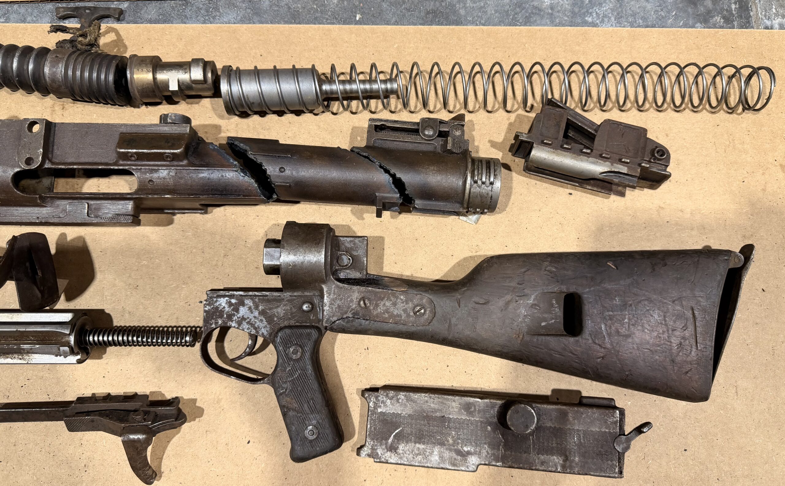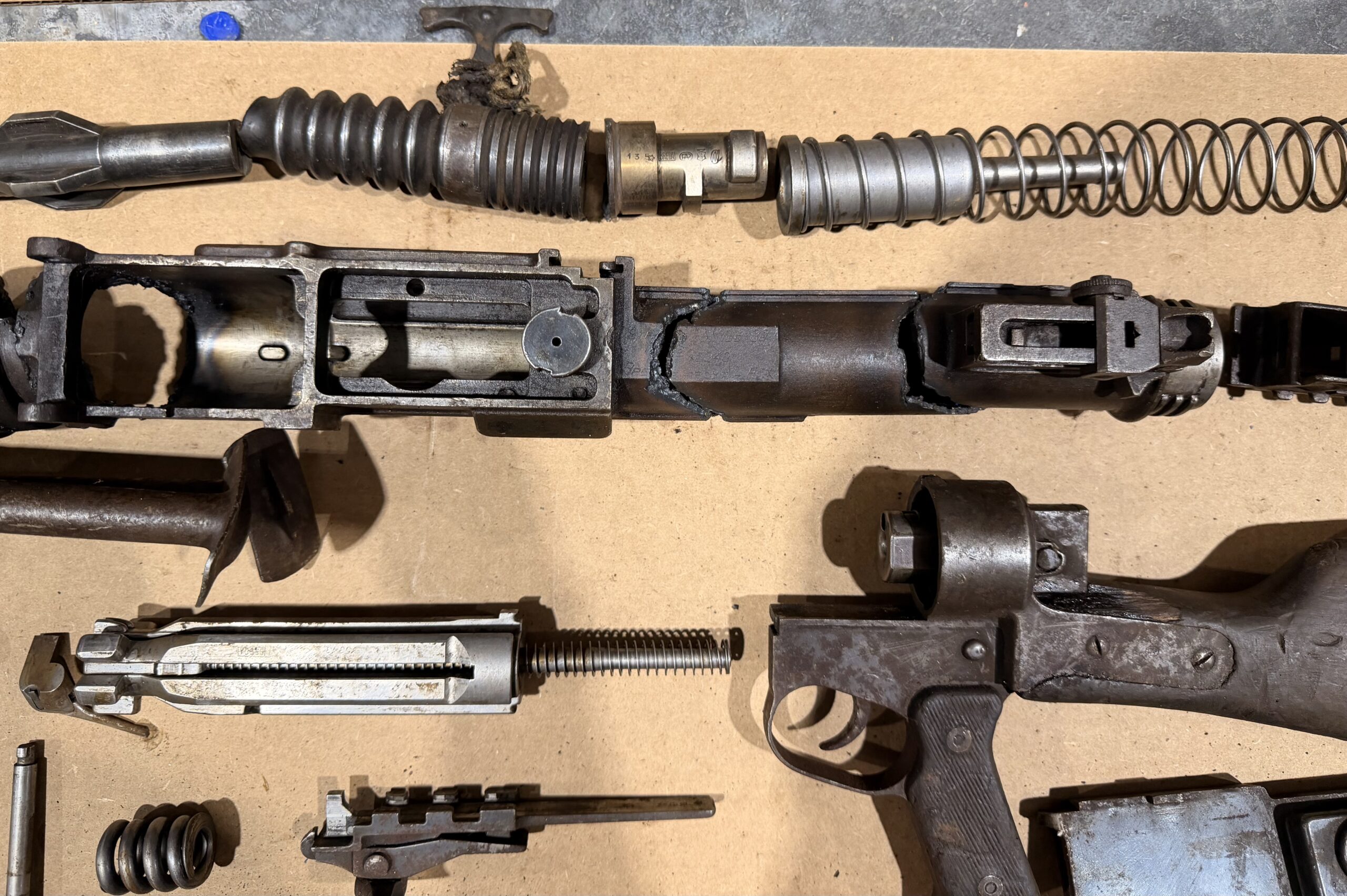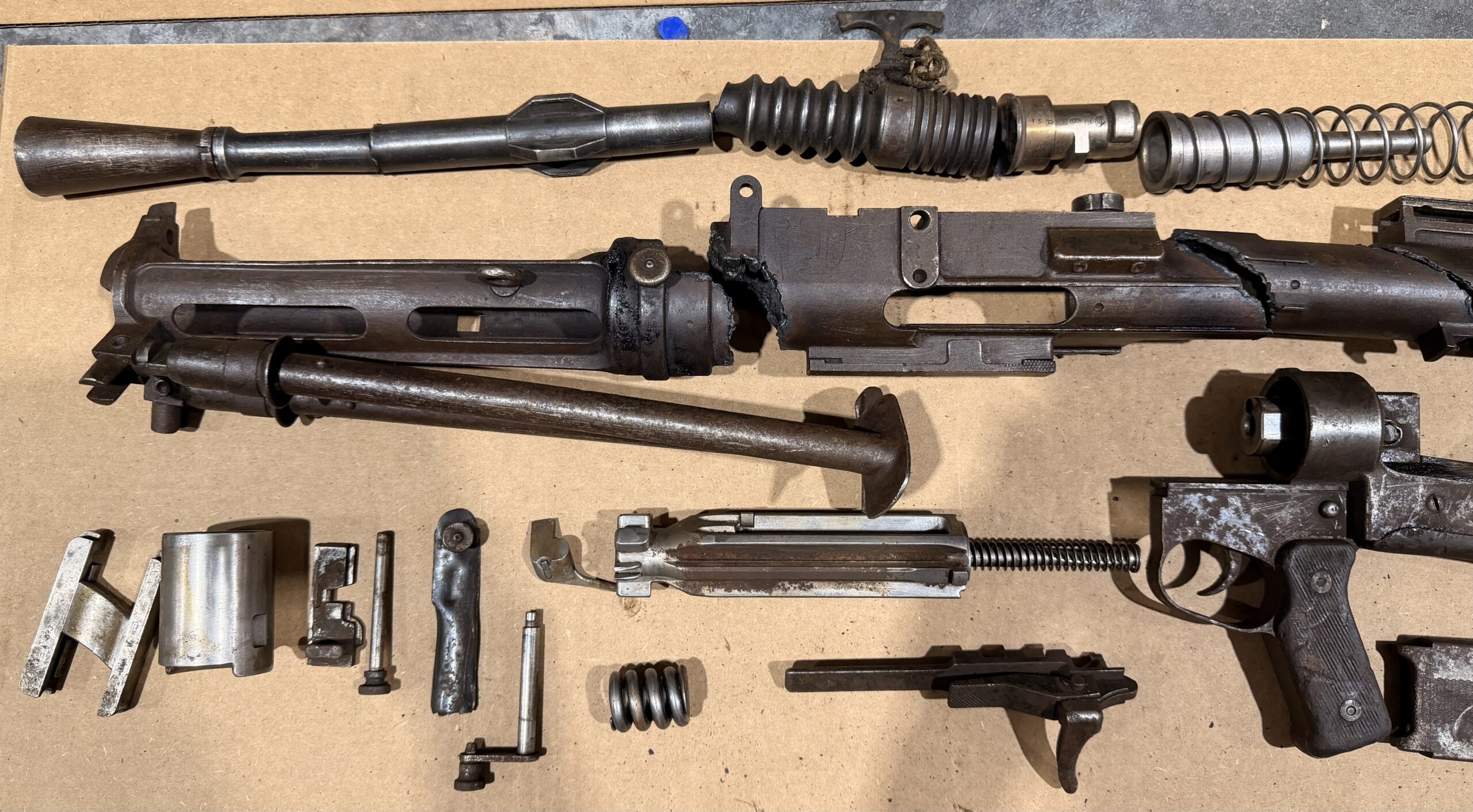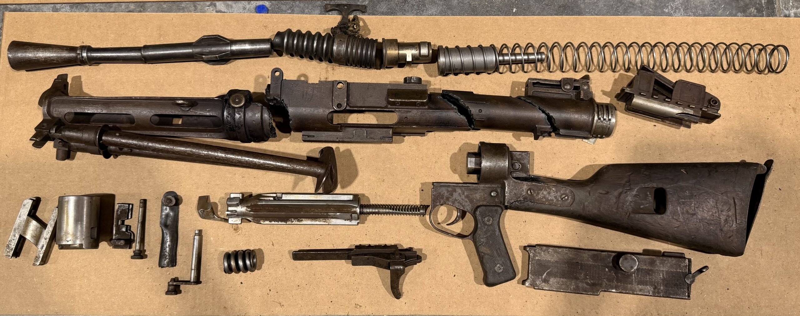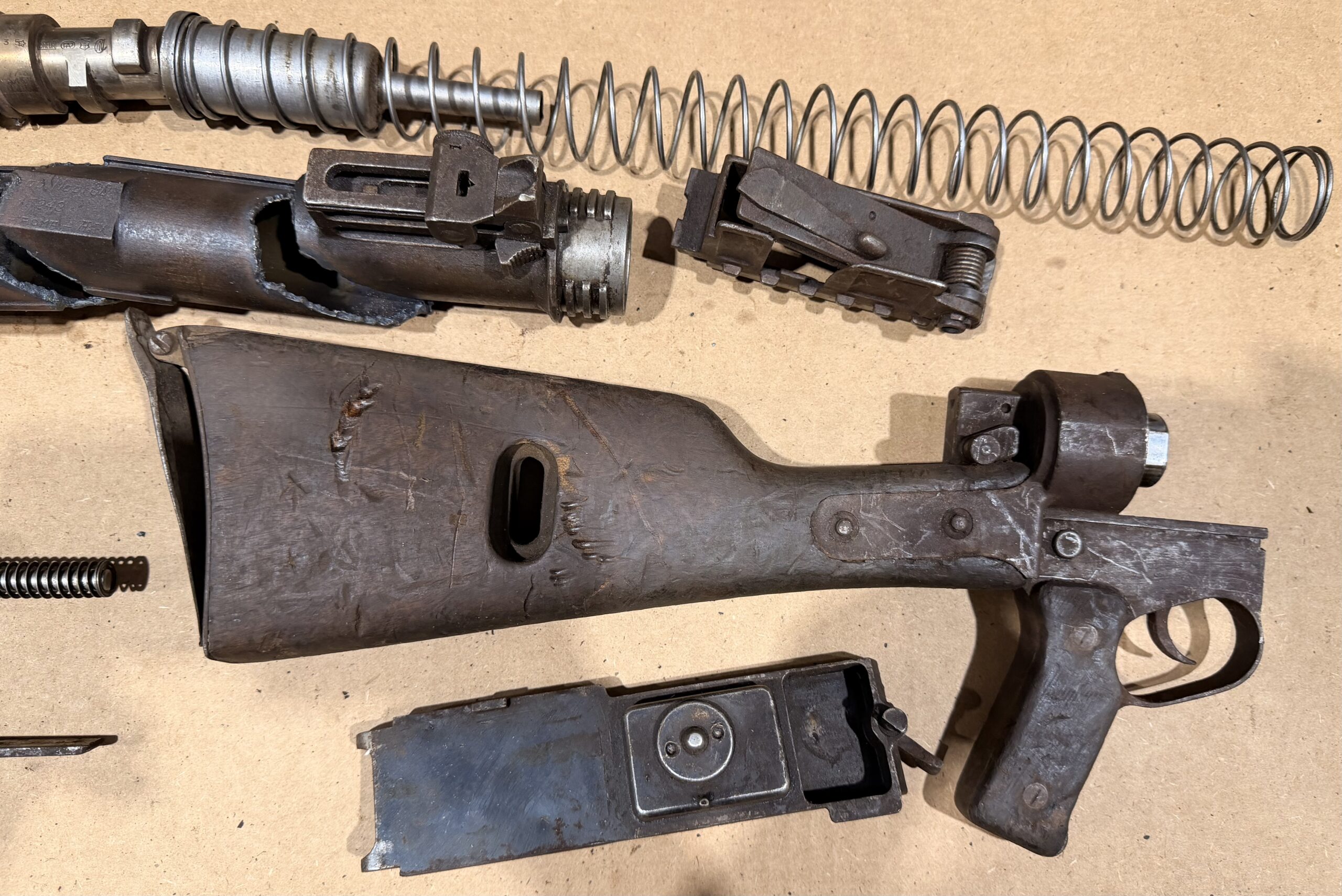This parts kit is in fair to good condition. The remaining portion of the serial number present is “15343.” The receiver has been torch-cut. This kit is mostly complete and includes all parts shown. The exact kit pictured is the one you will receive, so please review the photos carefully. It includes most of the small components. Please note that the top cover has some dents, the closing lever is slightly bent, and the dust cover is bent. The rear sight is 100% functional. The wood is in fair to good condition, with one small crack at the top left of the stock. This parts kit includes original-condition cut barrel sections.