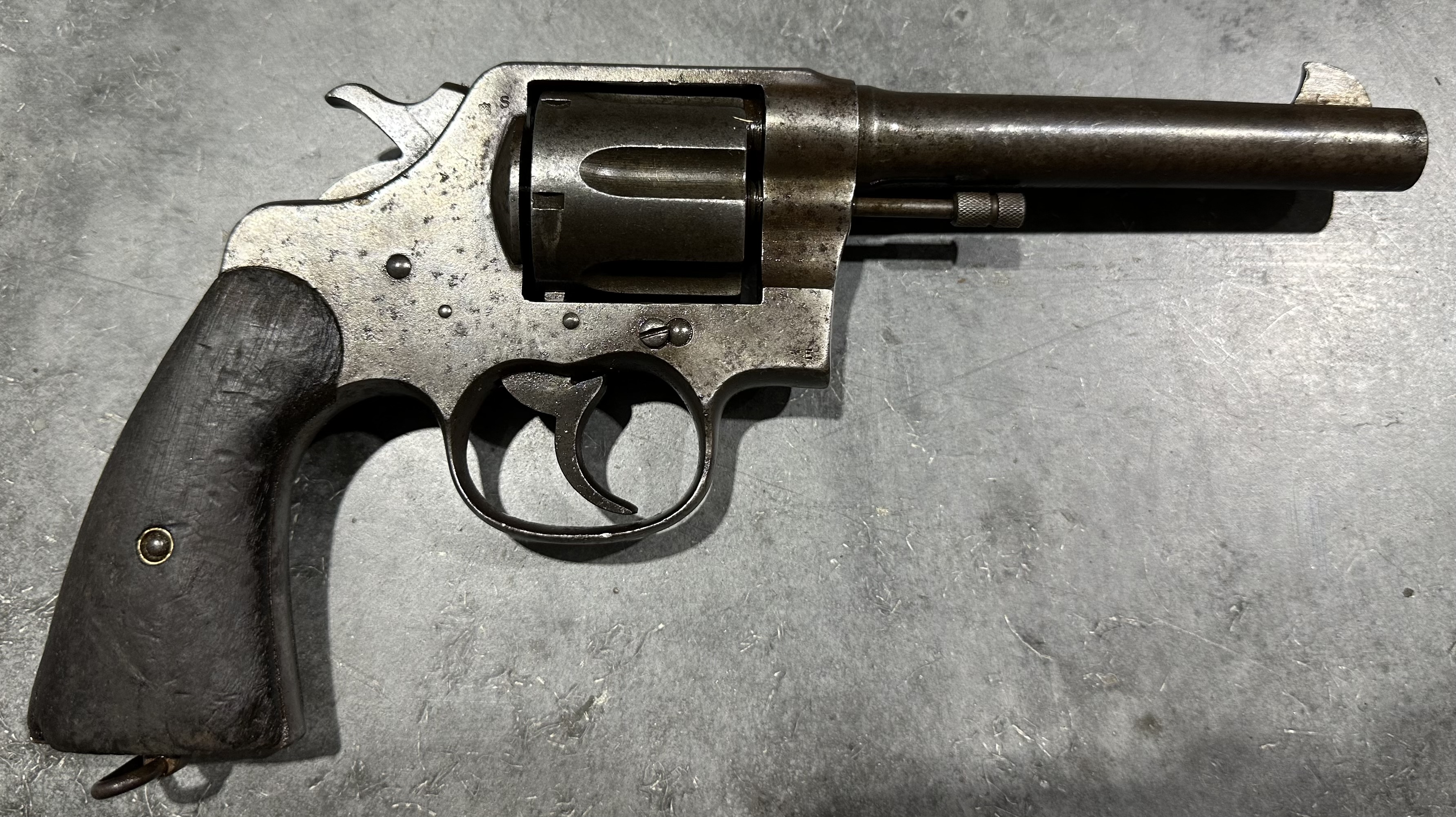 This revolver is in fair overall condition. The bore is in poor condition. Please note that the trigger is non-functional — both single and double action will need to be repaired. The firing pin is broken.