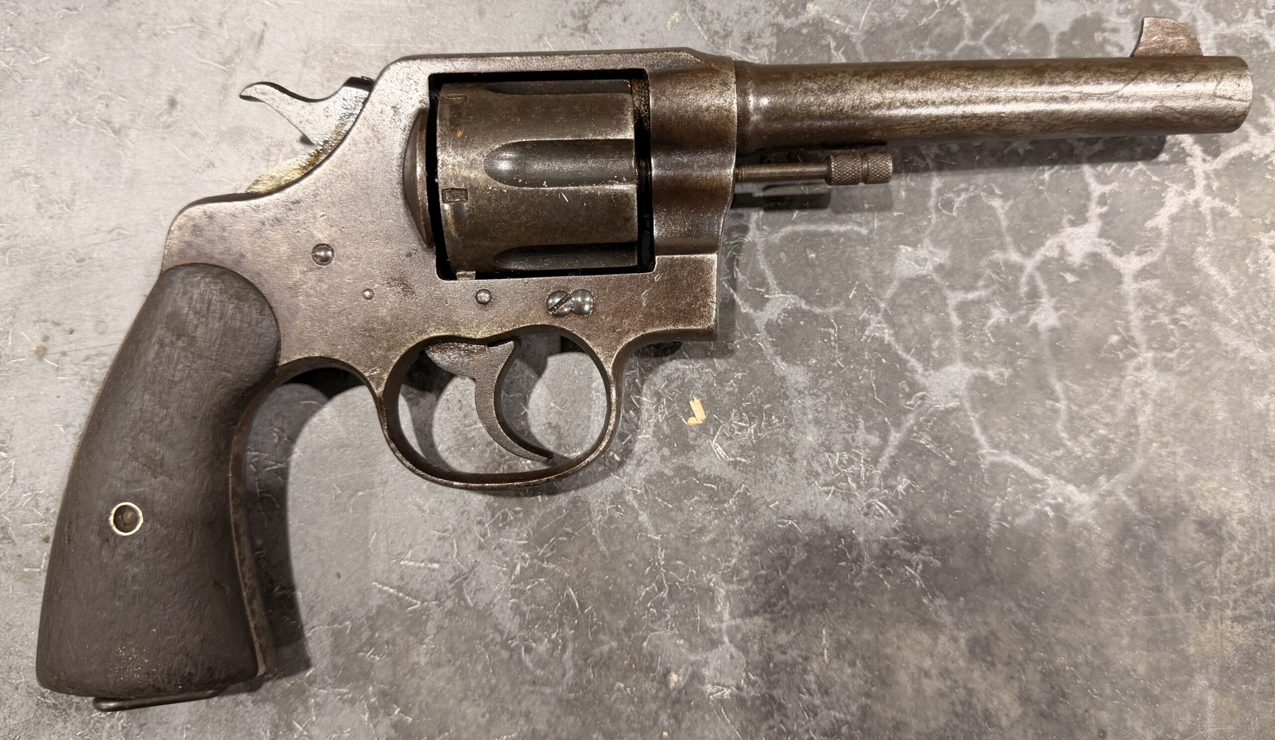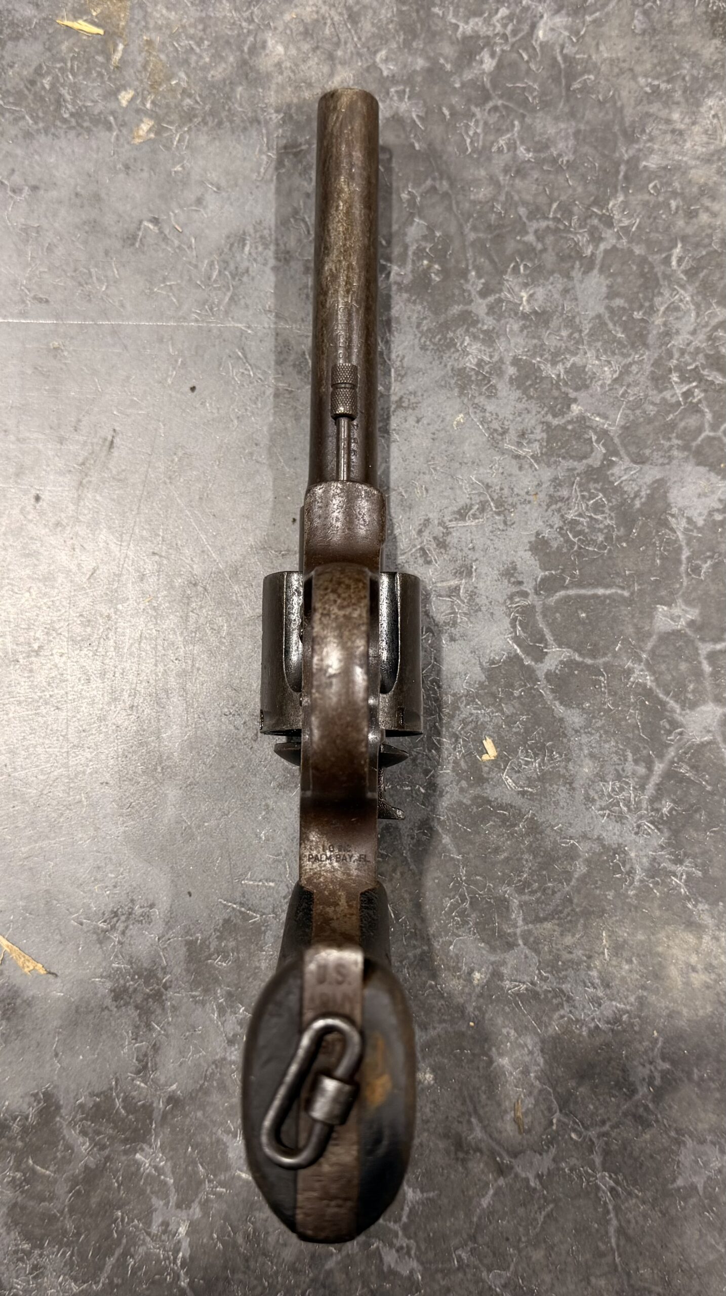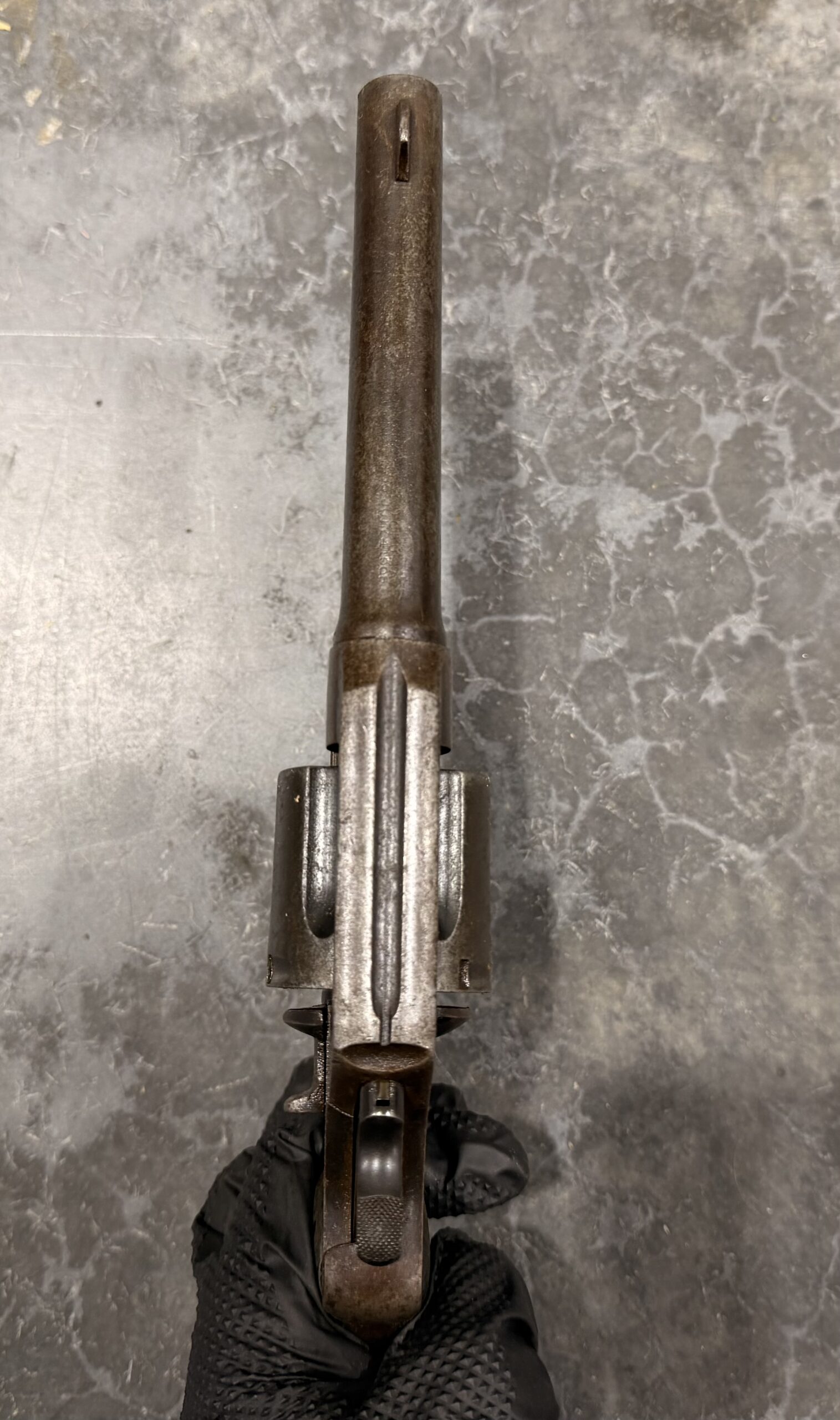 This revolver is in fair overall condition. The bore is in poor condition. Please note that the double- and single-action functions are operational, but the trigger return spring is weak. The cylinder timing is slightly loose.