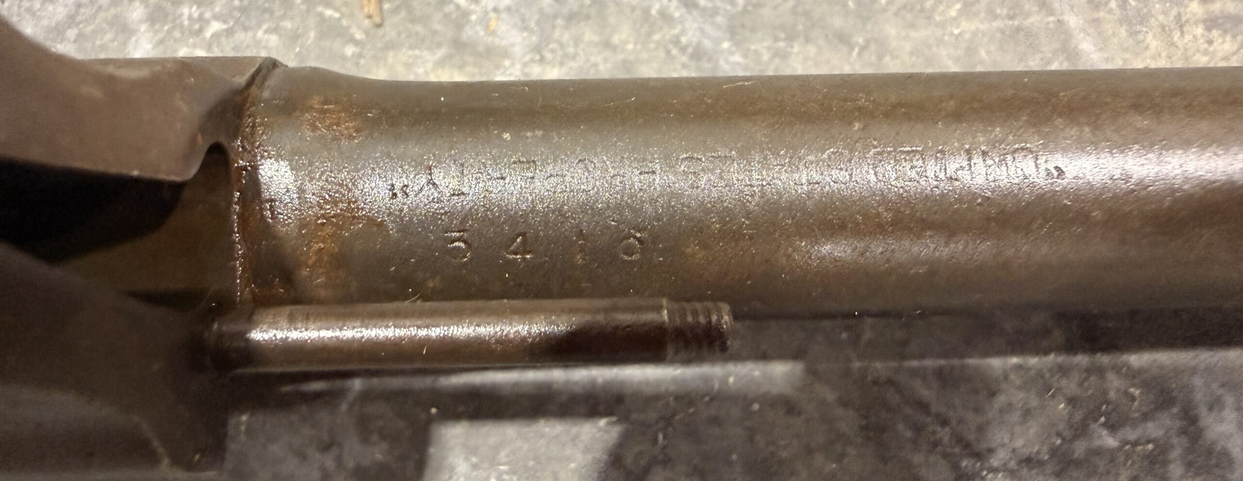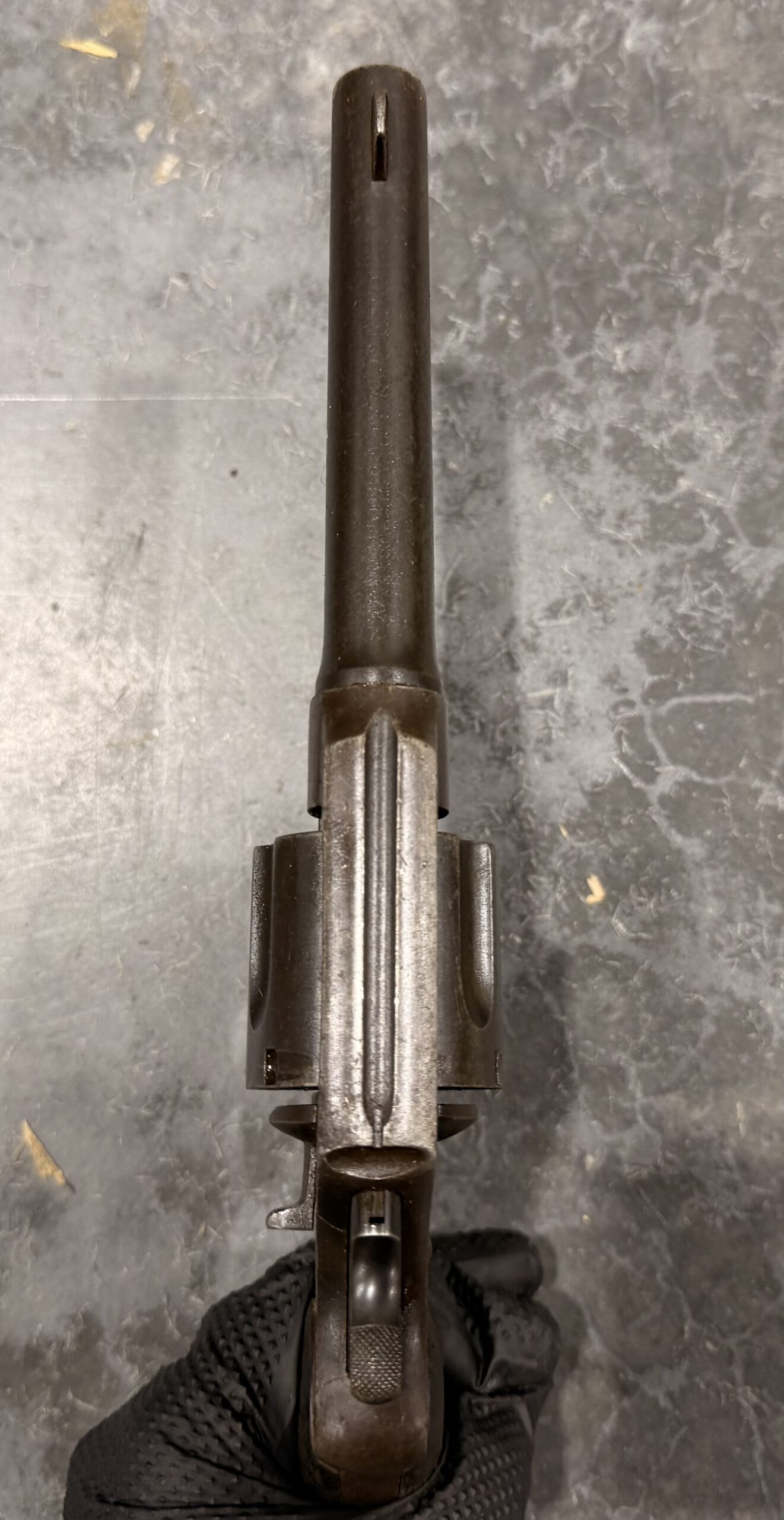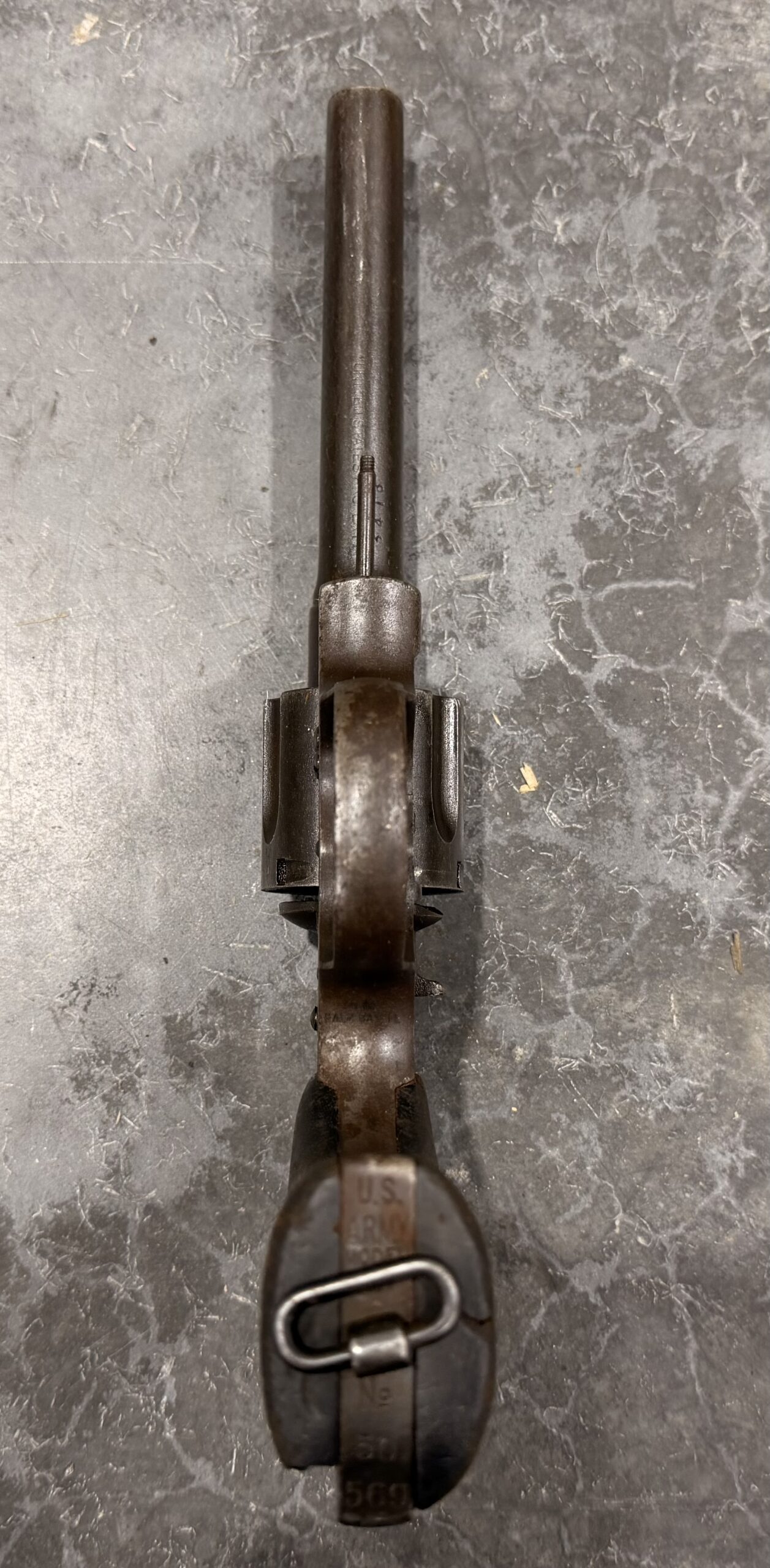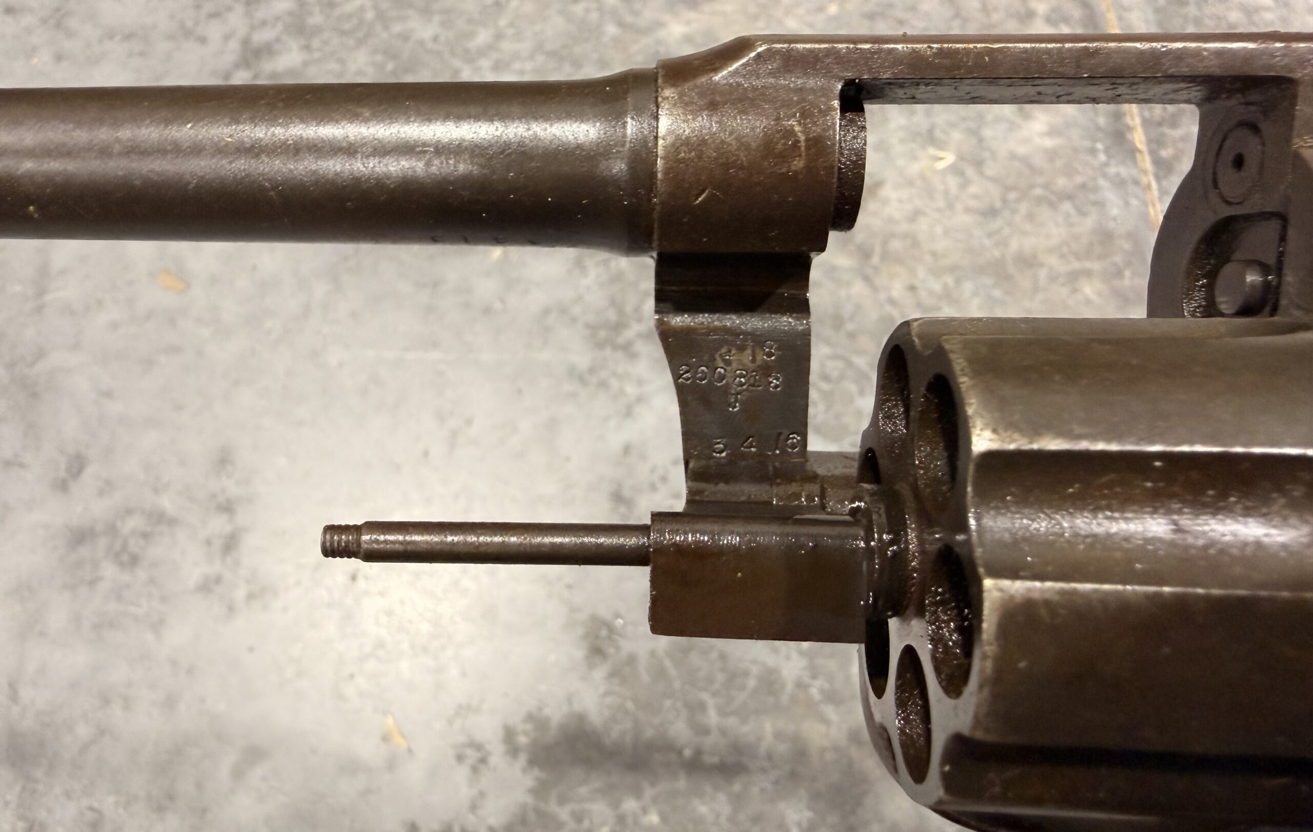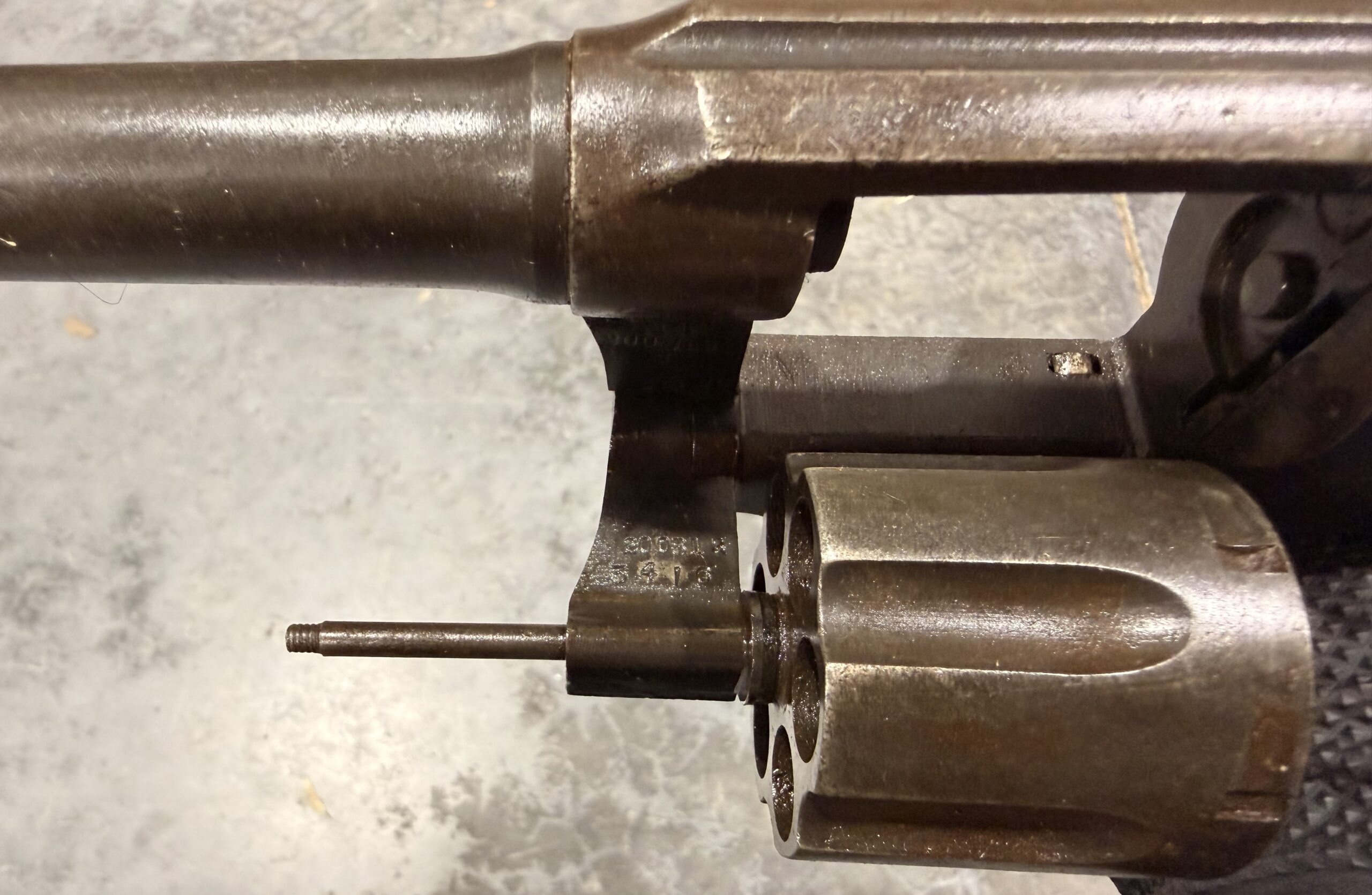 This revolver is in fair overall condition. The bore is in poor to fair condition. Please note that the double- and single-action functions are operational, but the trigger return spring is weak. The cylinder indexing spring does not engage the cylinder, so the cylinder does not lock in place.