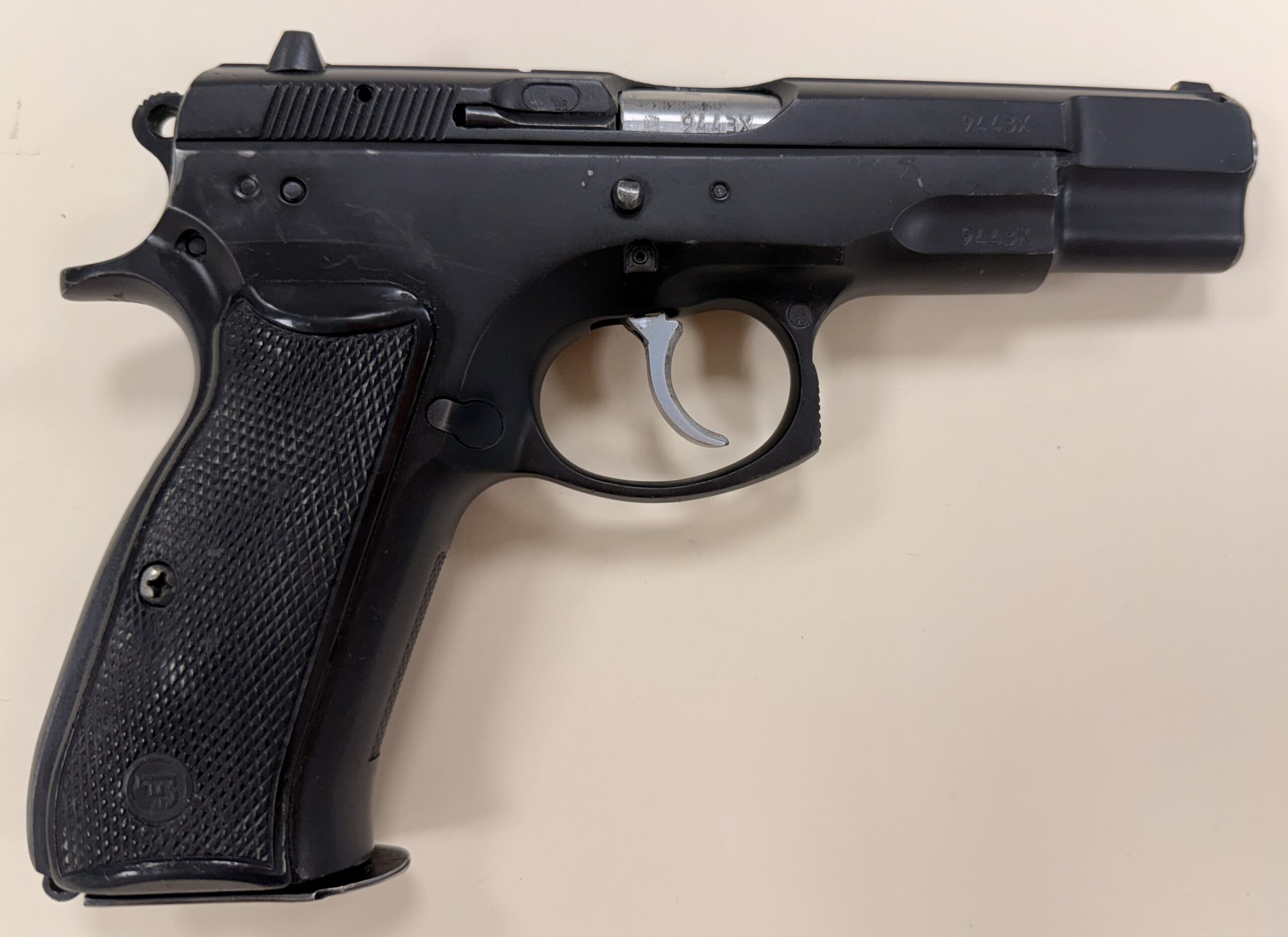 Czech CZ75 BD POLICE, chambered in 9mm Luger, serial number 9443X. This pistol is in very good overall condition with minimal surface wear. The grips are clean and solid with no cracks, and the bore is in very good condition with strong, sharp rifling.