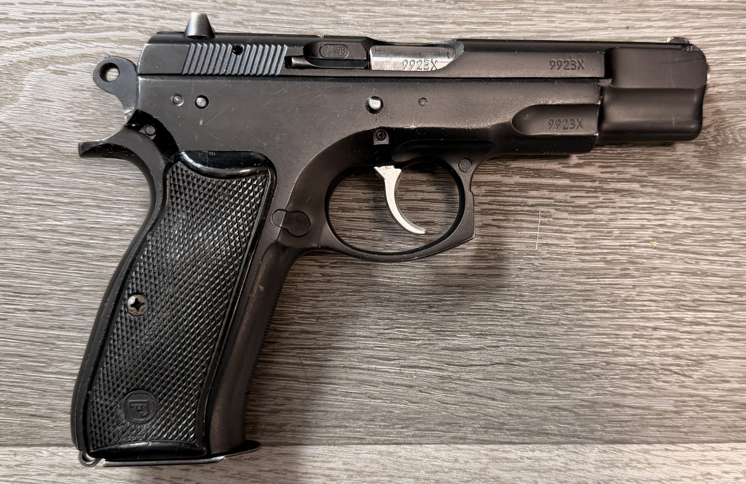 Czech CZ75 BD POLICE, chambered in 9mm Luger, serial number 9923x. This pistol is in very good overall condition with minimal surface wear. The grips are clean and solid with no cracks, and the bore is in very good condition with strong, sharp rifling.