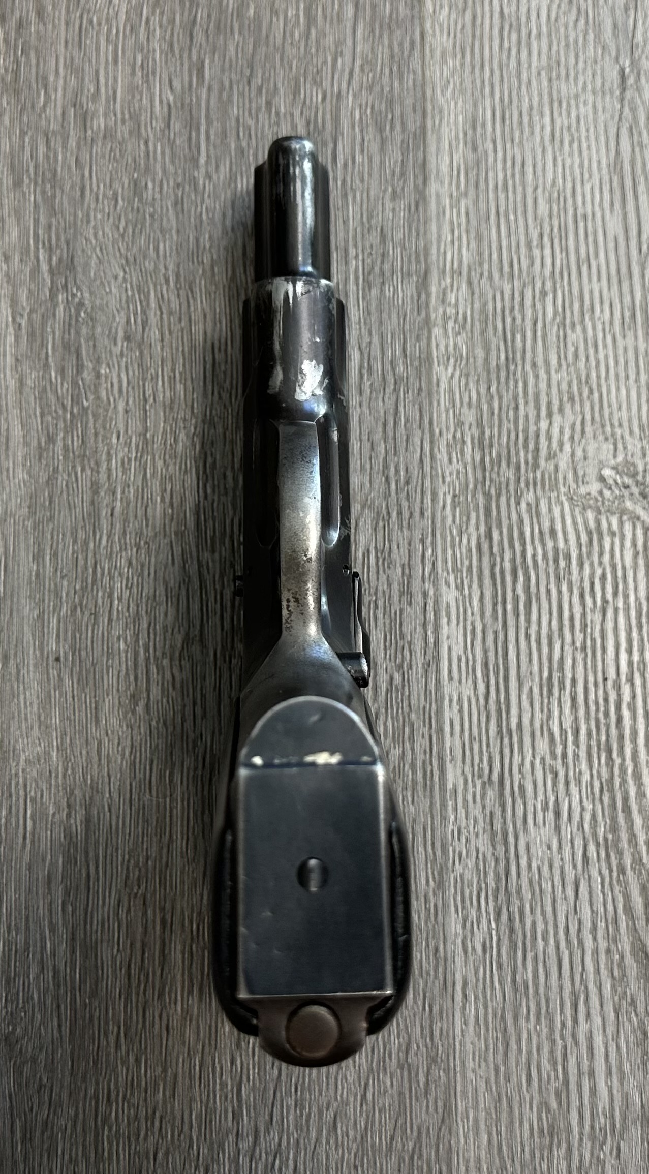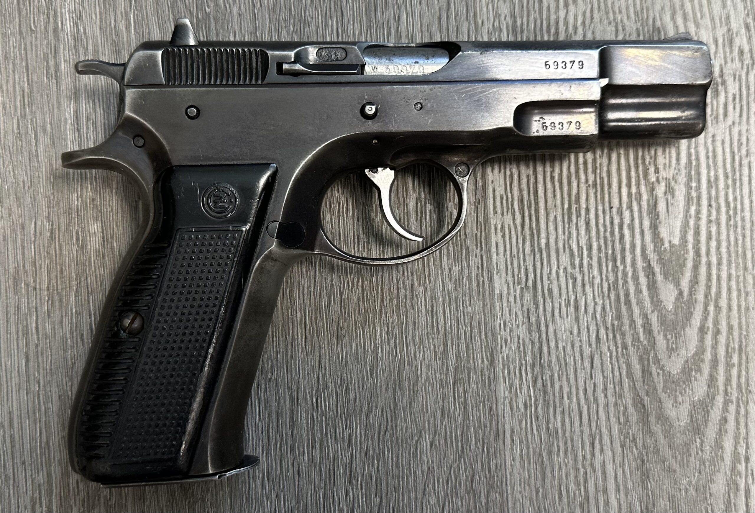 Czech CZ75 pistol chambered in 9MM Luger, serial number 69379. This pistol is in good condition, with some surface wear. The grips are also in good condition with no cracks. The bore is very good with strong grooves. The pistol is numbers matching frame and slide. The pistol is 100% functional and comes with one magazine. The pistol is import marked on the rear strap underneath the hammer on the frame. Comes with 1 magazine.