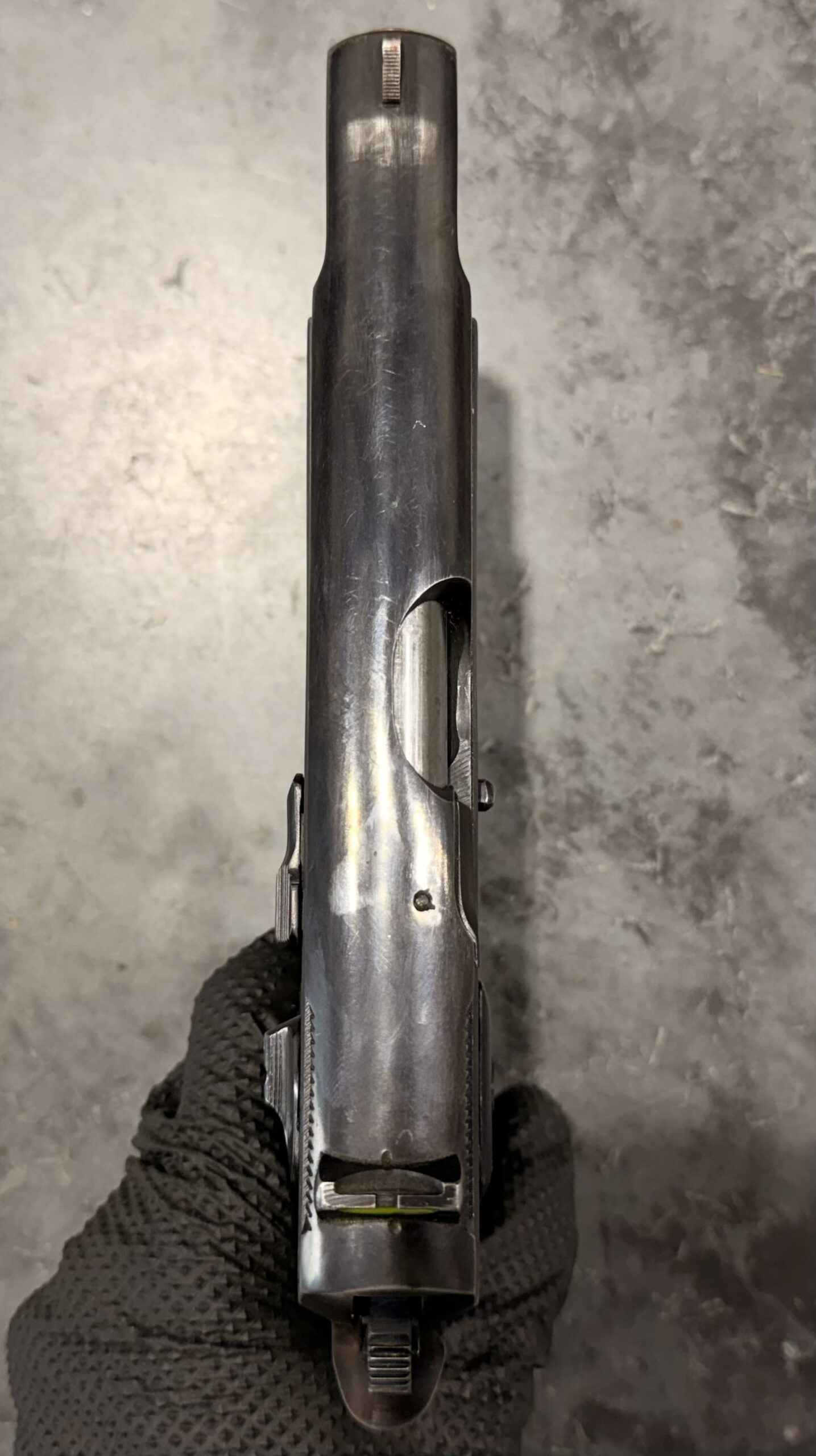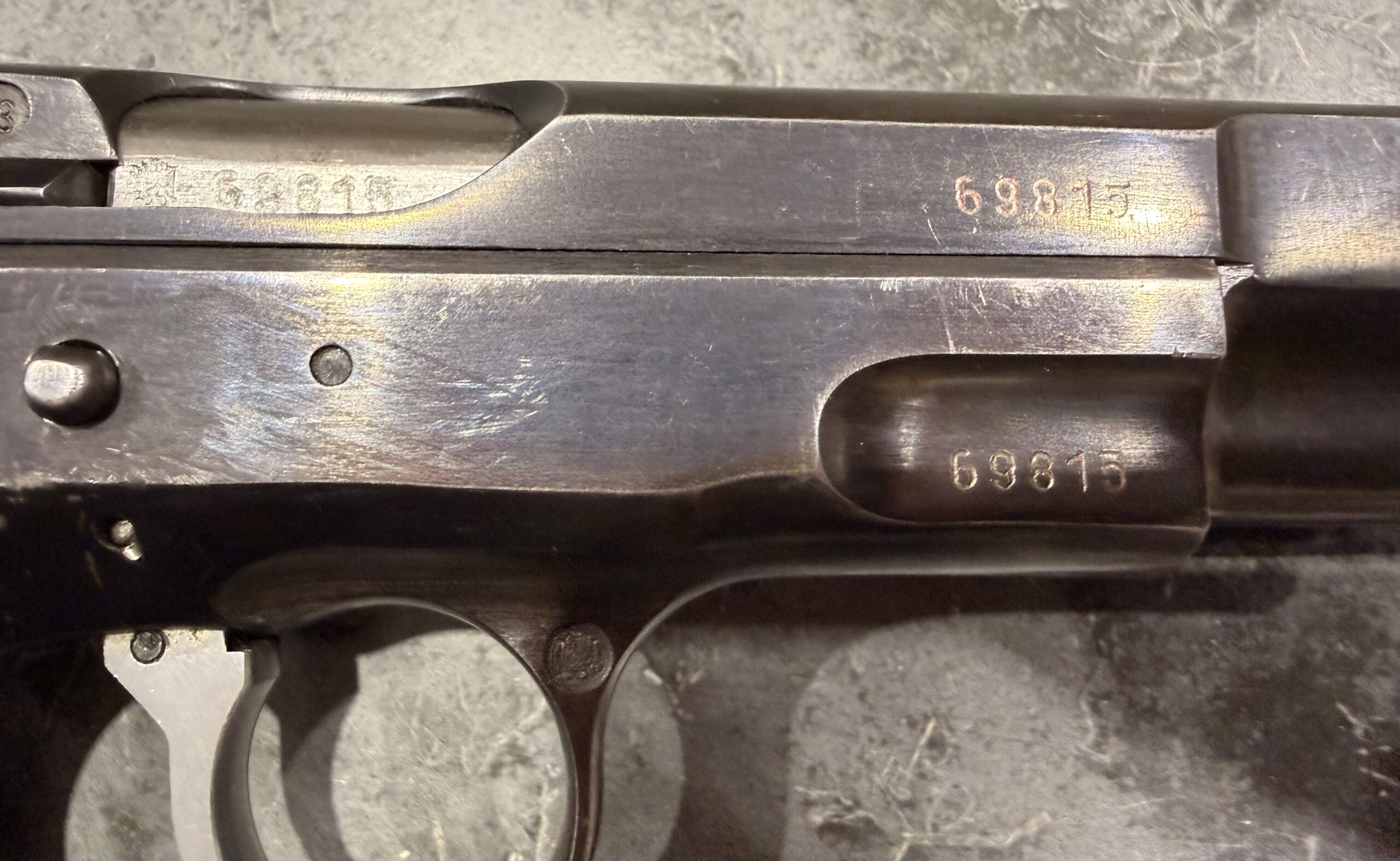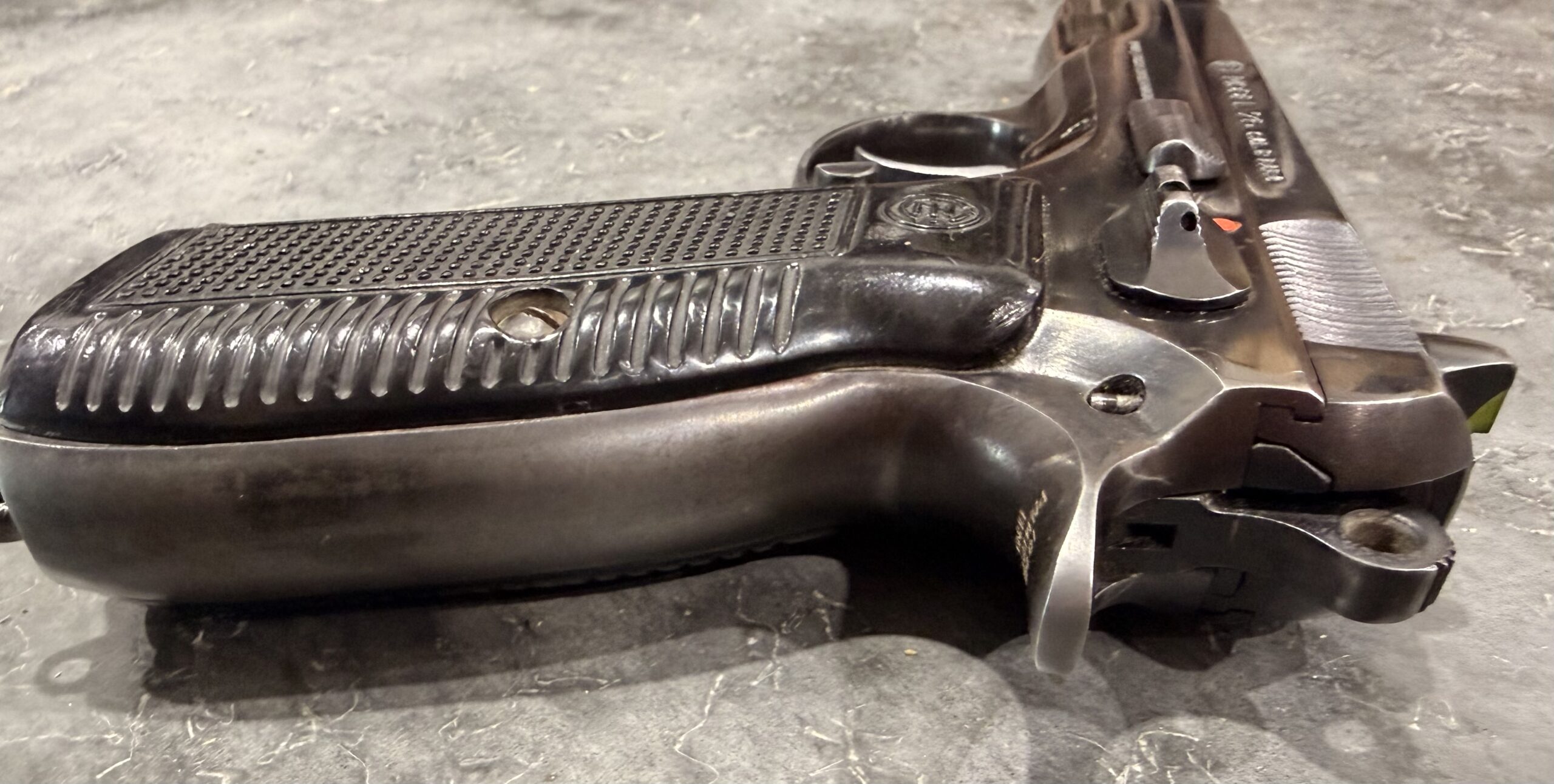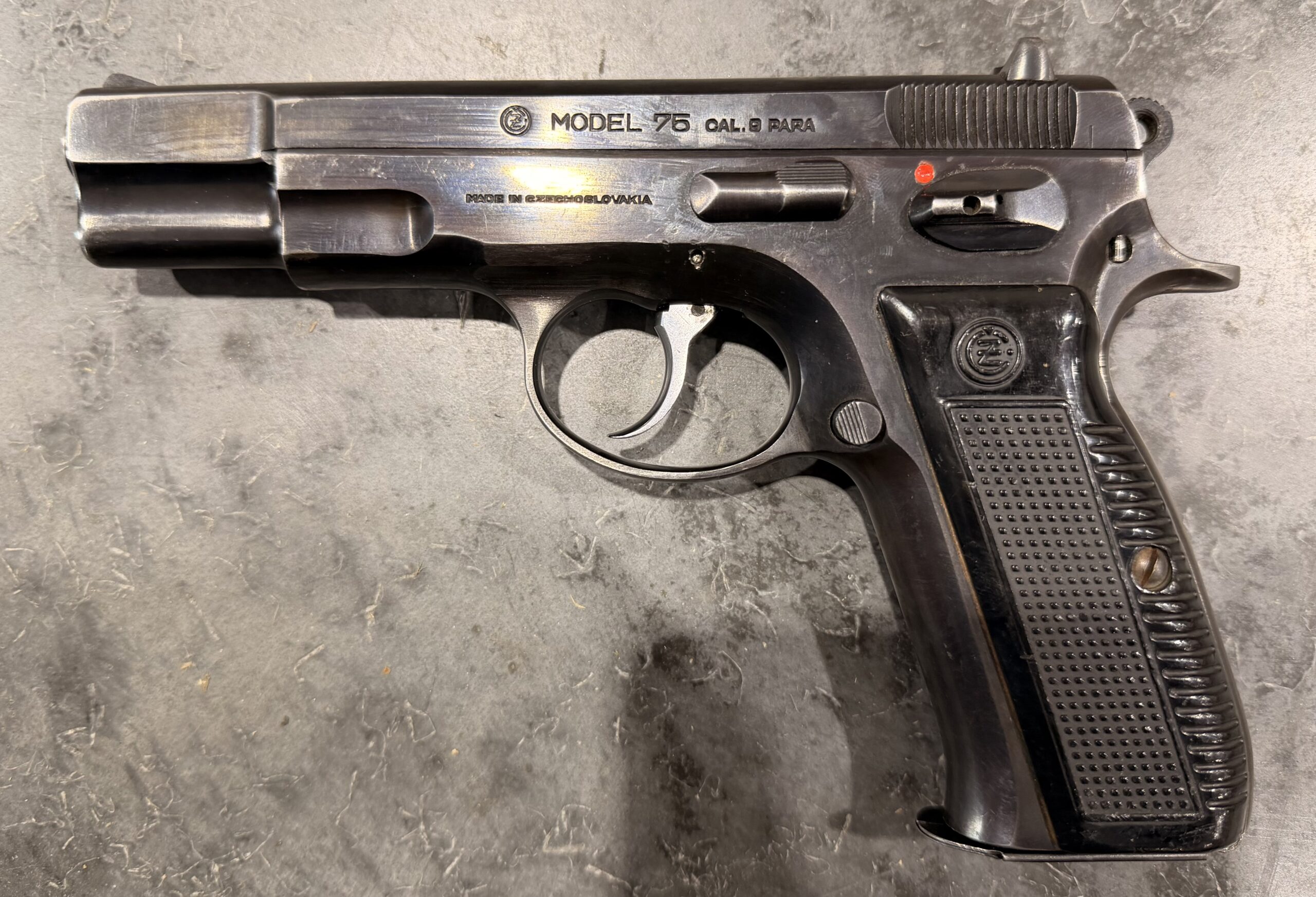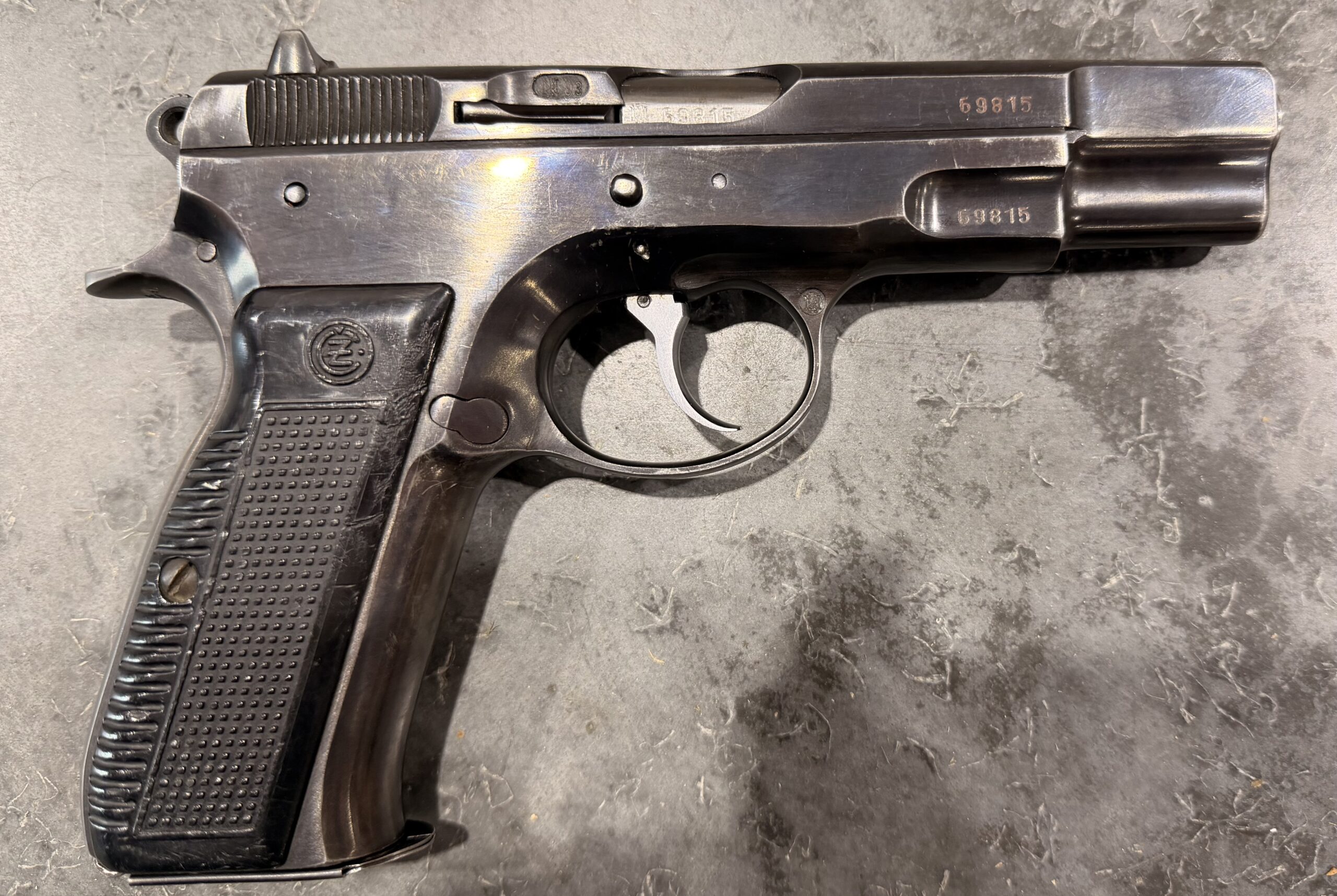 Czech CZ75 pistol chambered in 9MM Luger, serial number 69815. This pistol is in good condition, with some light surface wear. The grips are also in good condition with no cracks. The bore is very good with strong grooves. The pistol is numbers matching frame and slide. The pistol is 100% functional and comes with one magazine. The pistol is import marked on the rear strap underneath the hammer on the frame. Comes with 1 magazine.