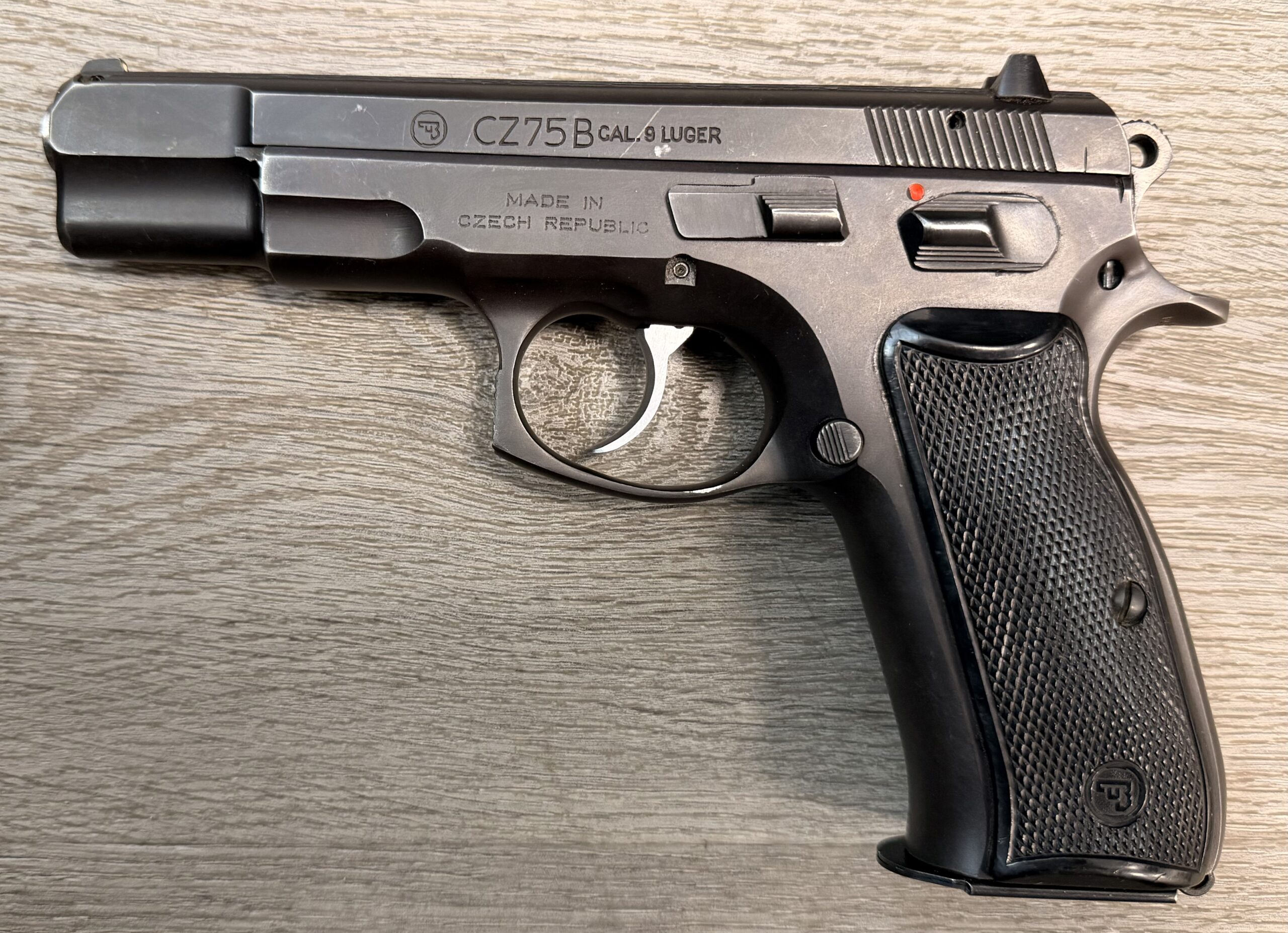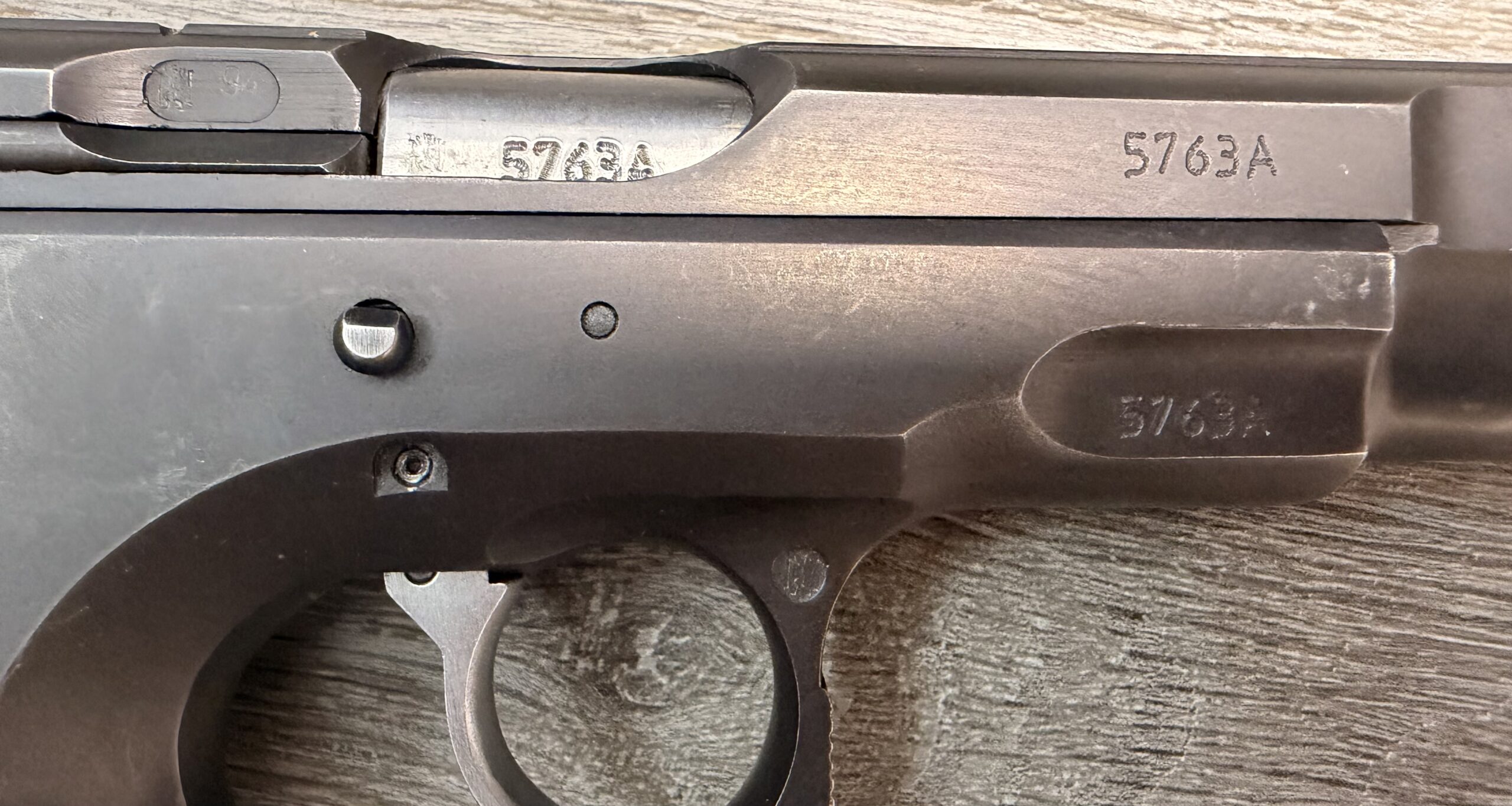 Czechoslovakian CZ75B pistol chambered in 9mm Luger (9x19mm), serial number 5763A.