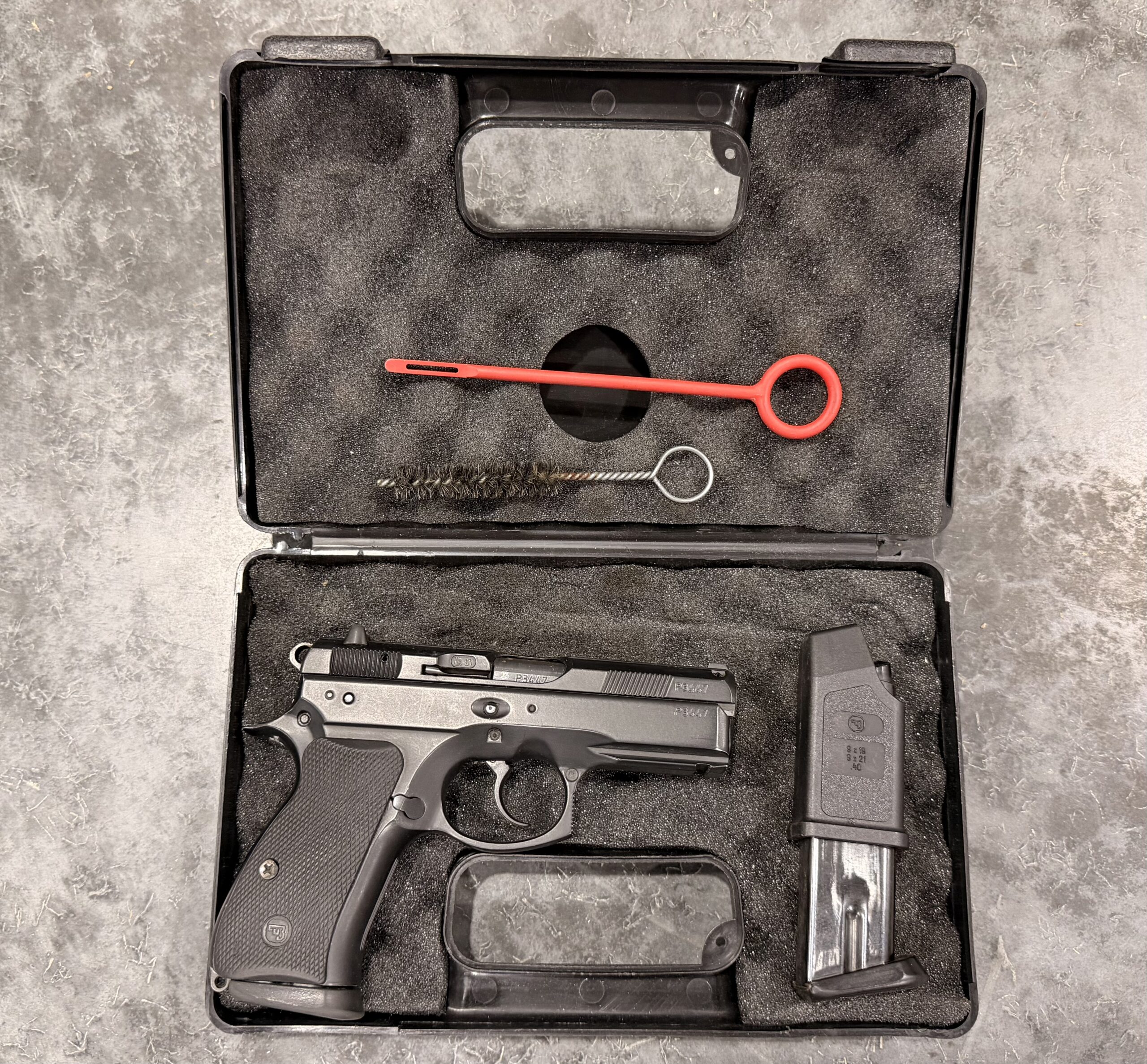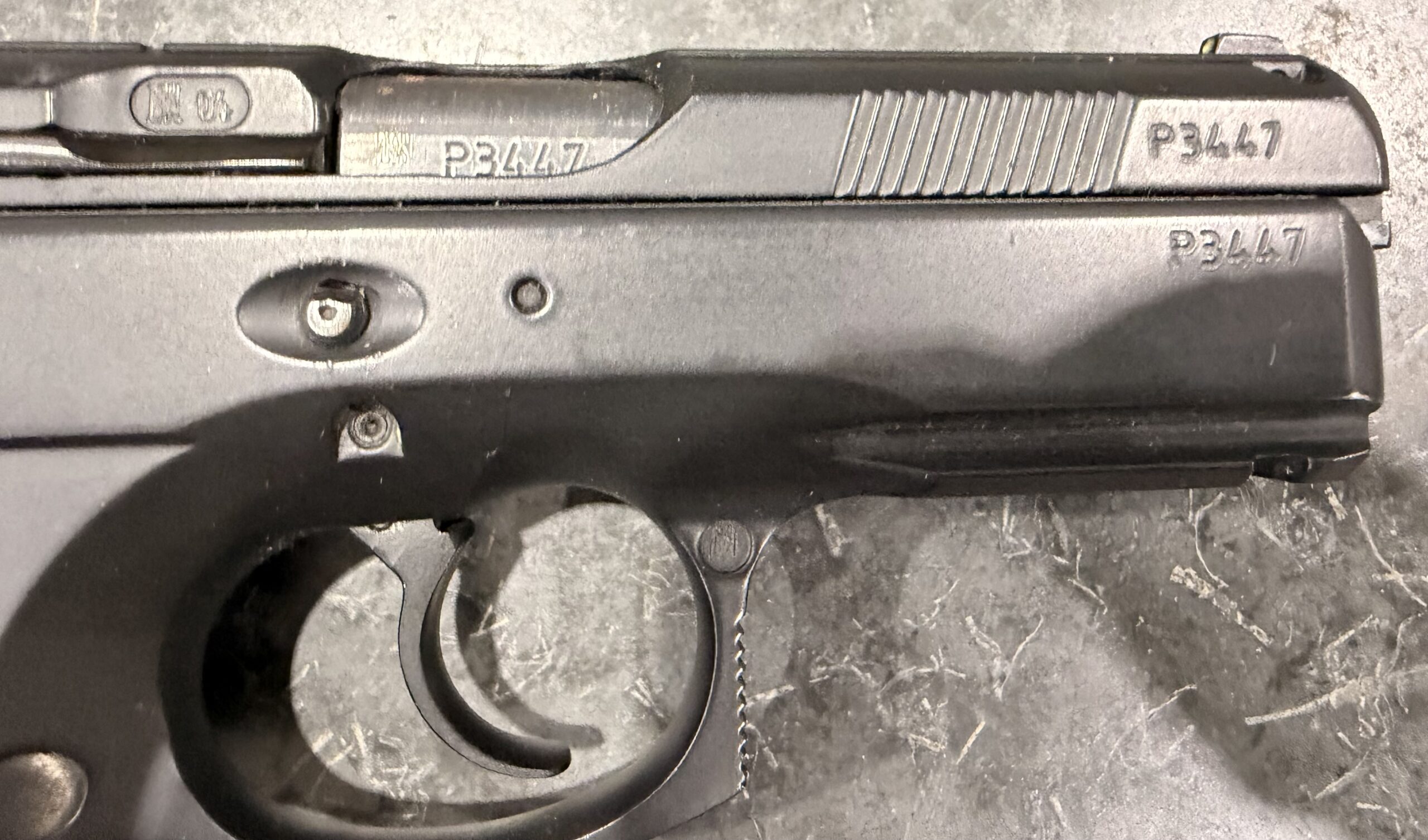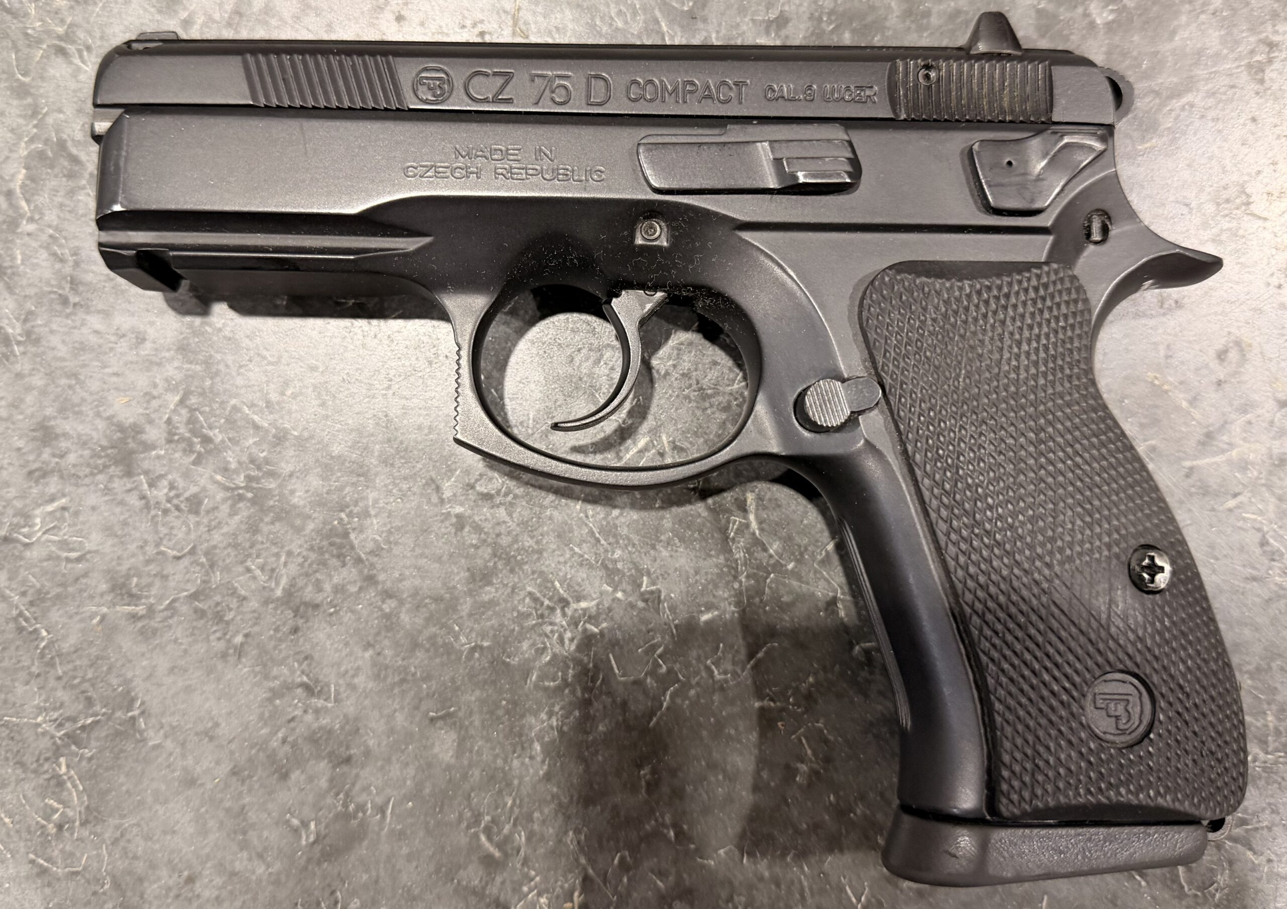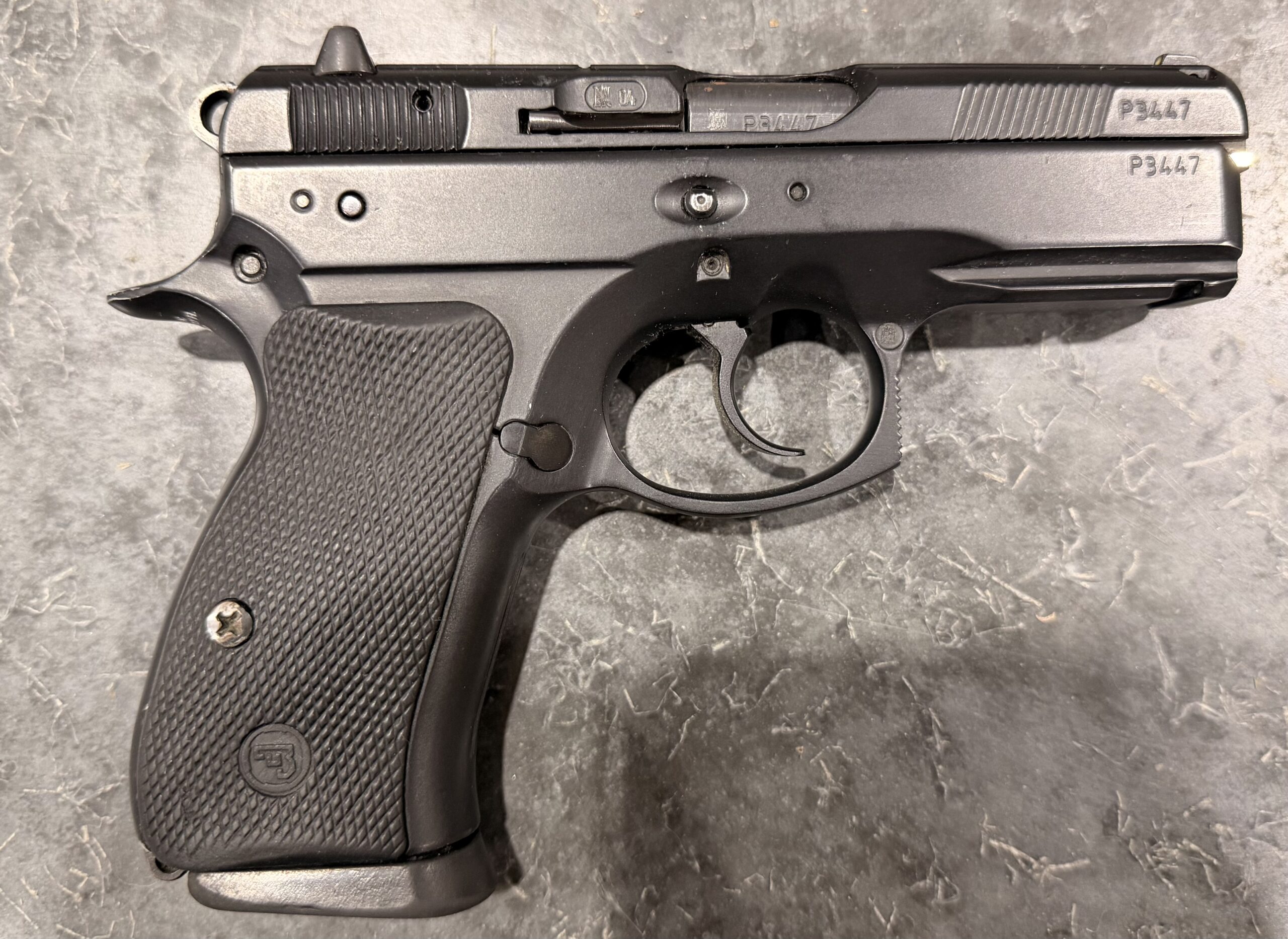 Czechoslovakian CZ75D Compact pistol chambered in 9mm Luger (9x19mm), serial number P3447.