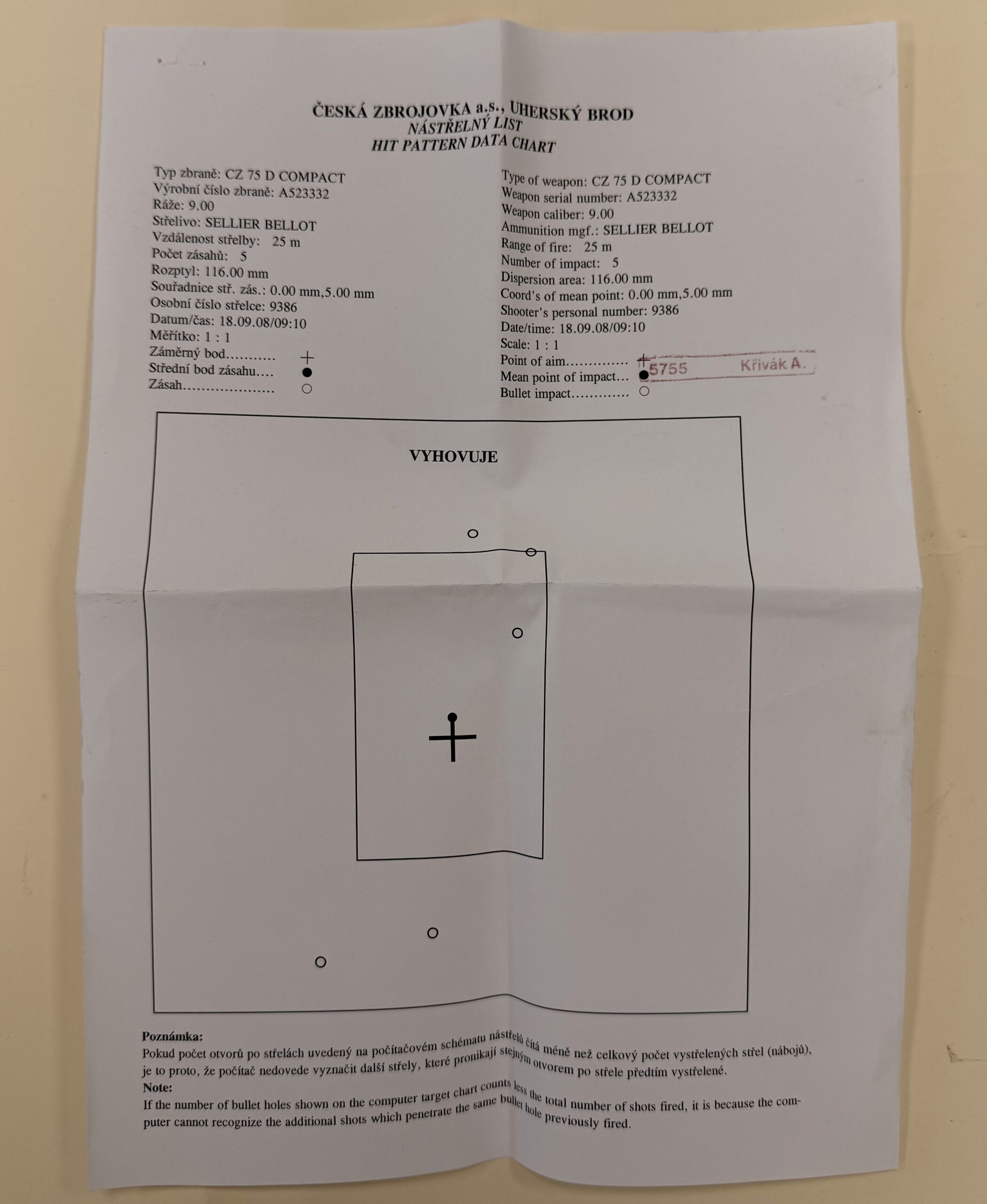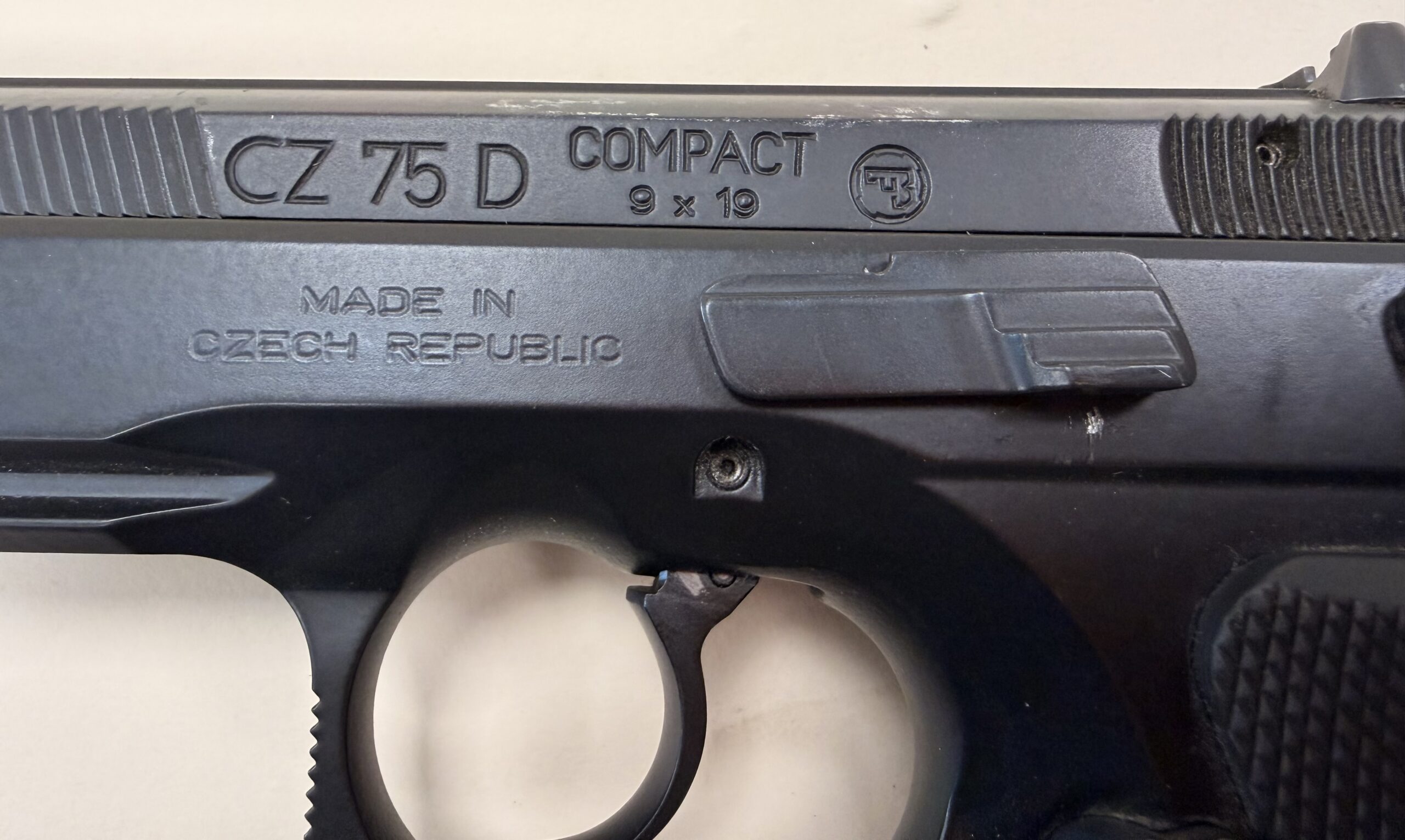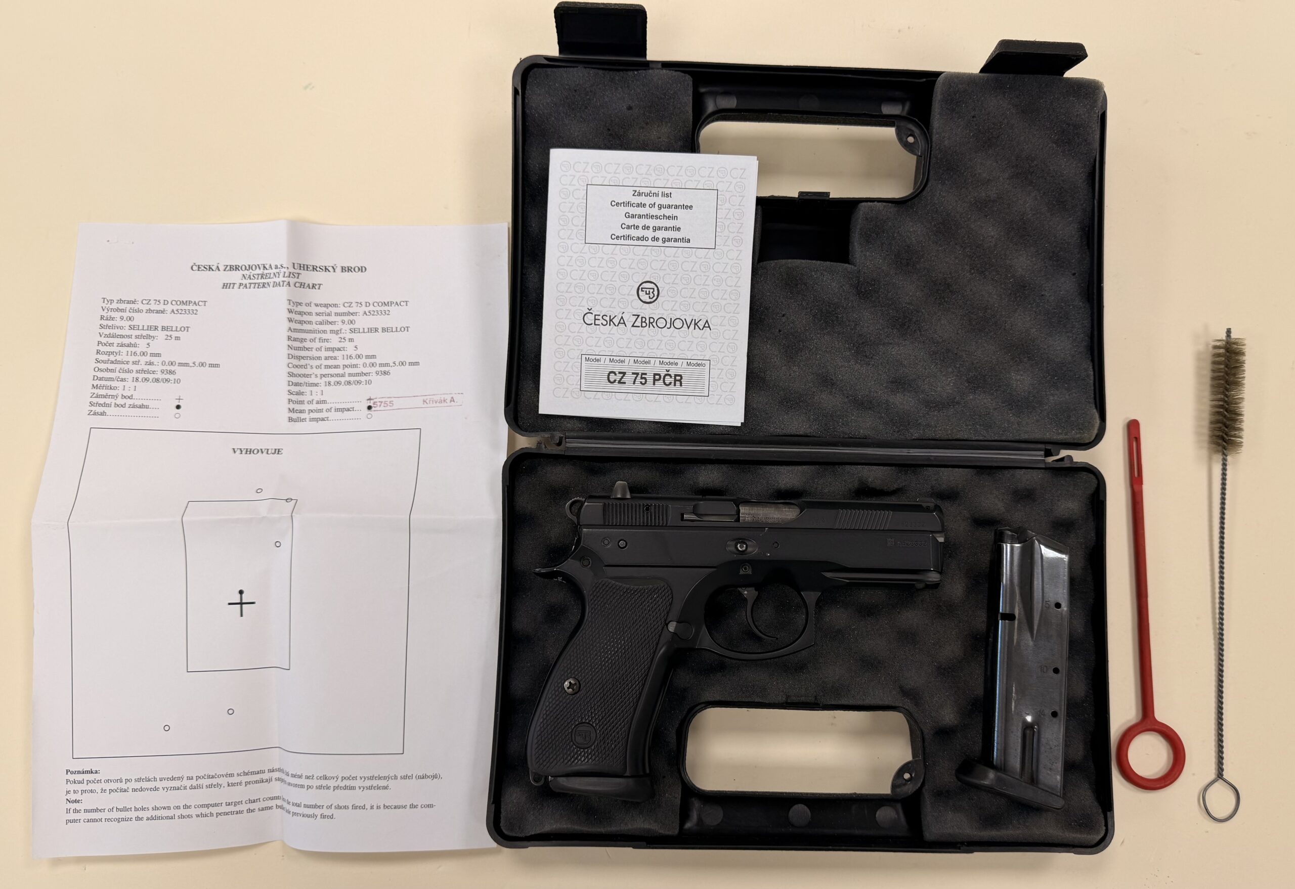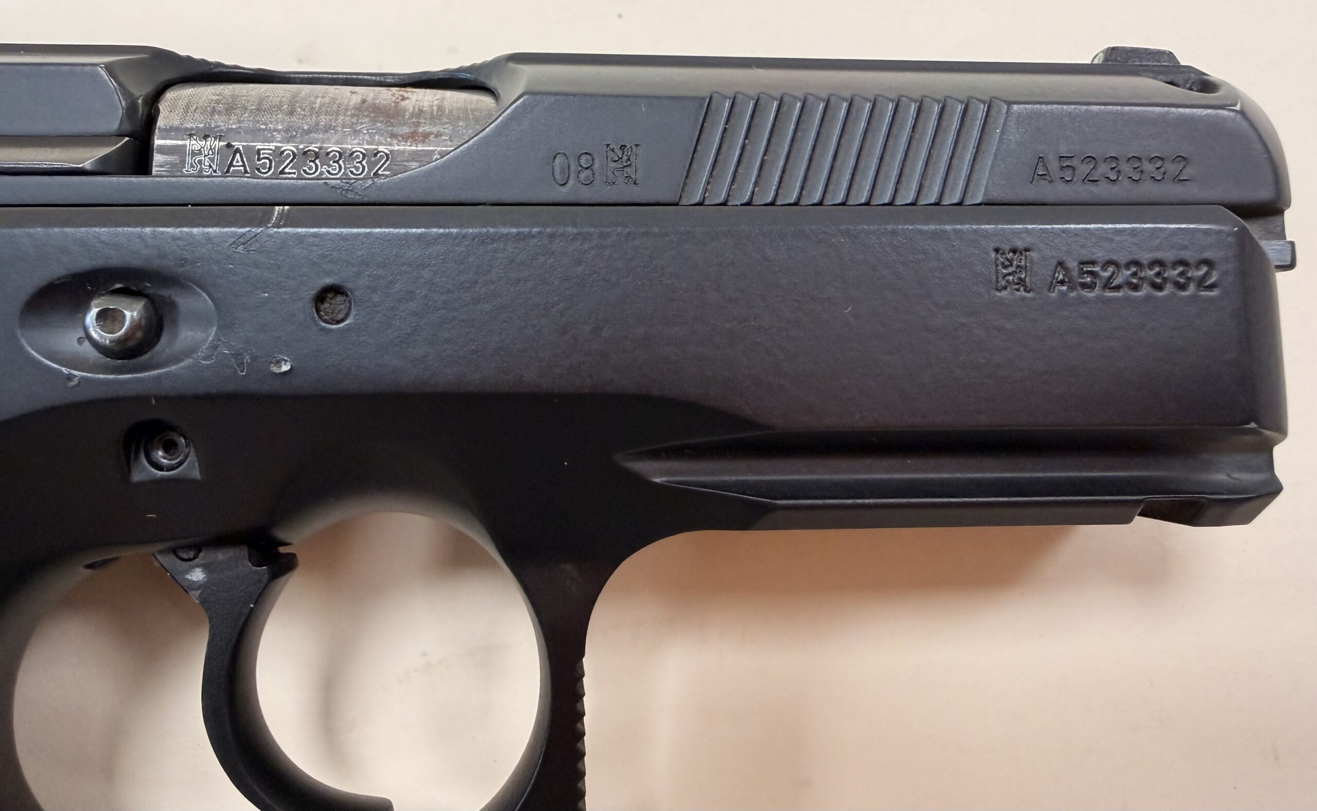 Czechoslovakian CZ75D pistol chambered in 9mm Luger (9x19mm), serial number A523332.