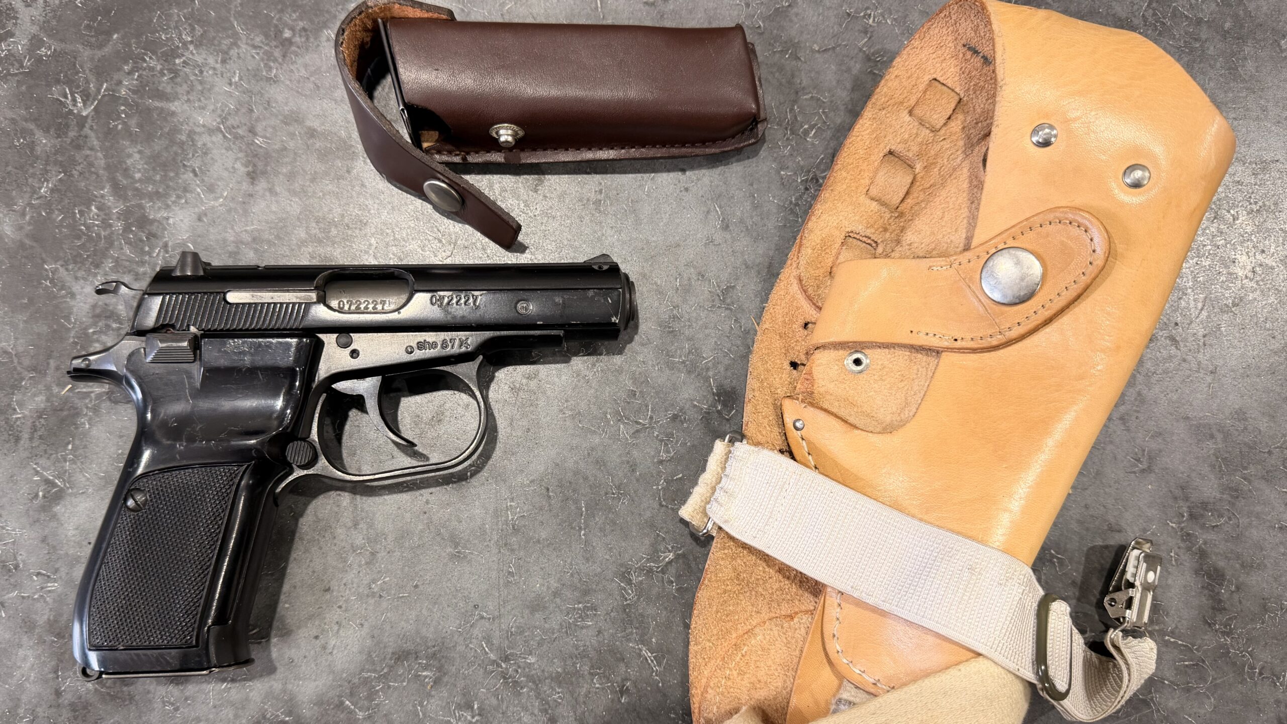 The pistol is 100% functional and comes with two 12-round magazines, a free holster, and one magazine pouch. The import mark is located on the rear strap of the frame, underneath the hammer.