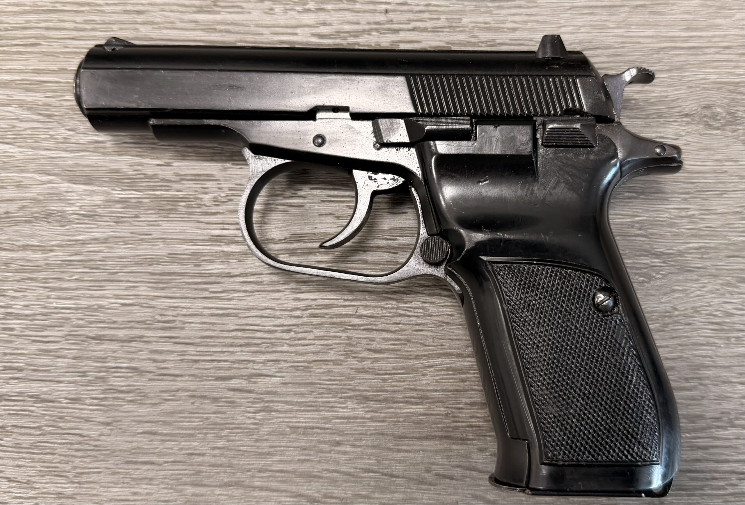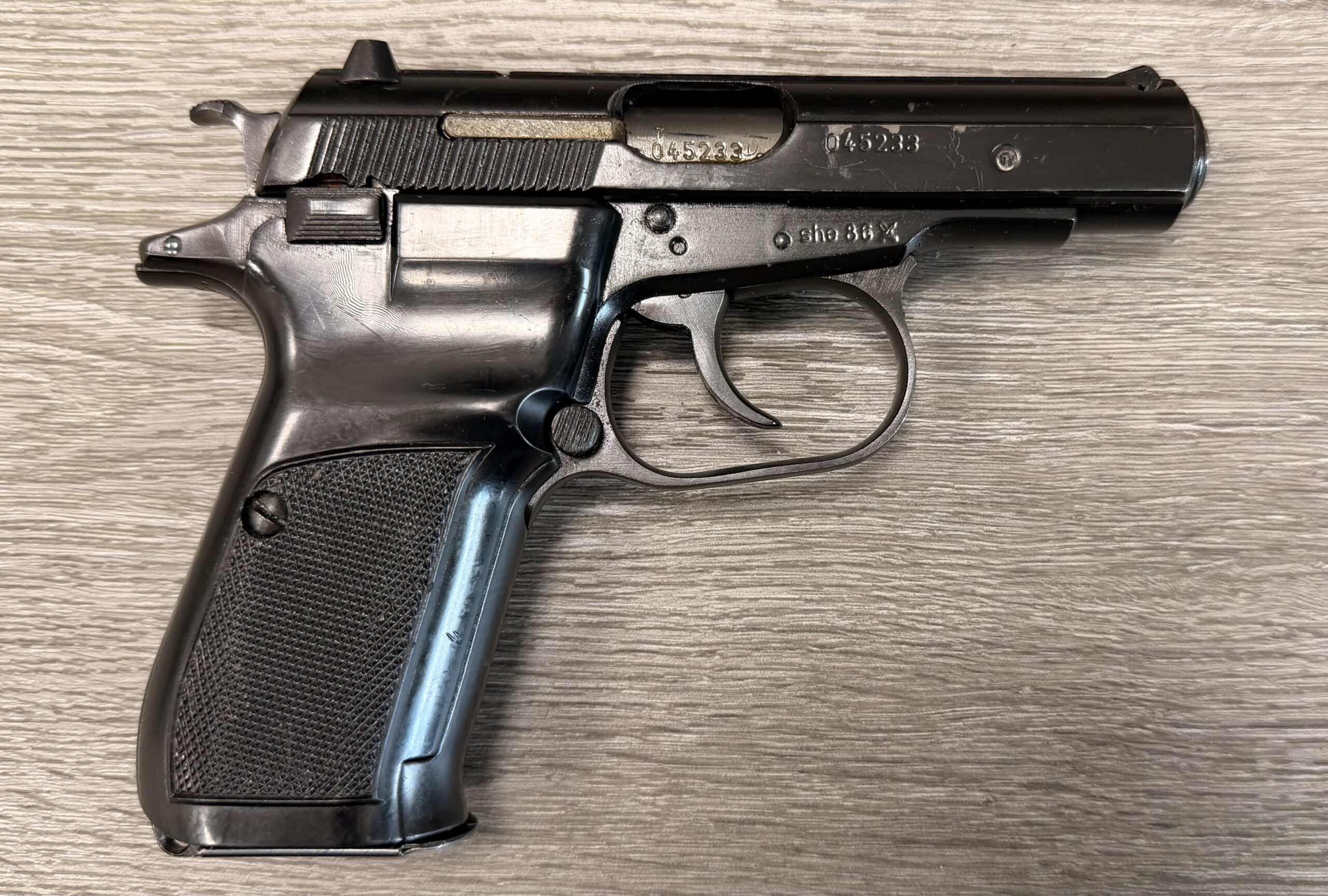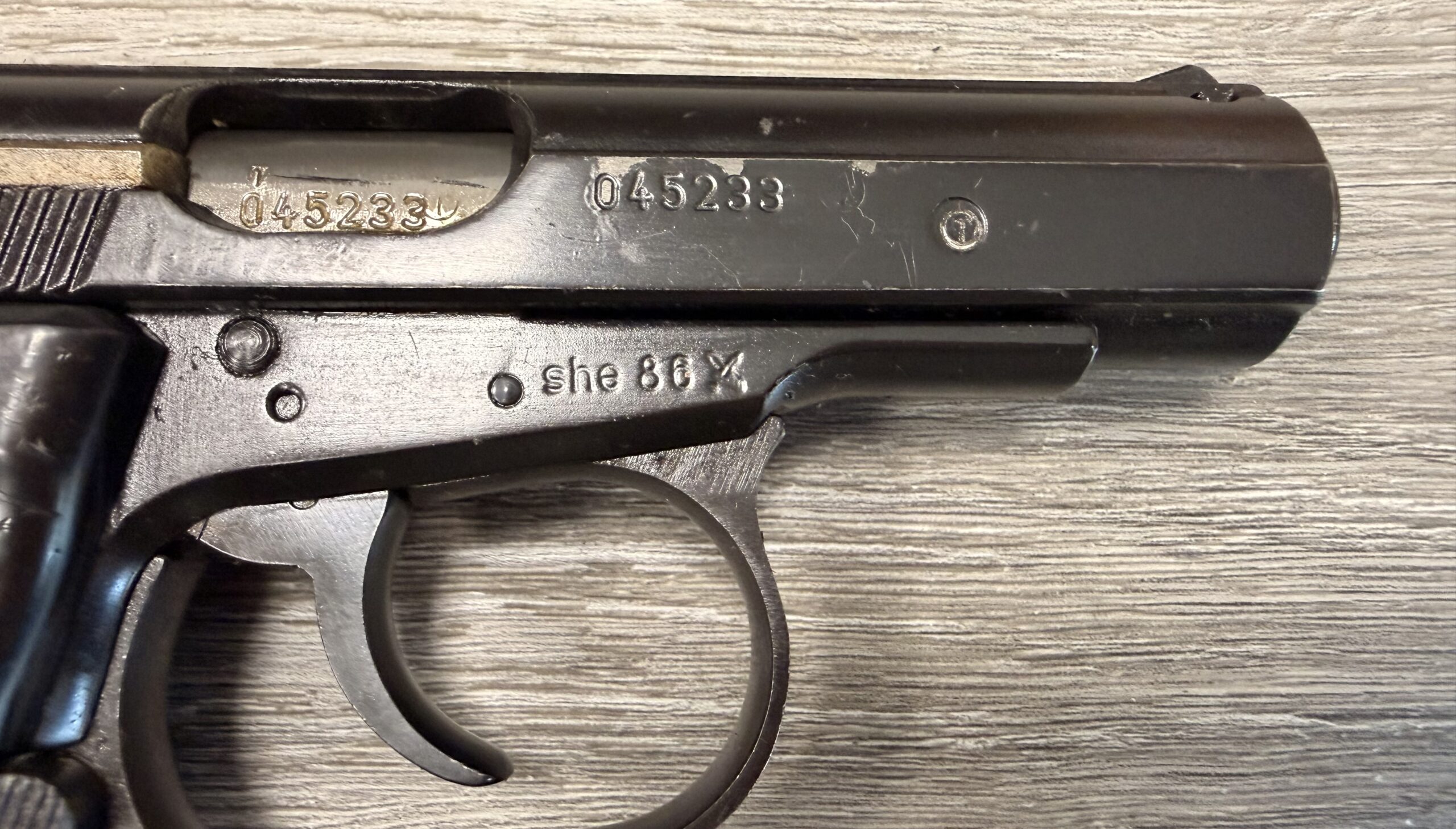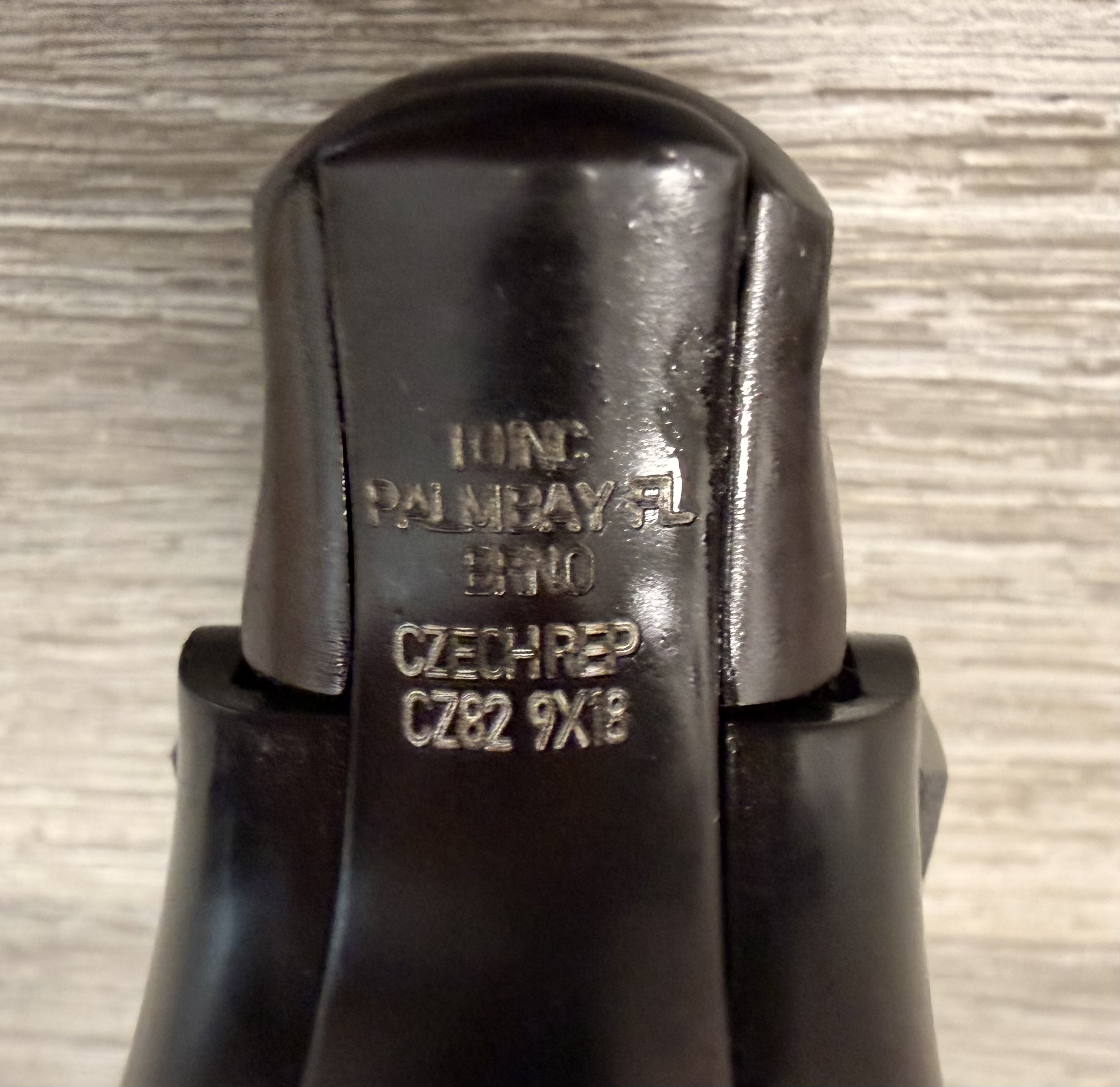 CZ82 Pistol with FREE original leather holster, 9×18 Makarov. This pistol is in very good condition. The grips are also in very good condition with no cracks. The bore is in very good condition. The pistol is numbers matching frame and slide. The pistol is 100% functional and comes with one 12 round magazine. The pistol is import marked on the rear strap underneath the hammer on the frame.