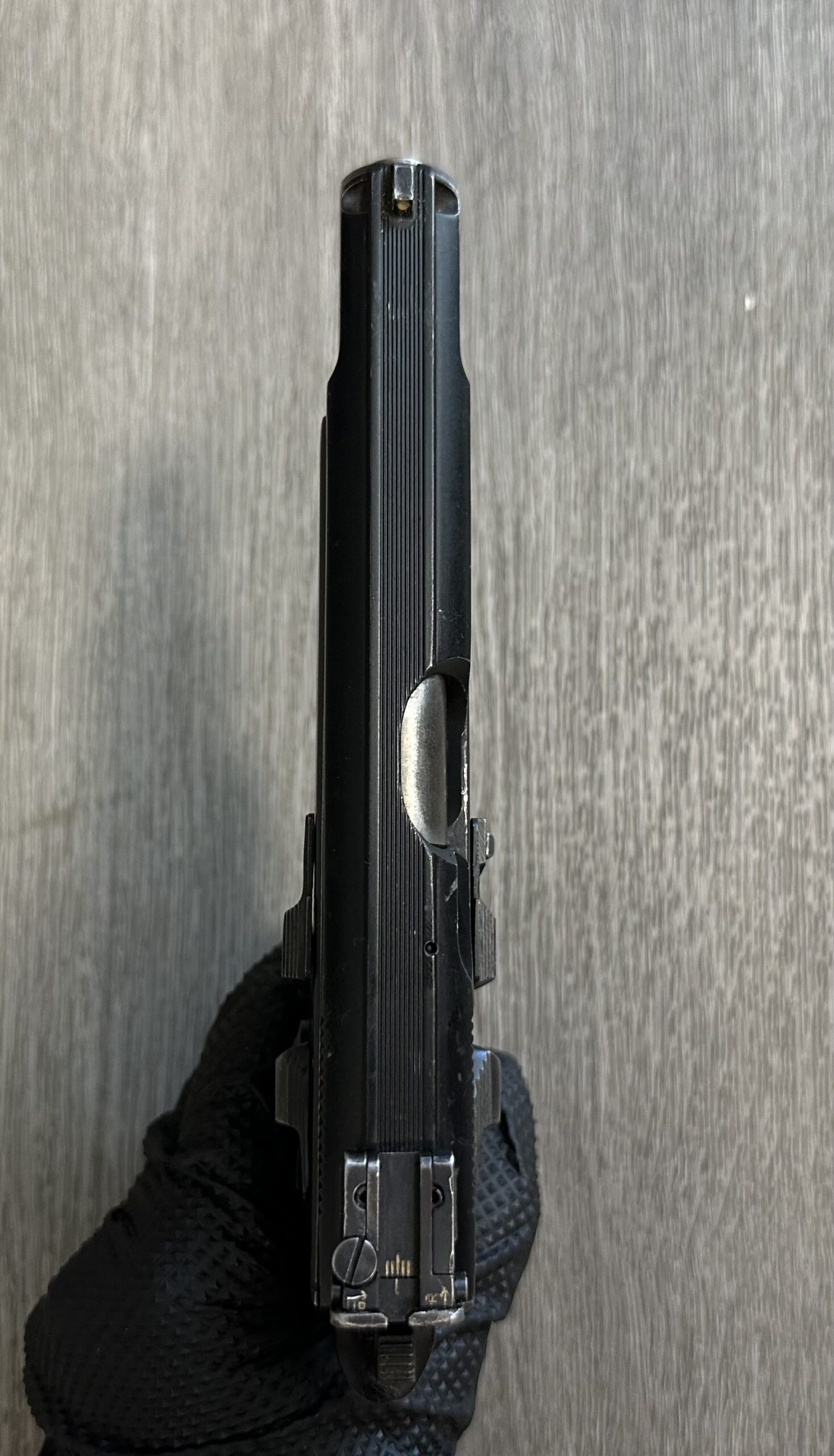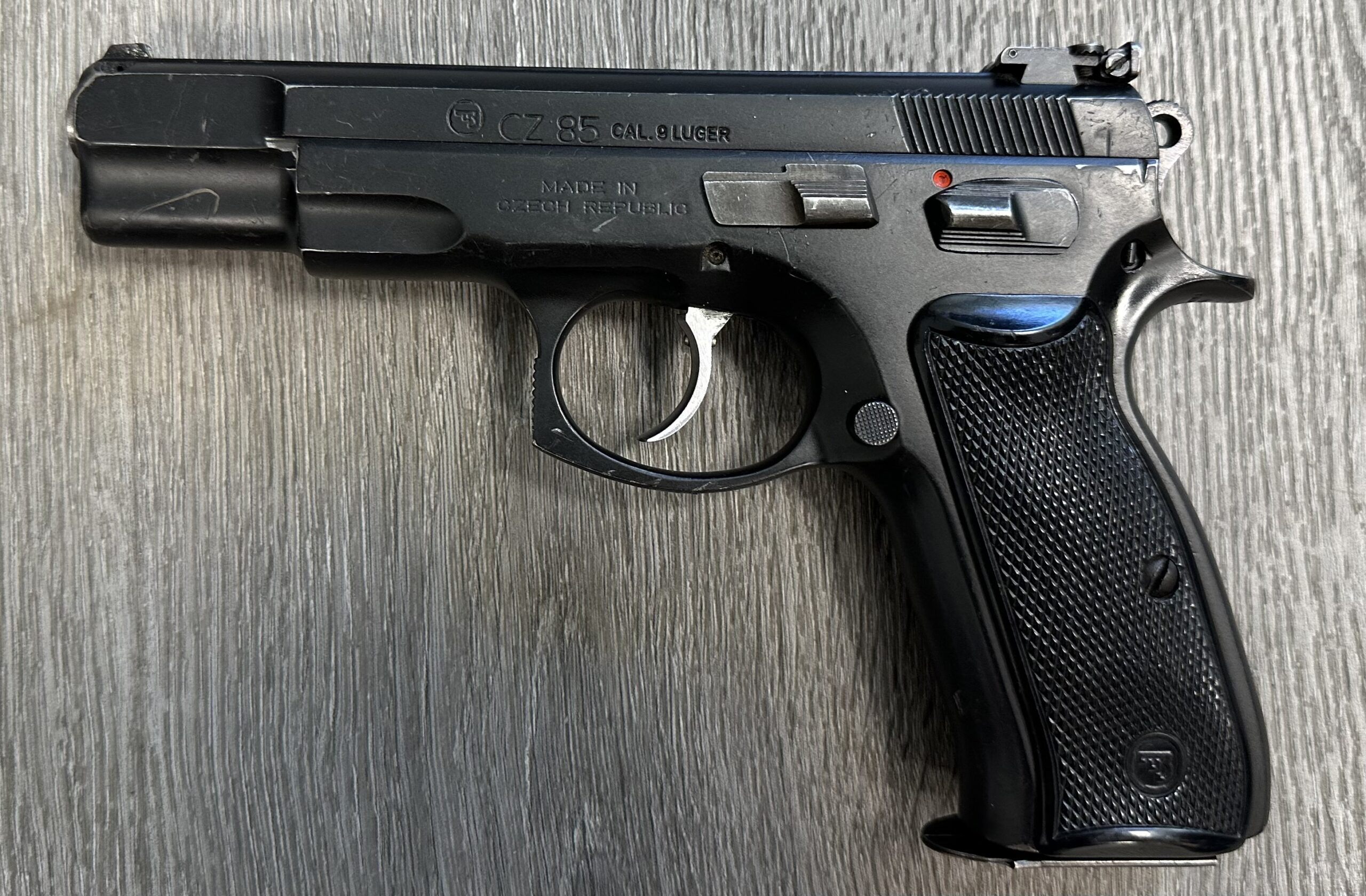 Czech CZ85 pistol chambered in 9MM Luger, serial number D4456. This pistol is in very good condition, with minimal surface wear. The grips are also in very good condition with no cracks. The bore is very good with strong grooves. The pistol is numbers matching frame and slide. The pistol is 100% functional and comes with one magazine. This firearm is equipped with an adjustable target sight. The pistol is import marked on the rear strap underneath the hammer on the frame.