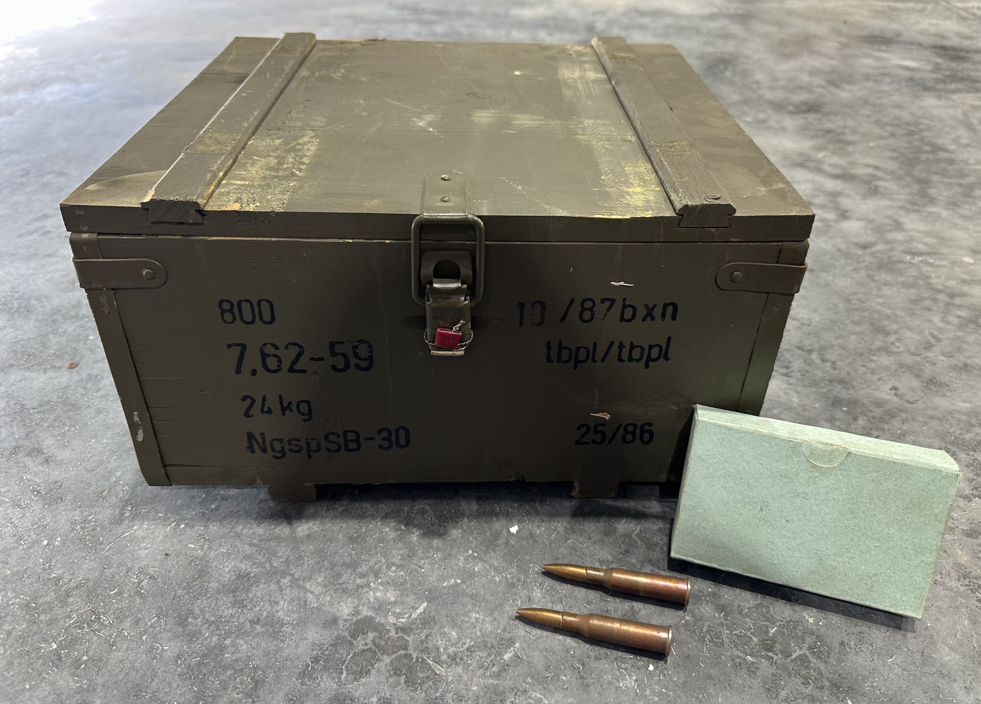 Each tin can is sealed from the factory, as a result the ammunition is extremely well protected from moisture, corrosion, etc. Perfect for long term storage! Please note: These crates are marked “7.62-59”. This is the Czech military designation for 7.62x54R. This ammunition is 7.62x54R caliber.