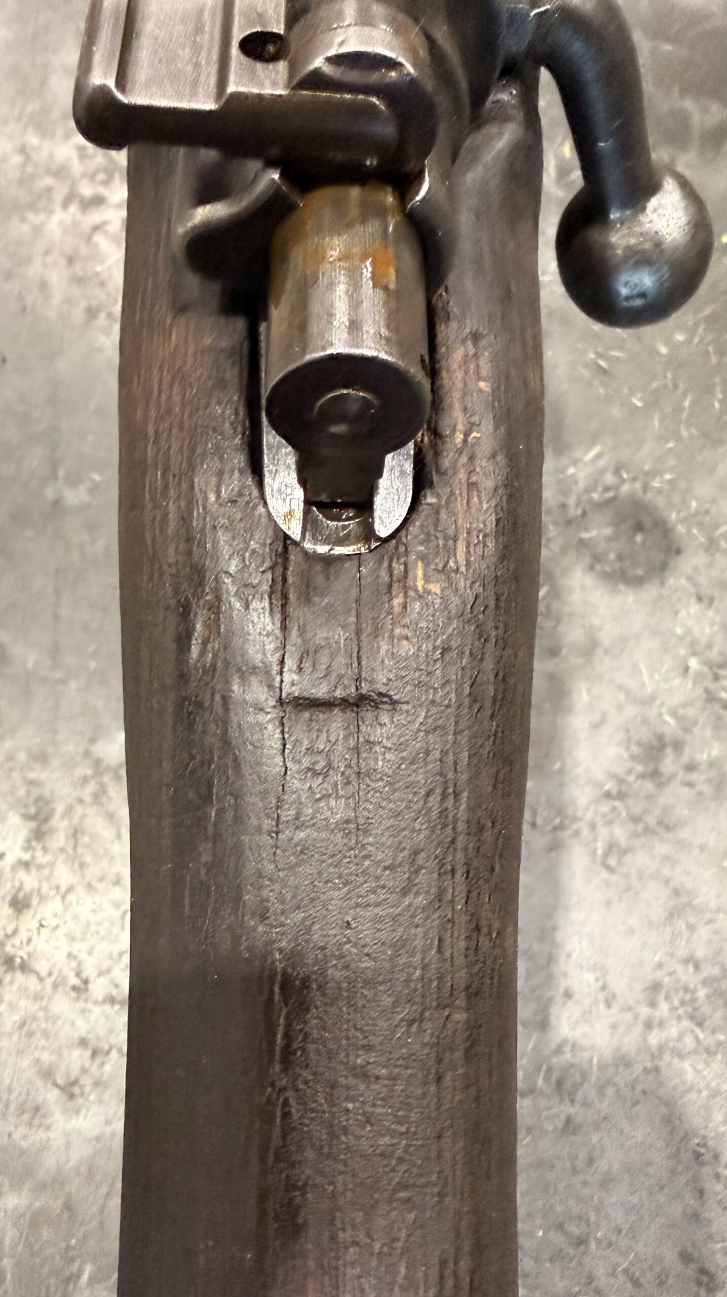 The metal finish is in good condition, and the wood stock is in very good condition, showing typical handling wear, including dings and scratches consistent with use. Please note there are two small cracks behind the receiver at the wrist.