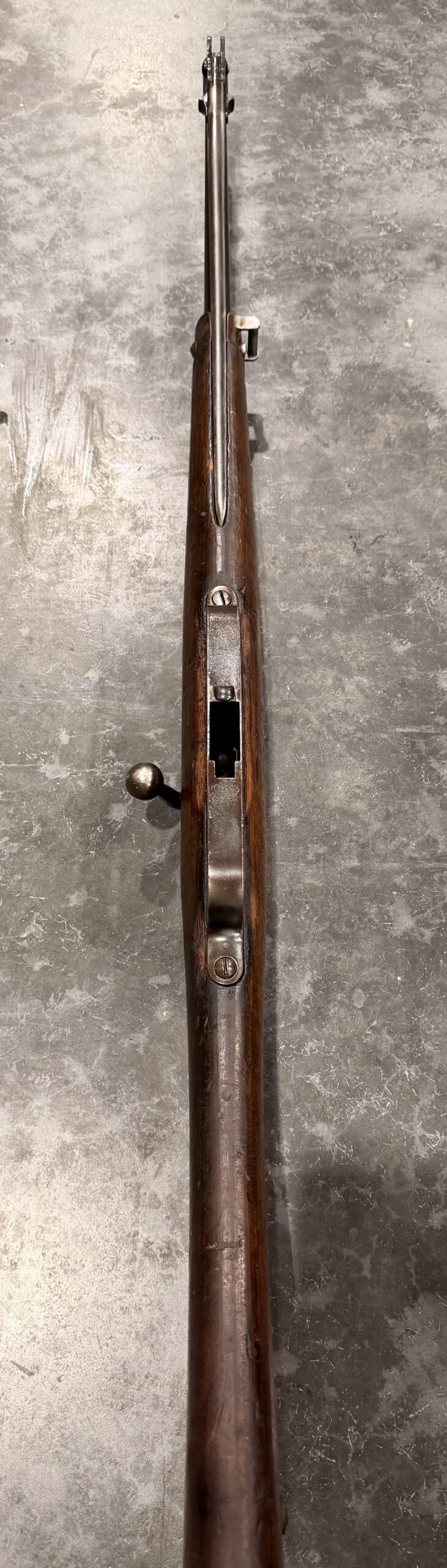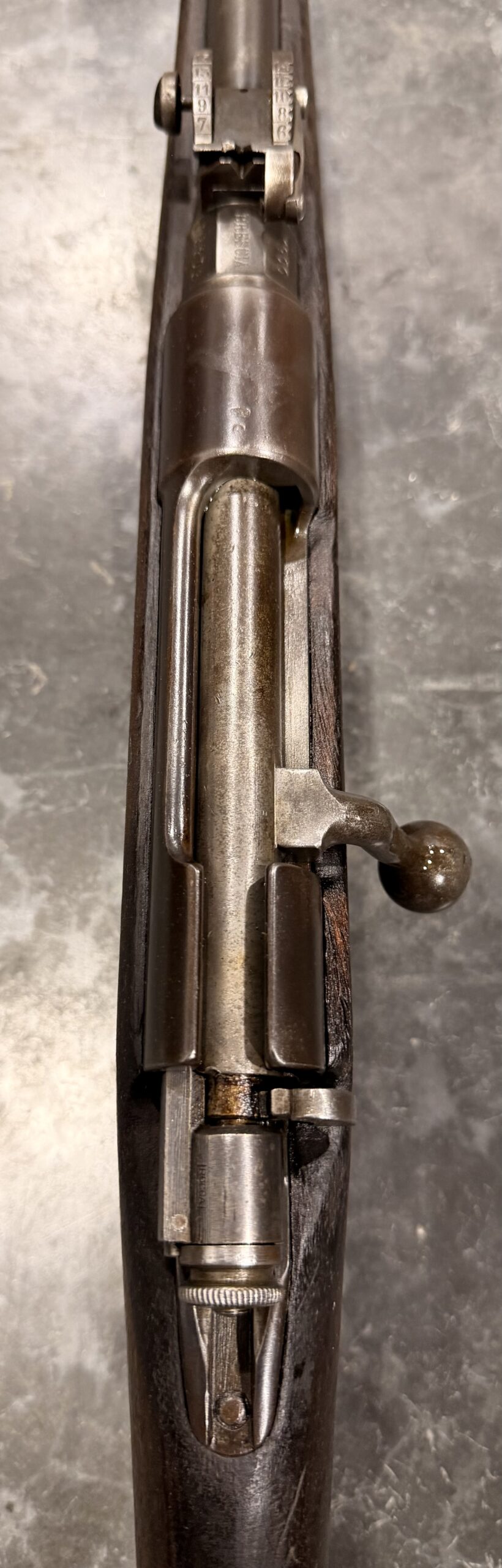 This early-configuration 1891 Carcano Cavalry Carbine is chambered in 6.5×52 and retains its original finish. The inside of the receiver is in the white, which is correct for early carbines.