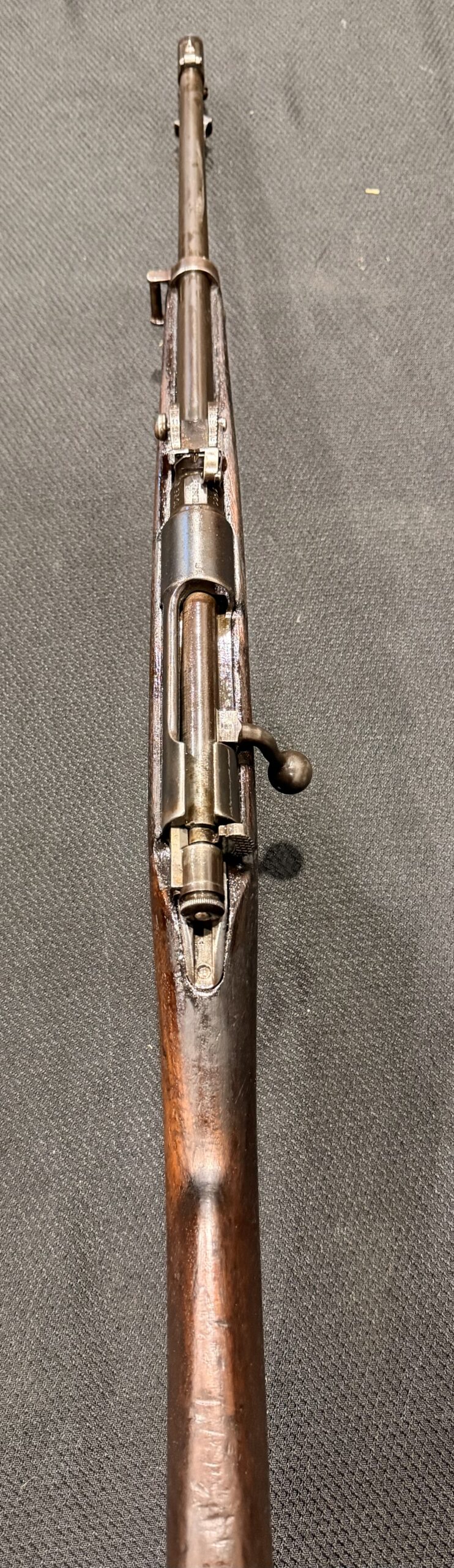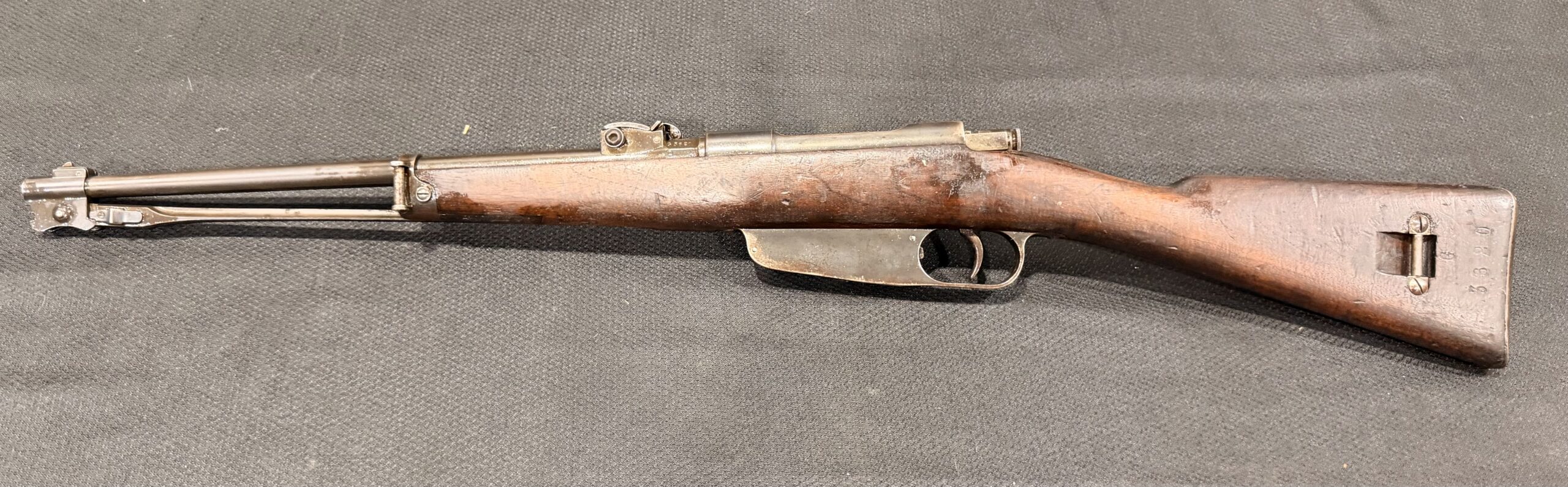 This early-configuration 1891 Carcano Cavalry Carbine is chambered in 6.5×52 and retains its original finish. The inside of the receiver is in the white, which is correct for early carbines.