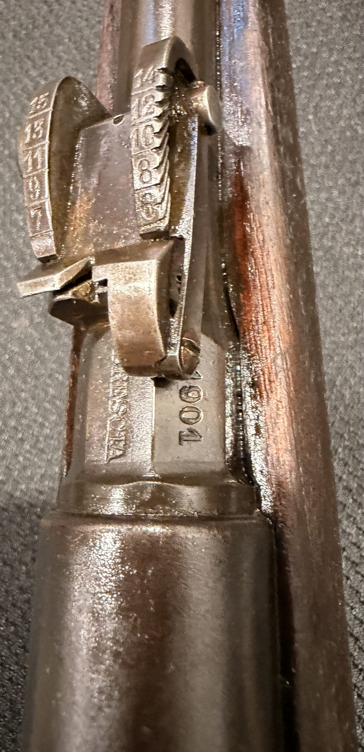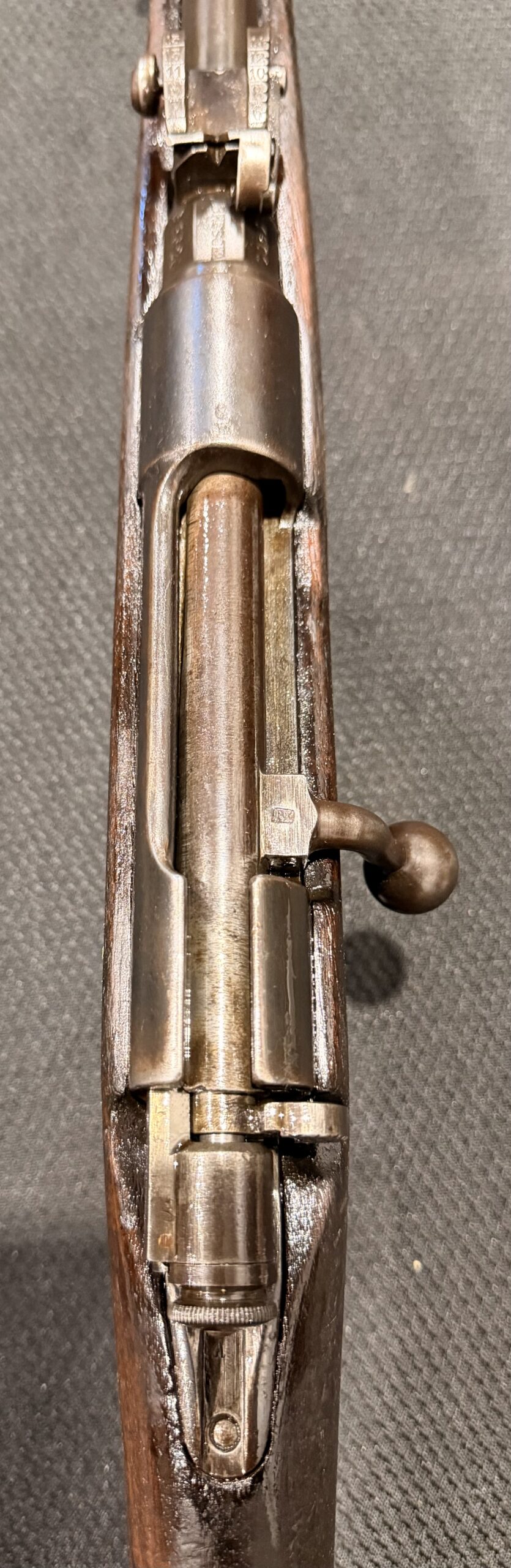 The bore is in good condition. The wood stock is in good condition with typical handling wear, including dings and scratches. Please note that there are two very small chips on the front underside of the stock near the bayonet.