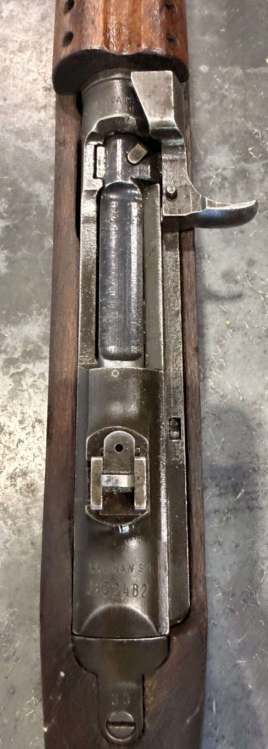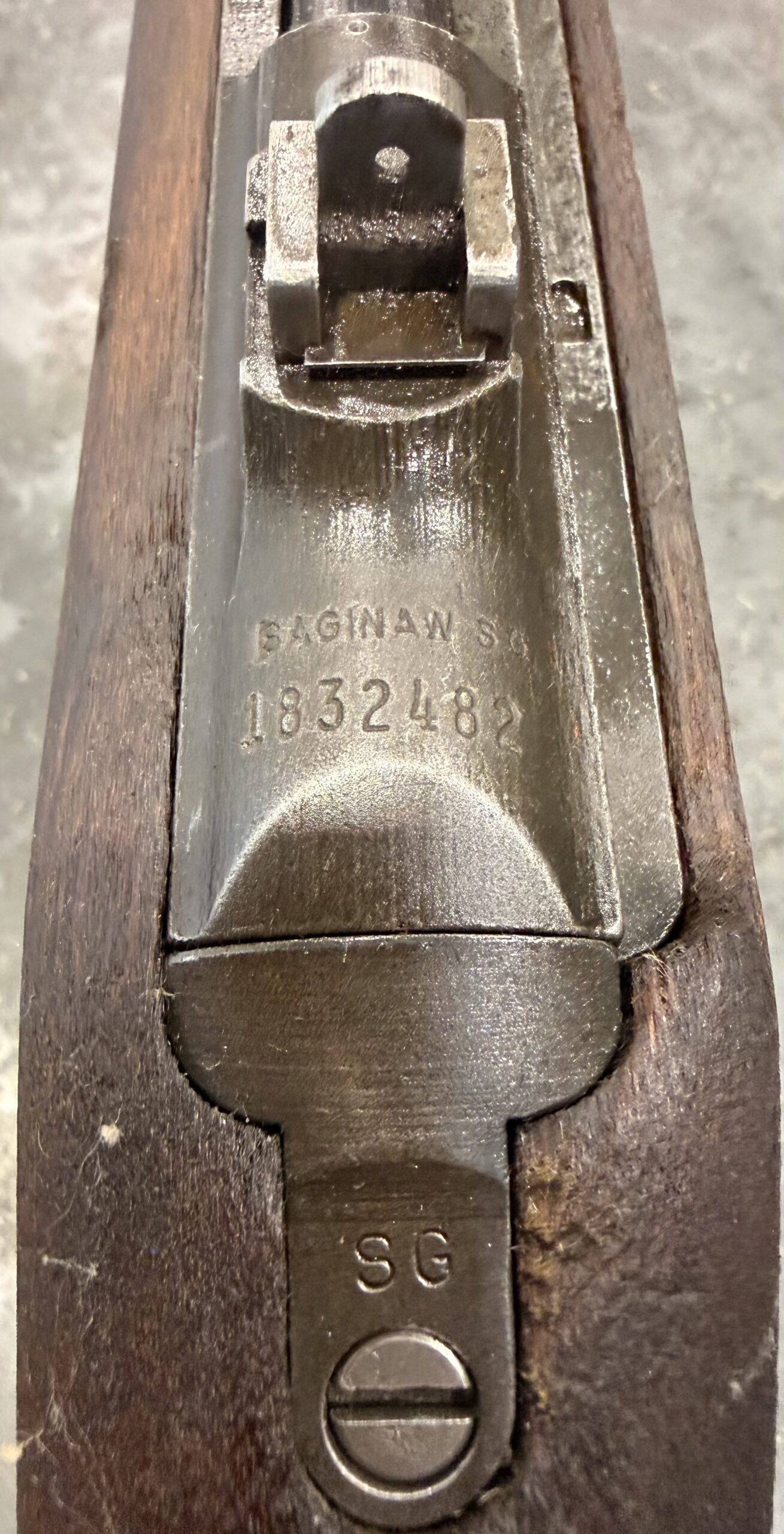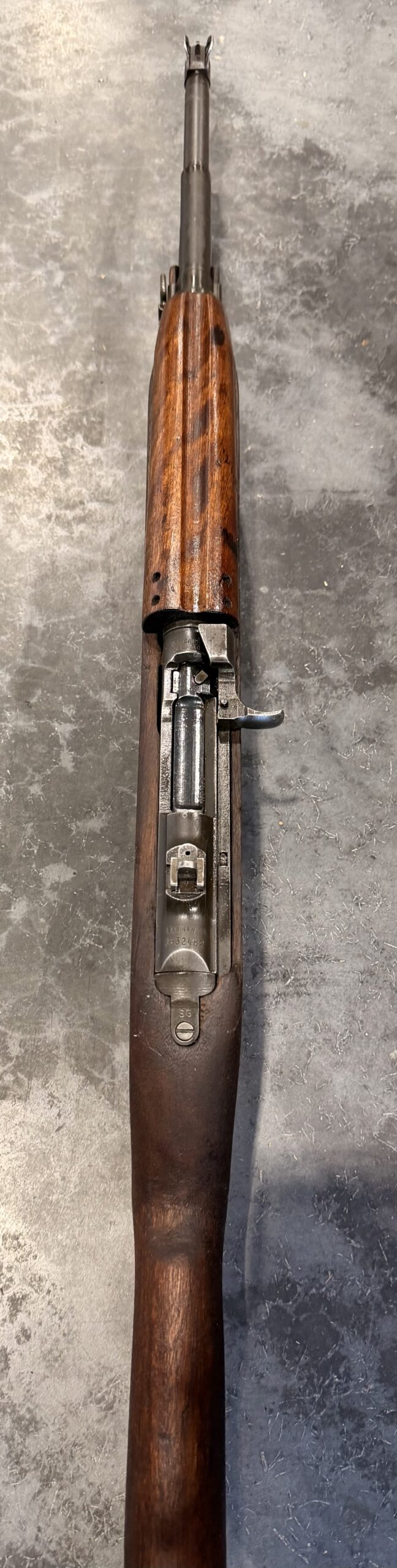 This example retains its Type 1 rear sight, Type 3 front barrel band. The receiver, barrel, and trigger group are in very good condition, and the stock is in good condition. The bore gauges at 2.0 and is in good, serviceable condition.