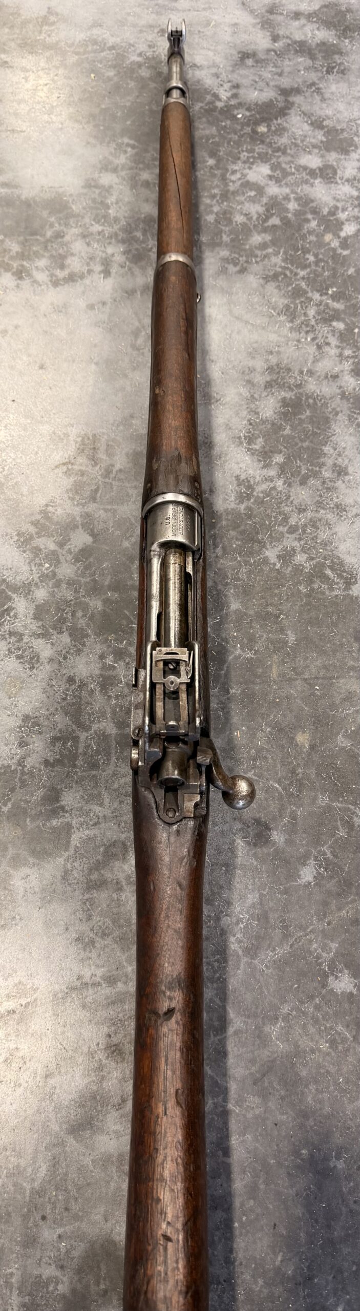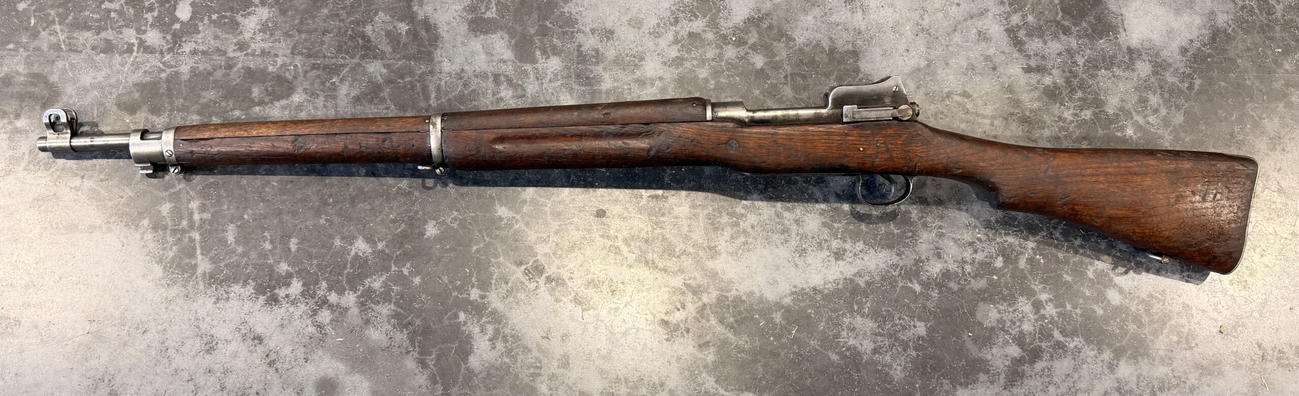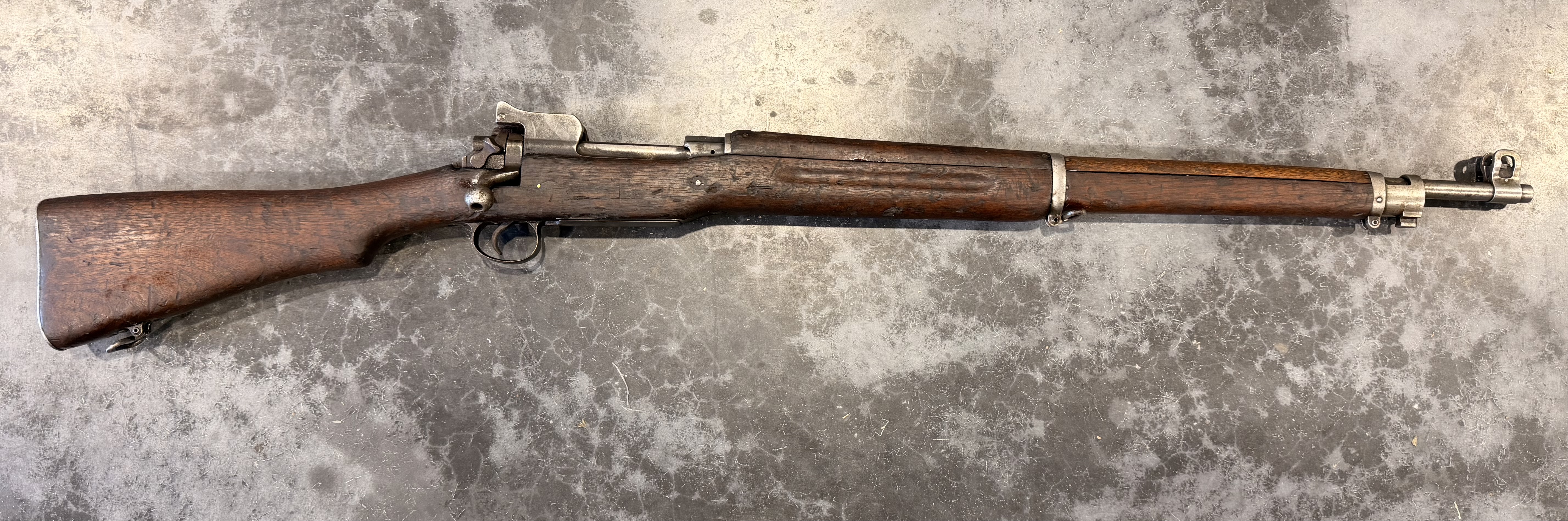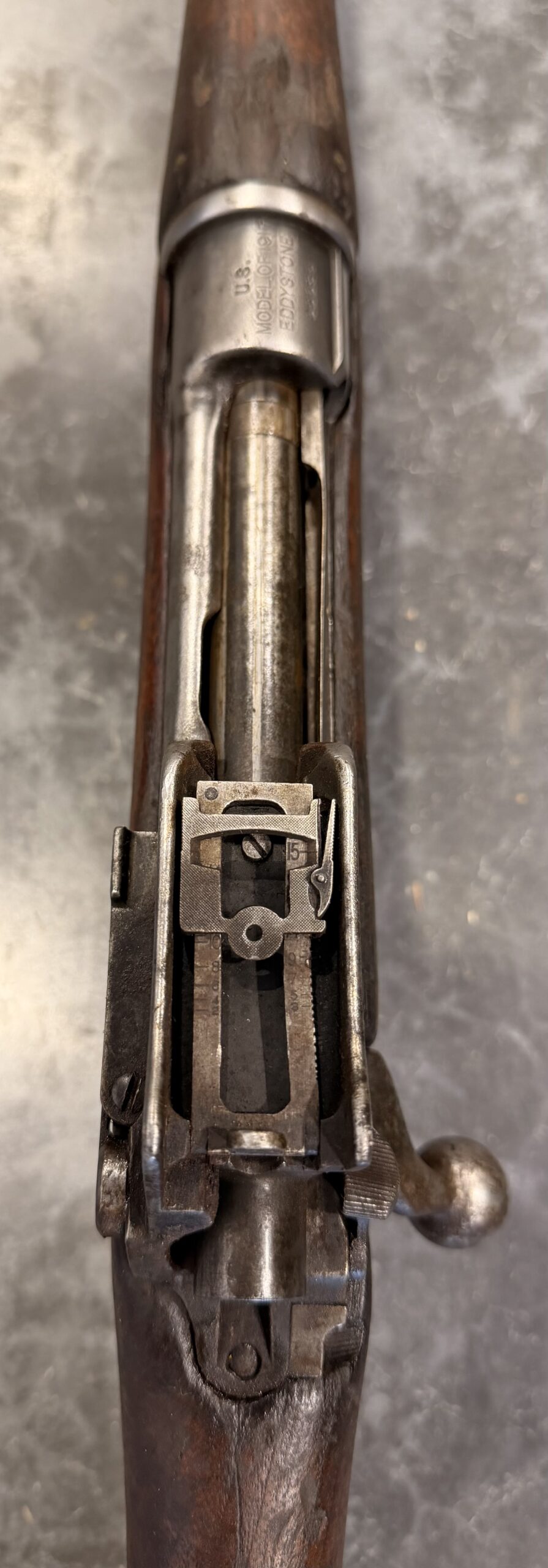 This rifle was manufactured by Eddystone. The bore is in poor condition. The barrel is Winchester-marked and dated 8-19. The rifle is complete and functional. Please note that the rear sight ladder is slightly bent.