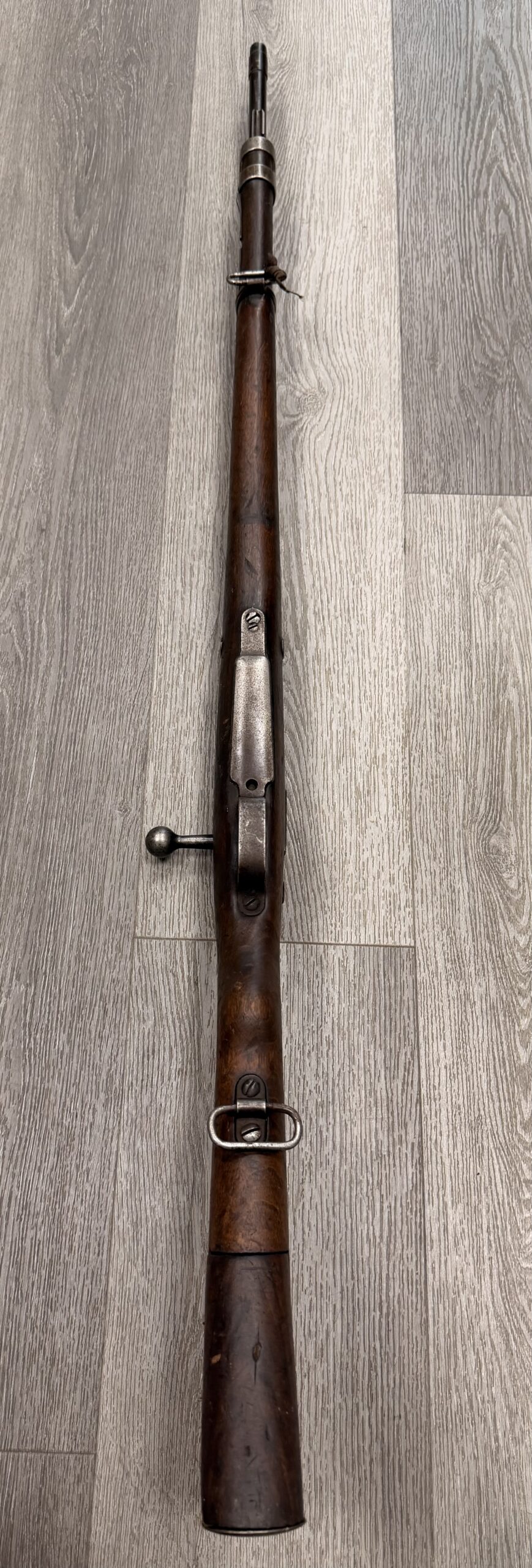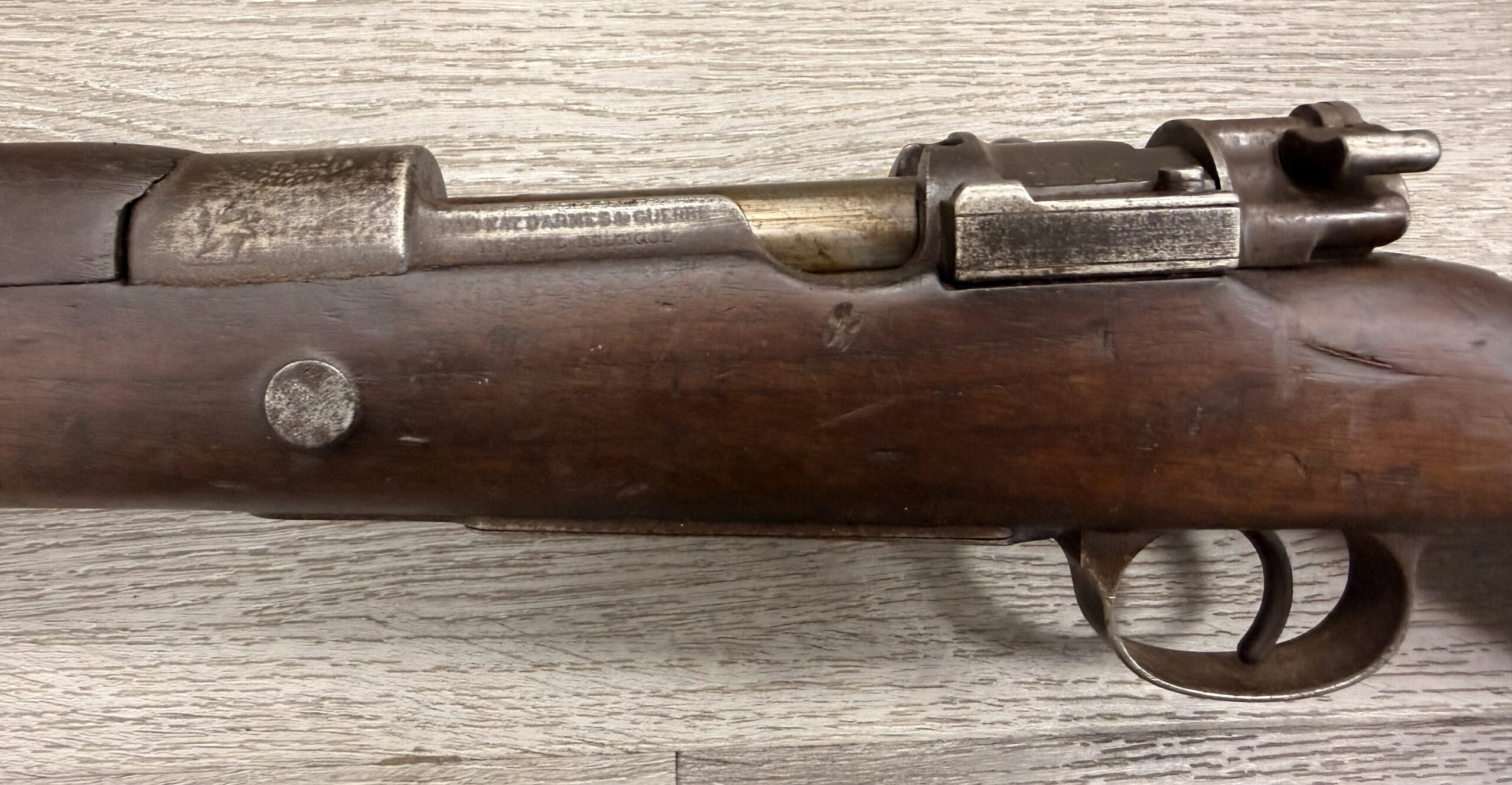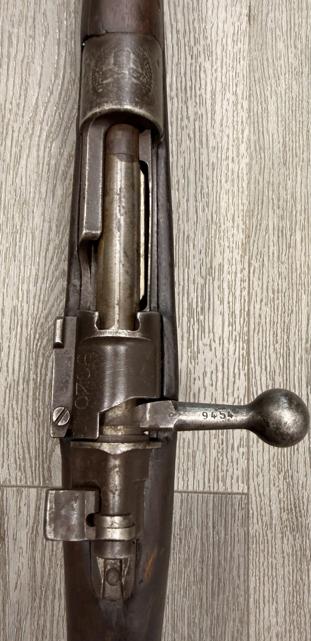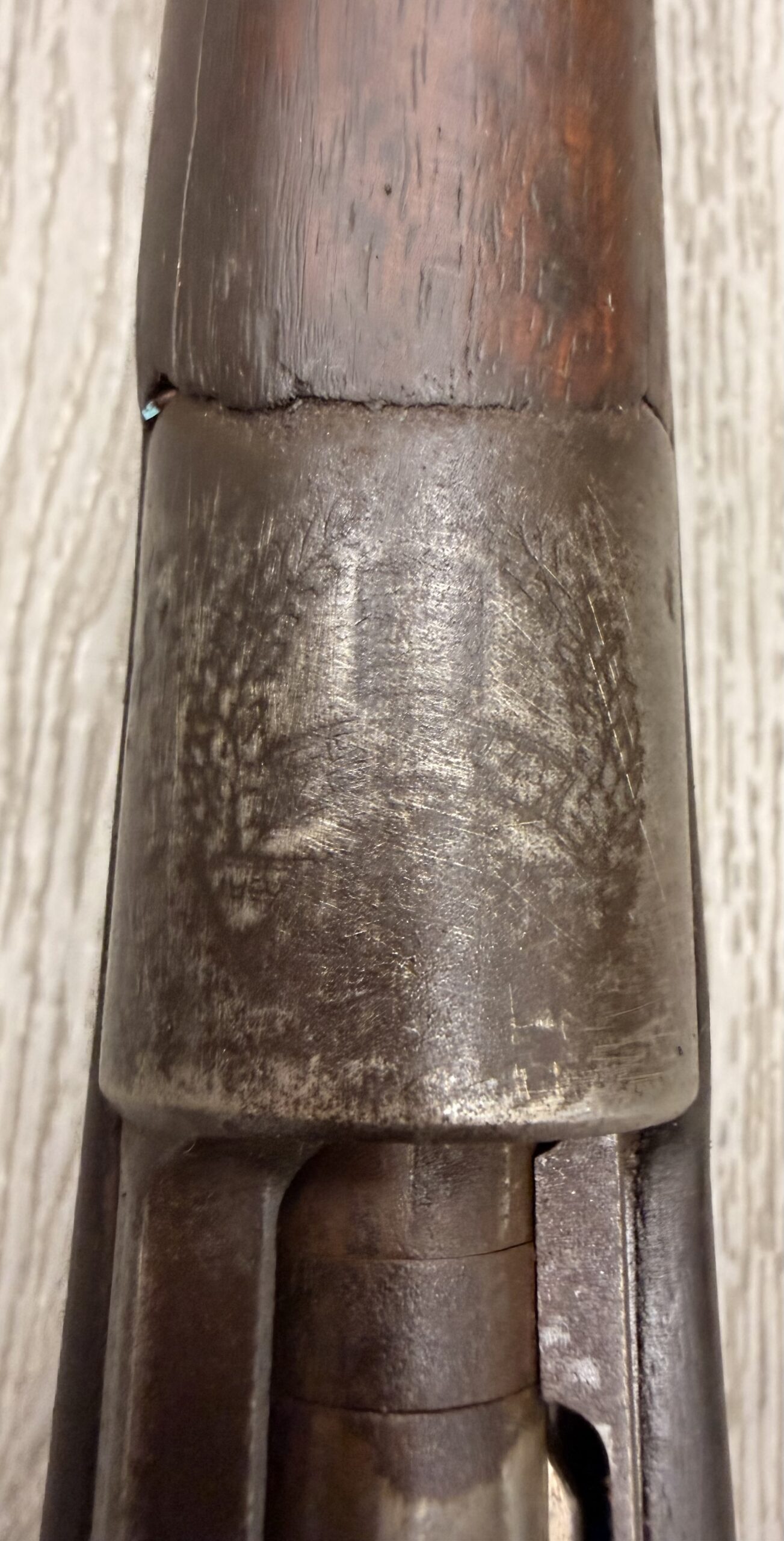 The bore is in poor condition. The metal finish is fair, and the wood is in fair condition, showing typical handling wear such as dings and scratches from regular use. Please note there is a stock repair section near the buttplate that is not fully attached to the rifle. The rifle has passed a basic function test.