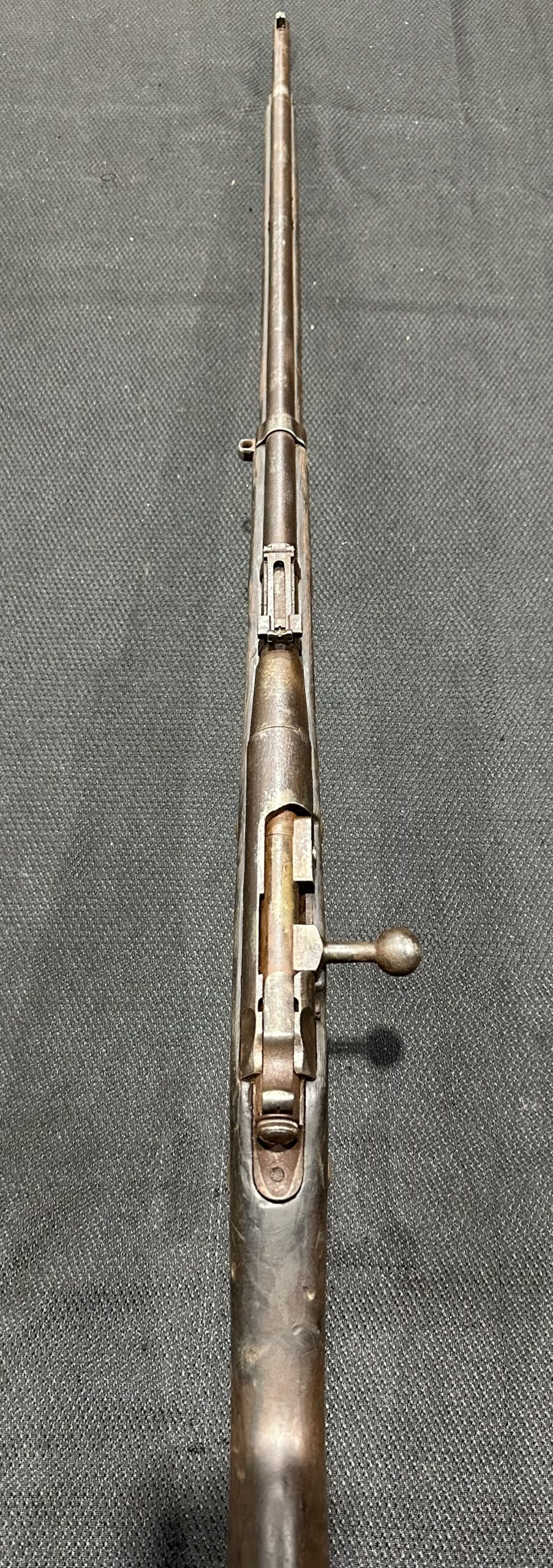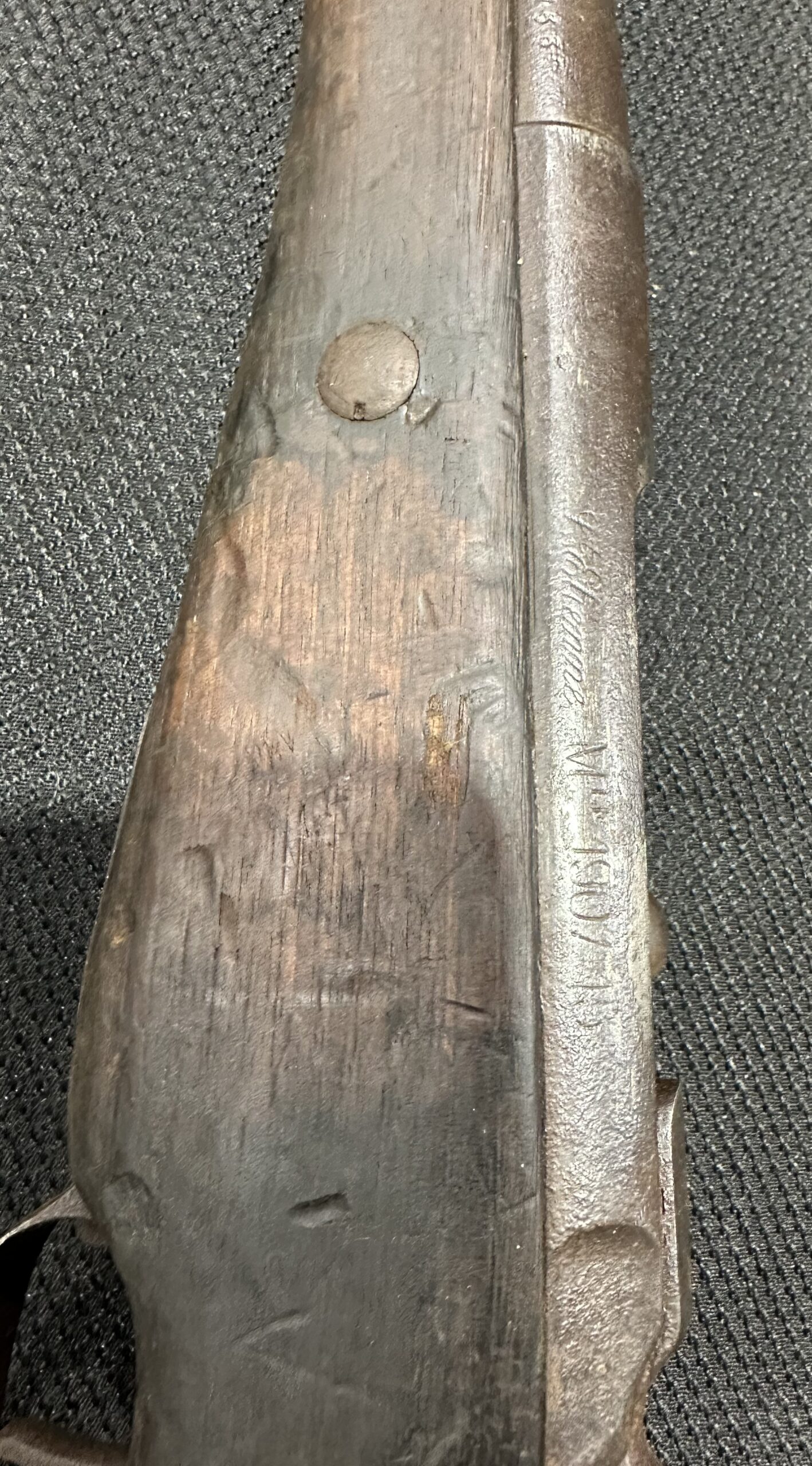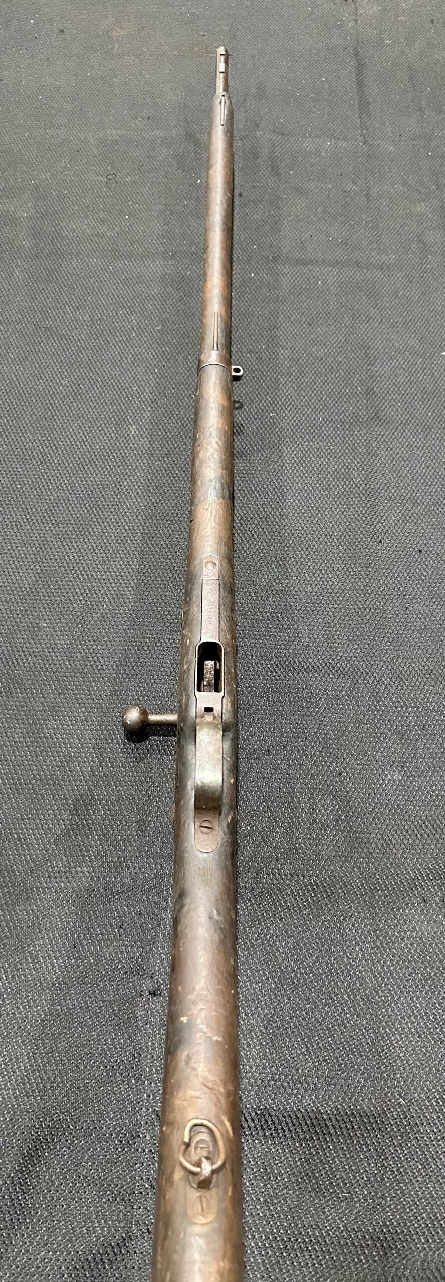 The finish on this rifle is fair, with some markings that are not clearly visible. The bore is in poor condition. The wood is in good condition, showing handling wear, dings, and scratches from typical use. Please note there is a small crack in the buttstock, and some rust and pitting are present on the metal. The front barrel band is missing. Please see the detailed photos above for more information.